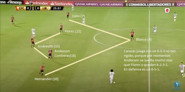 1°: La ausencia de Campuzano y la chance de Capaldo. Con 2 amarillas parecía arriesgado poner a Jorman, con la chance de perderlo para Octavos de final. Esta ausencia puede resentir mucho el funcionamiento del equipo en su primer pase y salida, algo que se necesitará para romper el bloque defensivo del Caracas. Su reemplazo será Nico Capaldo, aunque seguramente sea Pol Fernández quien tenga que retroceder más para ser salida. Es una buena ocasión para ver si Pol puede asumir mas protagonismo y si Nico Capaldo puede cumplir con esa función. Intensidad, recuperación y velocidad le sobran para jugar ahí, solo hay que ver como responde sin tanto orden, ni primer pase.