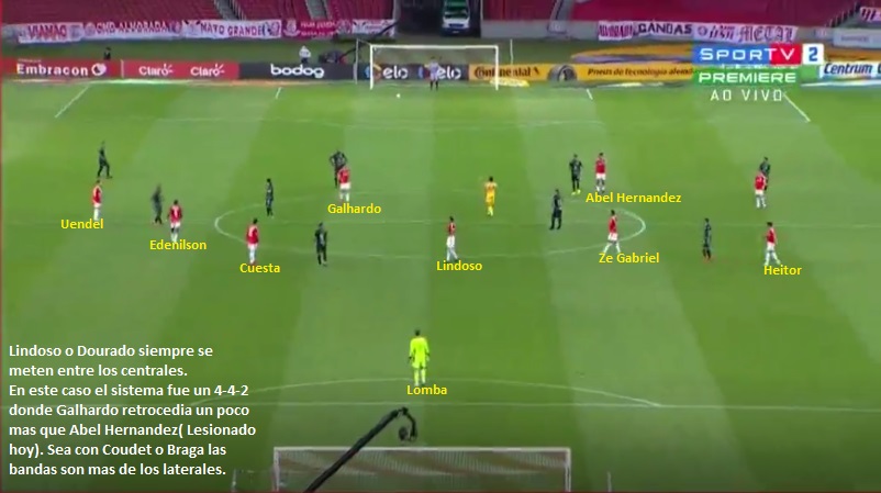 ¿Como formará el equipo de Abel Braga? Muchas dudas en la conformación del equipo. Poco ha quedado del 4-1-3-2 de Coudet. Después de los 2 primeros encuentros respetando el sistema que se venía ejecutando. La lesión de Abel Hernández, le permitió al experimentado entrenador, apostar por su sistema preferido: el 4-2-3-1. Los nombres aún no están del todo claros, para el nuevo técnico. Víctor Cuesta (2do central) y Rodinei (Lateral derecho) serán ausencias obligadas por acumulación de amarillas. Seguramente Heitor (Titular con Coudet) y Rodrigo Moledo (Central histórico de Inter), sean sus reemplazos. Edenilson uno de los motores del mediocampo, es baja de ultimo momento por COVID. Una baja demasiado importante. Thiago Galhardo, que con Coudet compartía delantera con otro punta, ahora paso a ser la única referencia de ataque. En el mediocampo es donde están las mayores dudas. Rodrigo Dourado(Que venia entrenando diferenciado por un golpe, pero parece que esta mejor), Rodrigo Lindoso y Patrick parecen fijas. Los otros 2 lugares pueden ser para cualquiera y hay muchos aspirantes: Nonato y Mauricio corren con ventaja, pero D’Alessandro, Marcos Guilherme o Yuri Alberto pueden ganarse un lugar. Un Probable: Marcelo Lomba; Heitor, Rodrigo Moledo, Ze Gabriel, Uendel; Rodrigo Dourado(C), Rodrigo Lindoso; Mauricio, Nonato o Yuri Alberto, Patrick; Thiago Galhardo. También podría optar por un 4-4-2 con Yuri Alberto compartiendo delantera con Thiago Galhardo. El pasado fin de semana apostó por un 4-3-1-2 con Jonnhy ( Lesionado), Lindoso, Patrick; D Alessandro (enganche), Yuri Alberto y Thiago Galhardo. En lo que va del año el equipo Gaúcho ha perdido varios jugadores con lesiones importantes. Paolo Guerrero, Renzo Saravia y Gabriel Boschilia estarán fuera por mucho tiempo.