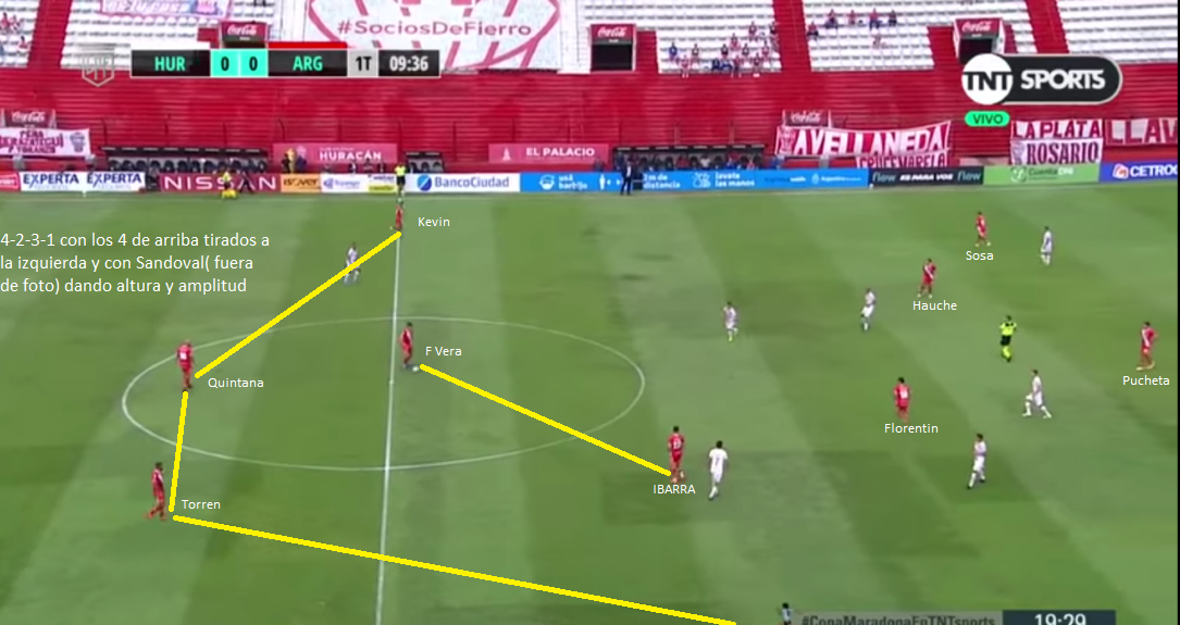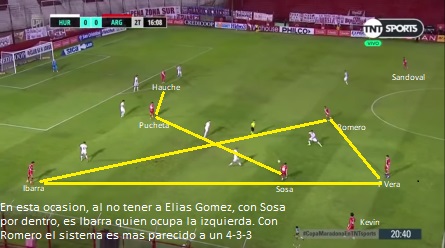 En cuanto al estilo del Bicho, nos encontraremos con un equipo que siempre quiere ser corto. Poca distancia entre sus líneas. Muchas veces podemos ver a Torren y Quintana en la mitad de la cancha jugando mano a mano, lo que permite ejecutar muy bien una presión alta. Los rivales que intentan salir de abajo lo suelen sufrir. Si superan esa presión, ahí si hay un repliegue hacia bloque bajo, en donde casi todos los jugadores se involucran. El punta más adelantado (Pucheta), es el encargado de presionar al central que tiene la pelota, pero si el pase va al otro central ya la presión esta a cargo del volante mas adelantado (Florentín). Igualmente, para ejercer esa presión Florentín debe esperar que Pucheta este mas cerca del 5 rival. Eso es cuando defiende más en bloque bajo. En fase de ataque, es un equipo que no tiene problemas en jugar bastante en largo. Esa obsesión por ser un equipo corto, le permite ser fuerte ganando la segunda pelota. Probablemente ese juego directo se resintió sin Santiago Silva ni Gabriel Avalos, pero aún sigue generándole problemas a los rivales. Los laterales son claves en el sistema. Tanto Sandoval como Elías Gómez son los encargados de dar la amplitud. Como mencionábamos hoy, a partir de ellos es que tanto volantes como delanteros, pueden tener libertad para ocupar cualquier posicion de ataque. Entre sus mejores jugadores podemos encontrar a Fausto Vera. El volante central ya es una fija en las selecciones juveniles y es buscado por algunos equipos europeos dispuestos a poner 7 u 8 millones de Euros por él. Un 5 muy completo con excelente ubicación, inteligencia táctica, buen pase largo y corto y ademas personalidad. Si maneja bien sus elecciones con respecto a su carrera, estará en la selección mucho tiempo. En el ataque el jugador clave es Gabriel Hauche. Su experiencia y su libertad para ocupar todo el frente de ataque, aun incluso arrancando como extremo, lo potencia. En un equipo donde todos los jugadores de ataque son jóvenes, tener un jugador como Hauche es importante. Otros de los jugadores claves son los centrales. Tanto Torren como Quintana son quizás los mas expuestos en este sistema, pero en general responden. Siempre con la defensa adelantada y preparados para ganar duelos. Cuando ellos pierden, el equipo queda descompensado. Quizás una de las grandes debilidades del equipo, es cuando los rivales superan la presión y atacan al equipo con la defensa tan adelantada. En encuentros anteriores ante el Xeneize, fue muy común ver como jugadores veloces como Pavón y Villa, quedaron muchas veces en zona de definición.