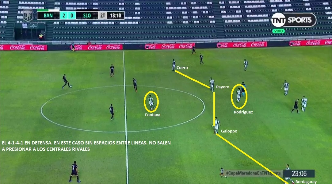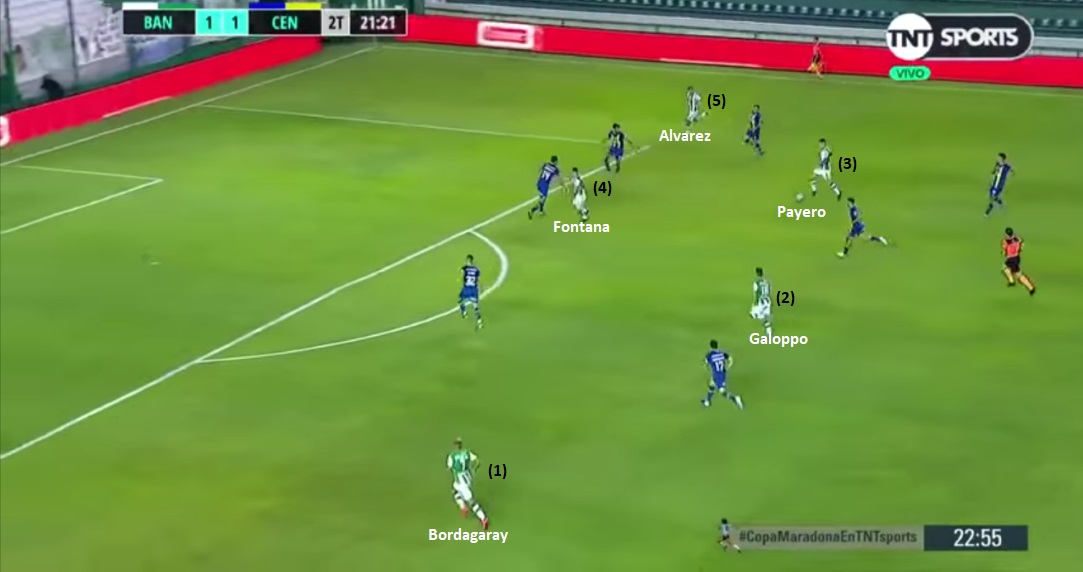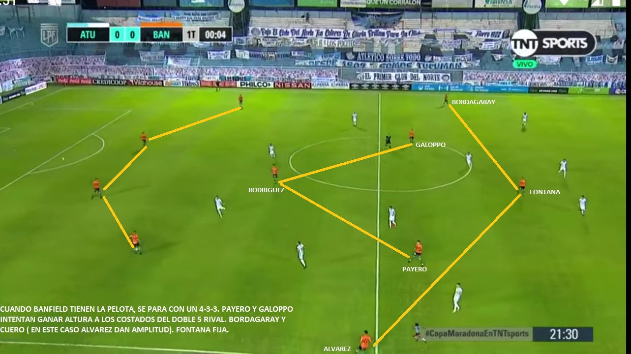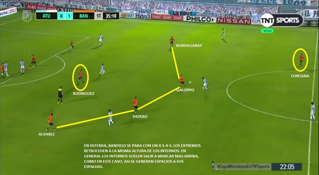 Este Banfield, como decía recién, es un equipo bien trabajado. Se agrupa bien sin la pelota, con una especie de 4-1-4-1, dejando solo a Fontana arriba. Cuando recupera sale muy rápido y ataca con mucha gente. Es un equipo que no le interesa tener la posesión. Promedia un 40% de tenencia por encuentro (222 pases por partido, de los cuales 116 son en campo contrario), de los más bajos de la Copa Maradona. Utiliza bastante los cambios de orientación, con pases largos de centrales o de Rodríguez a extremos para atacar con ventaja. Payero y Galoppo ganan altura entre líneas, por delante de Rodríguez, esperando salir rápido. Mientras que Cuero y Bordagaray van por afuera, acompañando a Fontana. Si vemos jugadas de peligro del equipo, vamos a encontrarnos con que esos 5 jugadores siempre están en zonas de ataque. Obviamente no todo es ideal en el equipo. Tiene sus defectos como todos. Este Banfield es un equipo armado sin mucho presupuesto y seguramente le falta mucha jerarquía. Defensivamente, tiene problemas porque sus defensores están lejos de ser confiables. Lollo ha recuperado un poco el nivel que tenía en Racing, pero no es el mismo. Bravo ha tenido algunos problemas defensivos. También ha tenido algún problema en pelota parada. Le han llegado bastante, incluso Arboleda promedia 3.5 paradas por encuentro. Su bache en la estructura defensiva, se genera a partir de la posición de Payero. Cuando sale a presionar al central rival, el equipo no alcanza a bascular bien, para tapar ese espacio. Si el rival logra atacar ese espacio se empieza a generar espacios. Con Talleres se vio mucho ese problema.