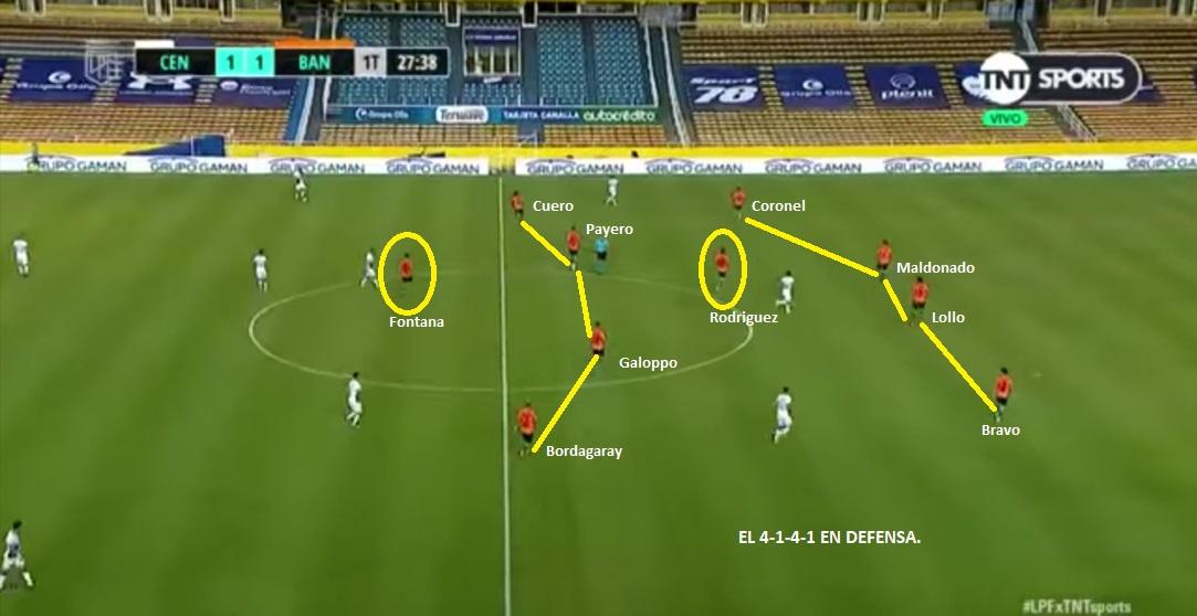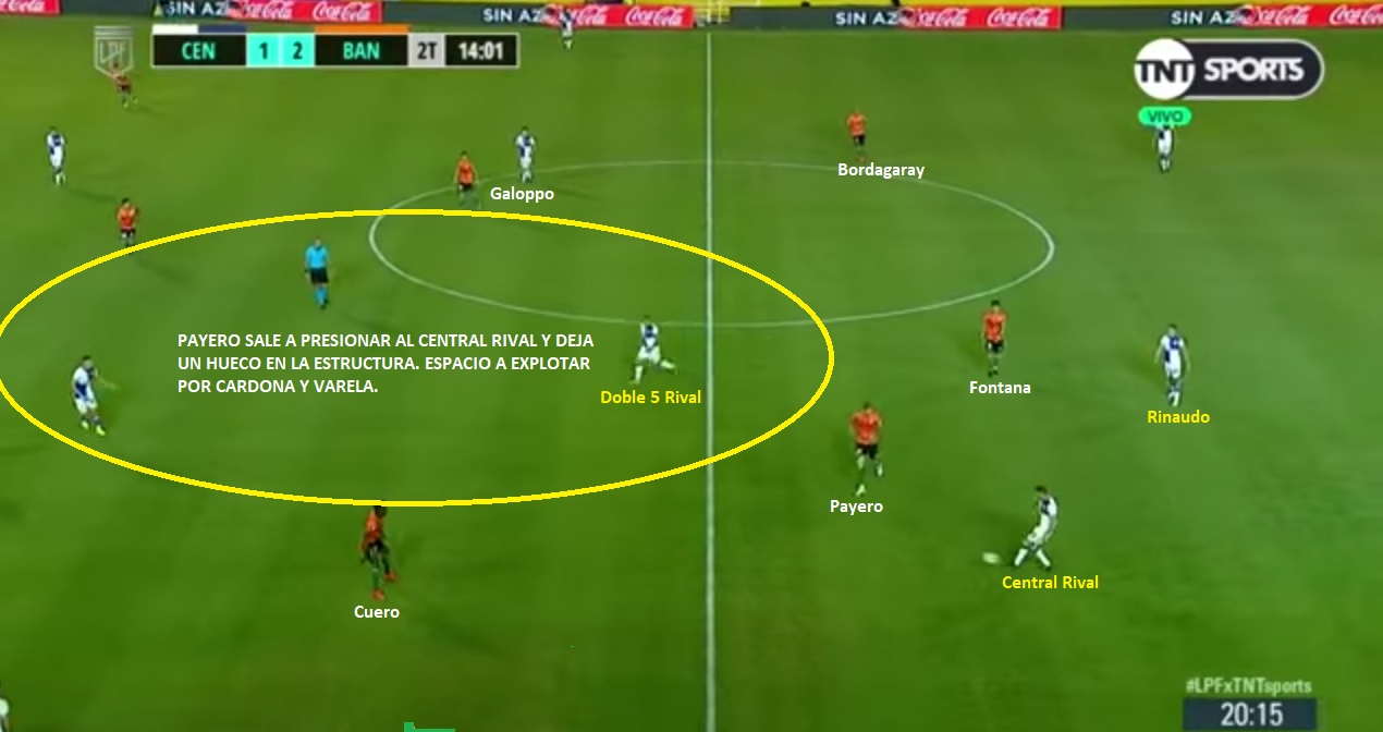 Si tenemos que hablar de jugadores claves, deberíamos hablar de los internos: Payero y Galoppo. Payero es el jugador más importante del equipo. Buena pegada, una gran dinámica, capacidad para asistir y buena visión de campo. Es el mejor asistidor con 7 asistencias, el 3ro que más dispara (1.6 por encuentro), el de más chances creadas (2.6 por partido) y el de más regates (3.3 por encuentro). Es, además, quien tiene más libertad para salir a presionar a los centrales rivales cuando vienen en conducción. Galoppo es el goleador del equipo junto a Fontana. Teniendo en cuenta que es un volante, que tenga 5 goles n 11 partidos es un número muy alto. Todo se explica por su capacidad de llegar al área y por su buen juego aéreo en pelota parada. Es el jugador que más dispara por partido (2.1), pero también colabora en la recuperación (1.6 quites por encuentro, 0.8 intercepciones y 0.7 despejes). No tiene tanta injerencia en el juego del equipo como Payero. El otro jugador clave es Mauricio Cuero. El extremo colombiano volvió al lugar donde más cómodo estuvo y rápidamente recuperó su nivel. 2 goles, 3 asistencias en 9 encuentros. Además, suma 1.3 chances creadas, 1.3 centros completados y 1.1 regates por encuentro. Su desequilibrio y velocidad por banda derecha, son una pesadilla para todos los rivales. River y San Lorenzo lo sufrieron mucho. También hay otros jugadores importantes en el equipo, como Fontana (5 goles en la Copa) o Jorge Rodríguez (1.2 chances creadas por encuentro, 1.8 quites, 1.9 despejes, 1.6 intercepciones y 62% duelos ganados). Rodríguez es clave en el sistema, se posiciona por detrás de Payero y Galoppo y siempre está bien ubicado. Además, tiene facilidad para el pase entre líneas y también para el pase largo. Es un jugador silencioso, pero muy importante. Obviamente no todo es ideal en el equipo. Tiene sus defectos como todos. Este Banfield es un equipo armado sin mucho presupuesto y seguramente le falta mucha jerarquía. Defensivamente, tiene problemas porque sus defensores están lejos de ser confiables. Lollo ha recuperado un poco el nivel que tenía en Racing, pero no es el mismo. Bravo ha tenido algunos problemas defensivos. También ha tenido algún problema en pelota parada. Le han llegado bastante, incluso Arboleda promedia 3.5 paradas por encuentro. Su bache en la estructura defensiva, se genera a partir de la posición de Payero. Cuando sale a presionar al central rival, el equipo no alcanza a bascular bien, para tapar ese espacio. Si el rival logra atacar ese espacio se empieza a generar espacios. Con Talleres se vio mucho ese problema.