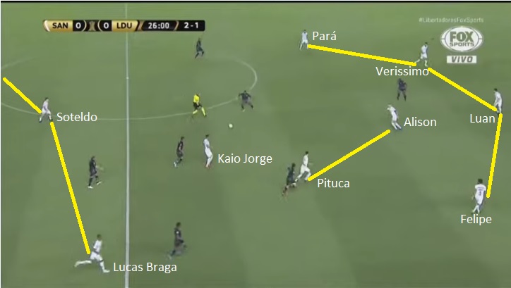 - Marinho y Soteldo. Son los 2 jugadores mas importantes de Santos. Marinho ante Gremio jugando de local la rompió. Apareció por todos lados, desequilibro y convirtió. Jugando en Villa Belmiro se siente cómodo. Fabra tendrá que tener mucho cuidado. El venezolano ya demostró en la Bombonera su capacidad para desequilibrar. Hay que ver si en esta ocasión juega por el medio o si juega por la izquierda. En cualquiera de los 2 lugares será peligroso.