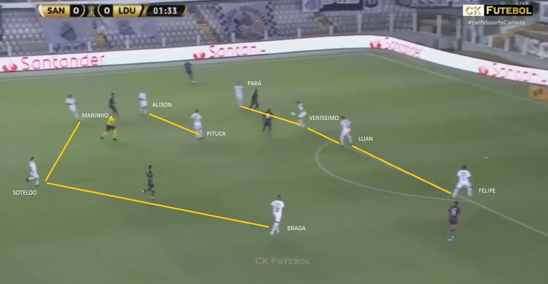 Como decíamos anteriormente, debido a que la serie esta igualada, imaginamos que Santos va a intentar tomar el protagonismo. Los marcajes individuales que aplico en la ida se pueden repetir, pero en este caso también en las zonas ofensivas. Kaio Jorge y Soteldo intentaran presionar un poco más, acompañados por Pituca. El Estadio de Villa Belmiro, por proximidad de sus tribunas parece más chico que el resto, pero la realidad es que sus medidas son más grandes que la Bombonera (Hay 300 metros cuadrados más). Eso puede beneficiar un poco más a Boca, que puede generarle más espacios a Villa y Salvio. Después, tiene que tratar de dejarlos en ventaja. Vimos en la ida que si Villa acelera, poco puede hacer Pará. Para el Xeneize será clave ver si puede contar con Campuzano. El Colombiano puede ser más efectivo para controlar a Soteldo, aunque hay que tener cuidado si el venezolano saca de posición a Jorman y ese lugar no lo ocupa nadie. En las bandas seguramente el Peixe libere un poco más a sus laterales. Pará y Felipe Jonatán suelen proyectarse más. Después obviamente hay que tener mucho cuidado con Marinho. El 11 no participo demasiado del juego en la Bombonera, pero tuvo la más clara que saco Andrada y después casi genera un penal de Izquierdoz. En Villa Belmiro ha mostrado sus mejores versiones. Lucas Braga es importante en el equipo en el sentido táctico. Hace un ida y vuelta incansable. Esta siempre para auxiliar a Felipe, pero también tiene un gran cambio de ritmo para atacar. El otro día en el segundo tiempo le generó complicaciones a Leo Jara. Ante Sao Paulo jugo los 90 minutos. Hay que ver si Cuca no tiene pensado dejarlo para el segundo tiempo y agregar un volante más. Eso cambiaría el panorama. Sin Lucas Braga, Felipe no estaría tan respaldado en sus duelos ante Salvio, porque Soteldo se compromete menos en la fase defensiva y los internos estarían más pendientes del doble 5 Xeneize. Igualmente, también hay que esperar como formará el equipo de Russo. Más allá que el equipo viene repitiéndose, todavía no está confirmado.