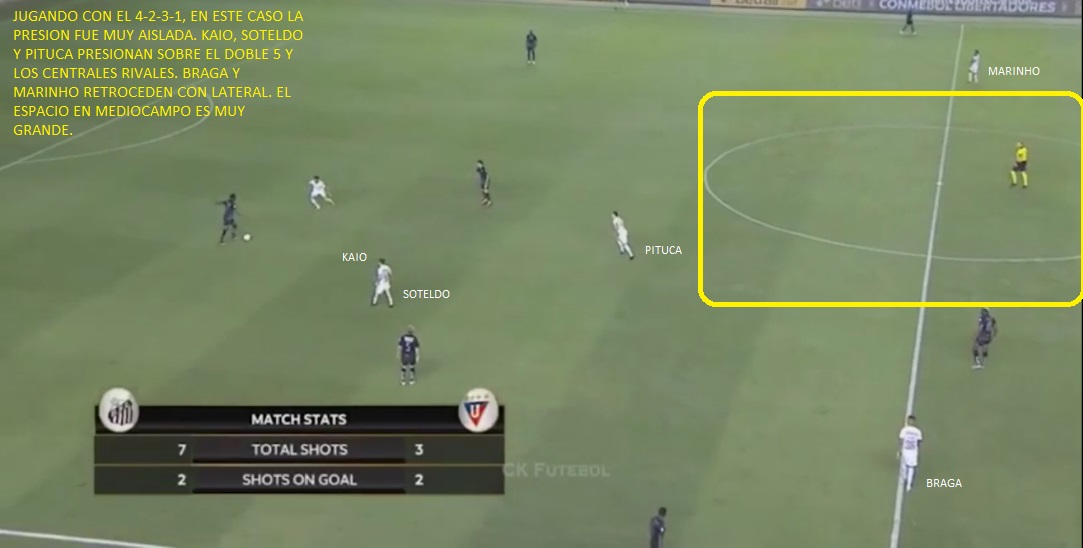 Por estilo, Santos no es un equipo que cambie demasiado jugando de local o visitante. De hecho en muchas ocasiones debido a la velocidad de sus delanteros, suele ser más peligroso de visitante con espacios. Si analizamos sus encuentros jugando como local en esta copa, nos podemos encontrar lo siguiente: En su debut como local ante Delfín no fue un gran partido. El débil equipo ecuatoriano le llego mucho y le dio bastante trabajo a Everson. El resultado fue 1 a 0 para el Peixe, pero con 20 intentos de disparo de Delfín. Su segundo encuentro como local, fue ante Olimpia. Fue un 0 a 0 donde Santos domino la posesión y los intentos, pero Olimpia llego en un par de ocasiones. El 3er encuentro, fue conocido para los argentinos. Un 2 a 1 ante Defensa y Justicia, bastante injusto. El equipo de Crespo fue un poco más y ganaba 1 a 0, pero el equipo de Cuca lo dio vuelta al final por intermedio de Lucas Braga y Marcos Leonardo. Ya en Octavos de final vino la derrota ante Liga de Quito por 0-1. En este caso creo que Santos mereció el triunfo, pero le faltó eficacia y termino sufriendo (1 gol más de Liga lo dejaba fuera). Su último encuentro como local fue ante Gremio. La serie estaba a su favor y un error de Jean Pyerre apenas comenzado el encuentro dejo a Kaio Jorge mano a mano y casi que liquido la serie. Luego todo fue a favor de Santos, que no tuvo la pelota, pero aprovecho muy bien los espacios y termino goleando por 4 a 1. Este encuentro contra el equipo Gaucho, fue sin dudas el mejor jugando de local. Pero siempre hay que tener en cuenta, que la serie estaba a su favor y podía jugar con espacios. Con Boca eso no sucederá. En este listado de encuentros, en general Santos jugo con un 4-3-3. Al principio Carlos Sanchez era titular, hasta su lesión de ligamentos. Solo ante Liga de Quito, el equipo jugo 4-2-3-1. Ante Gremio no estaba Soteldo y el mediocampo fue con Alison o Sandry; Pituca y Robson.