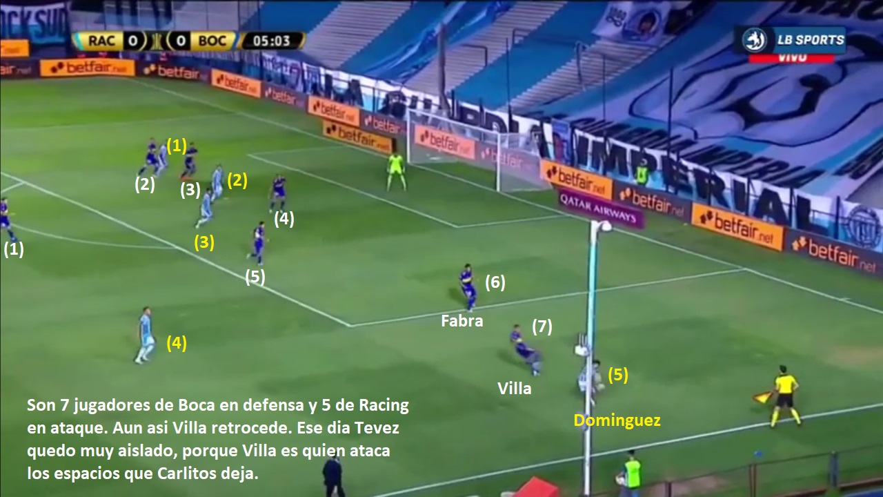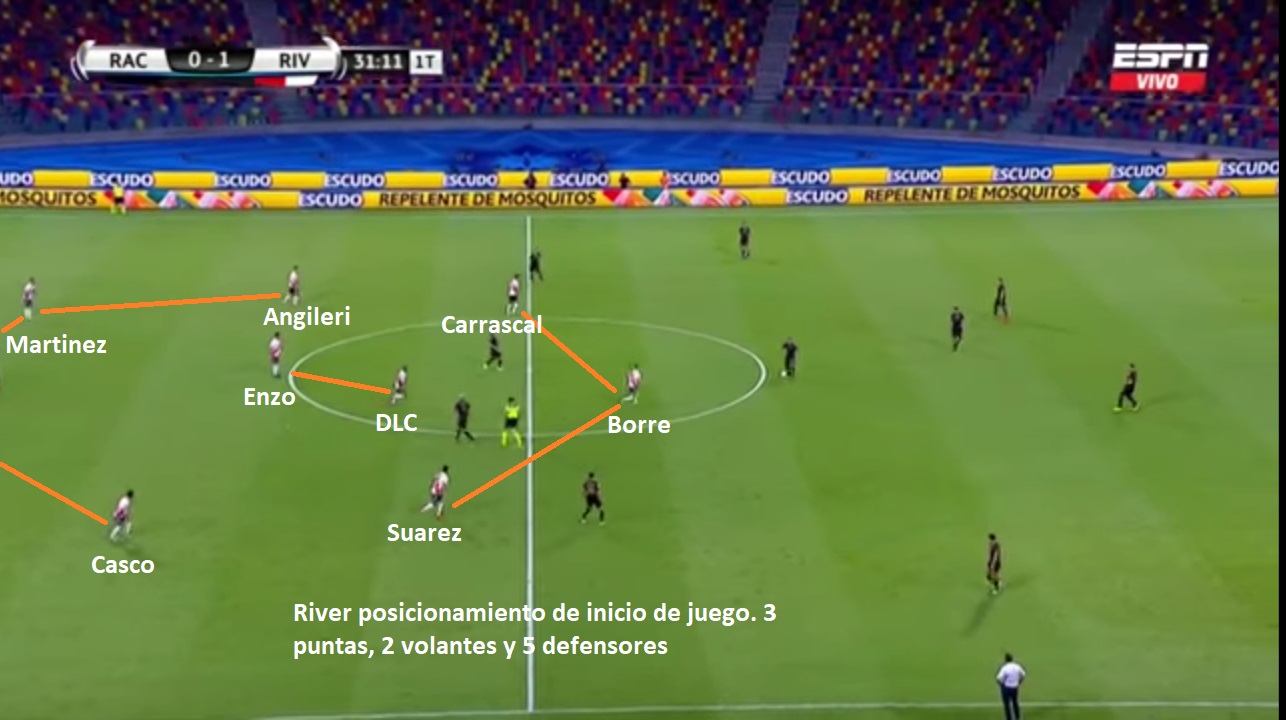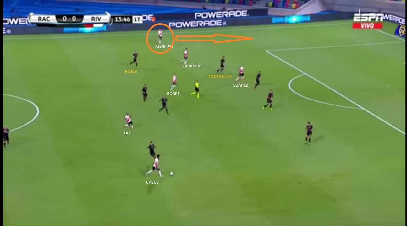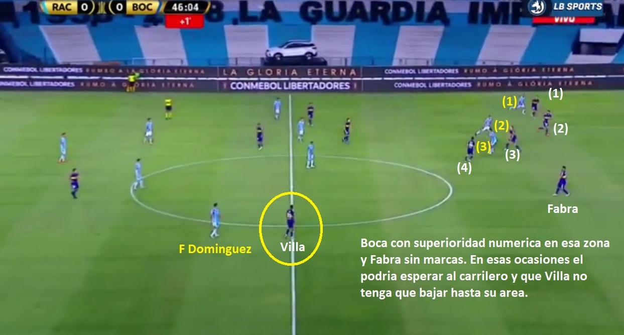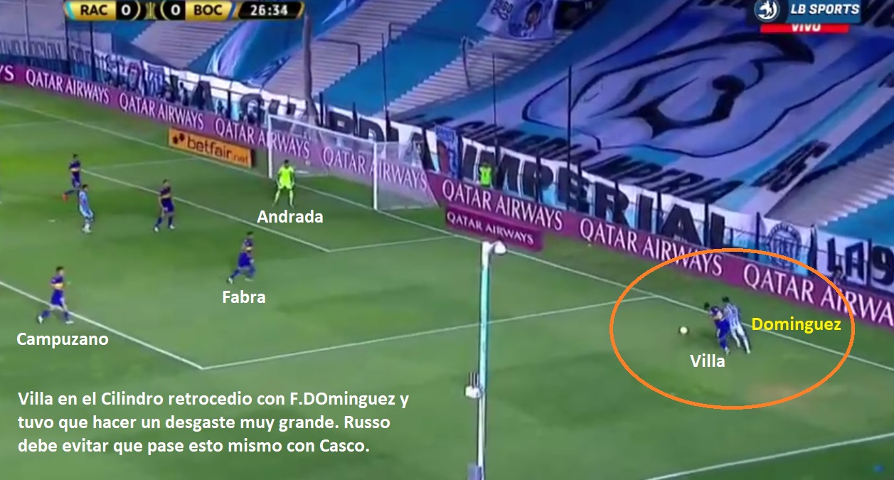 - Carrileros de River. Como tapará Boca esas zonas es una gran incógnita de Russo. ¿Cambiará de sistema y enfrentará a Capaldo con Angileri y a Fabra con Casco? ¿Seguirá con línea de 4 y apostará a enfrentarlo con los laterales Xeneizes? ¿Le pedirá un sacrificio a Villa y Maroni en caso de jugar con una formación similar a la de Vélez? Hay muchas dudas. Esperemos que Villa no tenga que desgastarse tanto y se pueda quedar a acompañar a Carlos Tevez. El Xeneize debe evitar que le suceda lo que le sucedió a Racing, donde Matías Rojas no seguía a Angileri y el lateral derecho (F. Domínguez) jugo contra Carrascal y Angileri todo el primer tiempo. Russo tuvo la experiencia de enfrentar a Racing con un sistema similar 2 veces hace muy poco.
