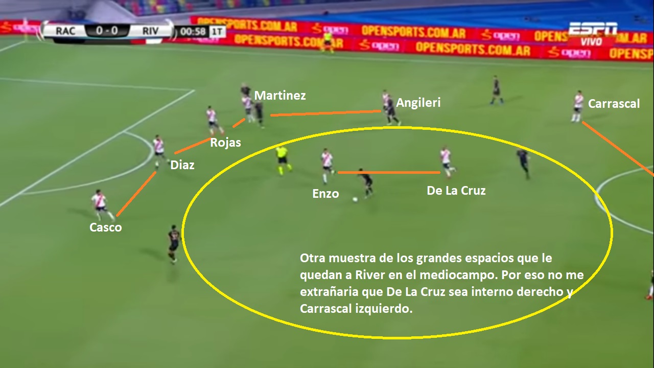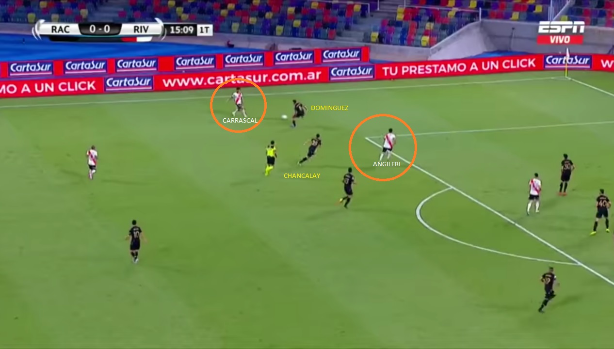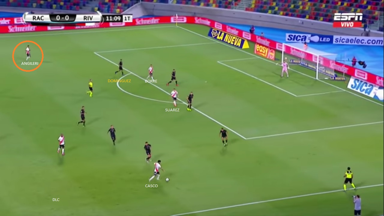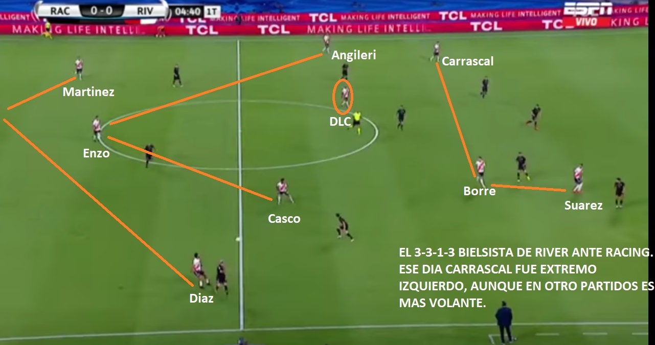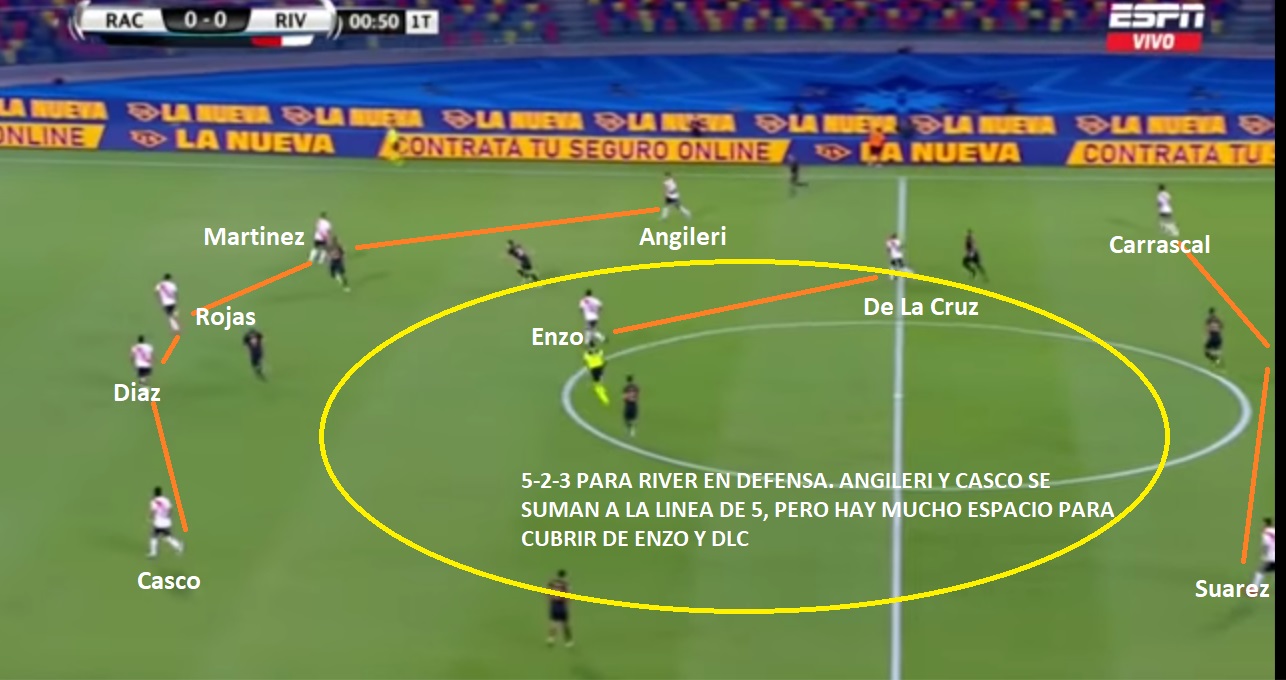 - Carrileros de River. Como tapará Boca esas zonas es una gran incógnita de Russo. ¿Cambiará de sistema y enfrentará a Capaldo con Angileri y a Fabra con Casco? ¿Seguirá con línea de 4 y apostará a enfrentarlo con los laterales Xeneizes? ¿Le pedirá un sacrificio a Villa y Maroni en caso de jugar con una formación similar a la de Vélez? Hay muchas dudas. Esperemos que Villa no tenga que desgastarse tanto y se pueda quedar a acompañar a Carlos Tevez. El Xeneize debe evitar que le suceda lo que le sucedió a Racing, donde Matías Rojas no seguía a Angileri y el lateral derecho (F. Domínguez) jugo contra Carrascal y Angileri todo el primer tiempo. Russo tuvo la experiencia de enfrentar a Racing con un sistema similar 2 veces hace muy poco.