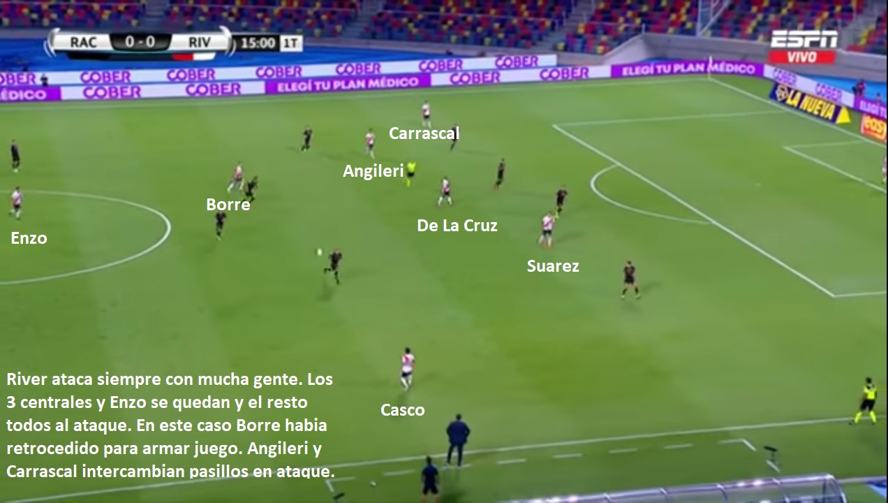 Hoy el Millonario es irregular, capaz de jugar partidos muy buenos, pero también de tener otros opacos. Es un equipo que a veces se hace fácil de contrarrestar. Eso se acentuó un poco más ahora sin Nacho Fernández, un jugador muy importante del ultimo tiempo Riverplatense. Argentinos el otro día mostró los caminos para frenarlos, cerrándoles las subidas de los carrileros y jugando con 3 atrás para evitar que Suarez haga diferencia. Es cierto que faltaba Angileri y Borre, pero igualmente el equipo de Milito no le permitió hacer su juego y además le llego 4 o 5 veces muy claras. Ante Rosario Central jugaron casi todos los titulares y también le costó el encuentro hasta que Borre convirtió el gol en una pelota parada y luego les obsequiaron un penal que no era. El partido con Racing, aunque para una parte del periodismo fue el nivel real del Millonario, fue una excepción. Ese día River aprovechó todas las falencias de la Academia y le llego bastante, hasta que logro abrir el marcador al minuto 30. Es un equipo que responde muy bien ante ciertos escenarios importantes y el Superclásico es uno de ellos. Sera un equipo agresivo, que buscará ser protagonista, intentará presionar alto y no darle muchos espacios a Boca para pensar. Esto es algo que le cuesta mantener por 90 minutos en el ultimo tiempo. Sus mayores fortalezas son la amplitud que le dan sus carrileros, aunque Casco muchas veces se cierra como interno cerca de Enzo, dejándole la banda a Matías Suarez. De La Cruz y Enzo Pérez hacen un trabajo incansable. El uruguayo retrocede para recuperar, presiona, llega a posición de gol. Su transformación comparándolo con el que llego a River es notable. Enzo últimamente está siendo el bombero del equipo. Defensivamente el equipo da ventajas y el mendocino esta siempre cubriendo los espacios. Una de las claves es que no despierte Jorge Carrascal. El colombiano es un jugador muy creativo y desequilibrante al cual le esta faltando meterse en la dinámica del equipo. Sus lagunas aparecen seguido y le falta mucha regularidad. Talento tiene de sobra, esperemos que no aparezca en este partido. Sera importante ver si arranca como extremo izquierdo o si retrocede unos metros y se cierra para volantear. Russo debe tener cuidado con los 2 puntas de River. Muchas veces ya lo han complicado al Xeneize. 2 delanteros intensos que viven marcando diagonales y a partir de su movilidad generar muchas ocasiones. Suarez es el más desequilibrante de todos.