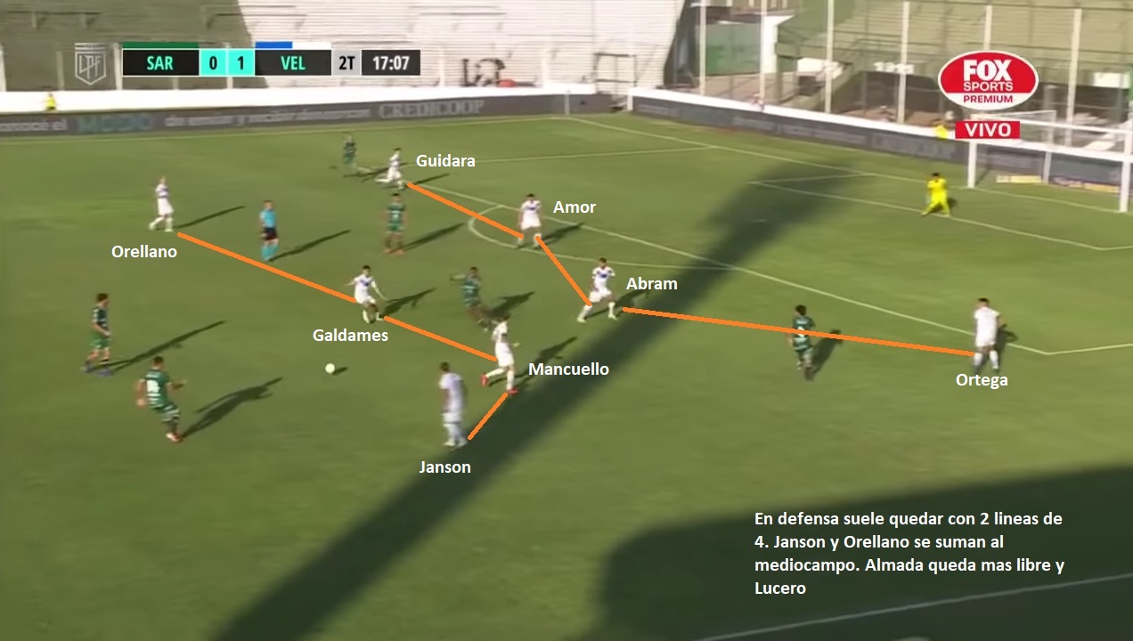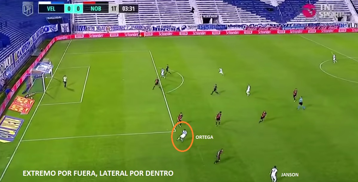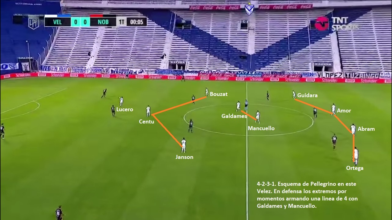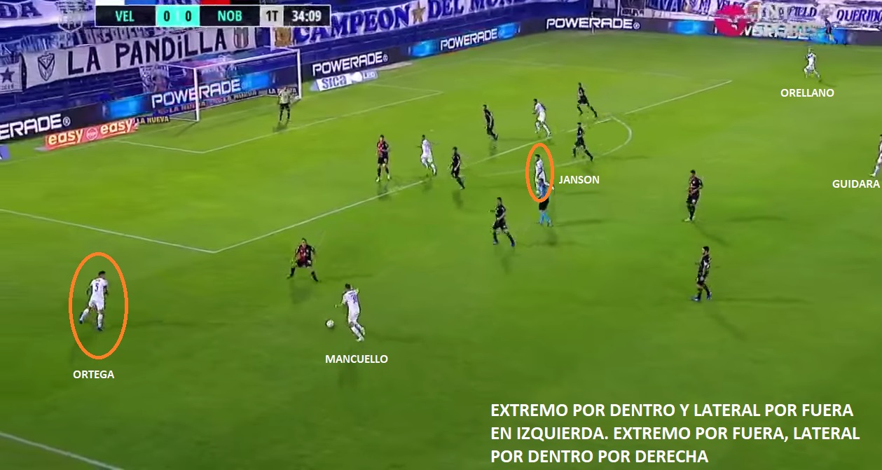 Velez es un equipo que ha demostrado adaptarse a los contextos. Con Heinze necesitaba dominar el desarrollo de los encuentros, para no sufrir porque no sabia jugar sin pelota. Hoy con Pellegrino si lo puede hacer. Tiene mecanismos para salir por abajo, tiene volantes como Mancuello y Galdames que pueden manejar los partidos, pero igual sabe plantar 2 líneas de 4 y esperar. Con este entrenador, Thiago Almada juega en una posición mas cercana a la ideal. Libre, detrás de un punta, con libertad para moverse y encontrar su zona. En este equipo, son importantes en ataque las bandas. Janson y Orellano dan amplitud, tienen buen 1 contra 1 (Los 2 mejores en regates por encuentro) y desbordan. Pero si los extremos no están por afuera, es porque se cerraron para que pasen Guidara u Ortega. Los 2 laterales pasan bien al ataque y lo pueden hacer atacando por dentro, si el extremo esta abierto o por fuera si es necesario. En el único encuentro de local que ha jugado Vélez hasta ahora, los 2 laterales fueron claves. También hay que mencionar, que, así como son importantes en ataque sufren bastante en defensa. Ni Ortega ni Guidara son tan fuertes en defensa y suelen sufrir a su espalda. Argentinos Juniors puso a Cabrera para atacar la espalda del lateral izquierdo y lo complico mucho. Guidara ha tenido menos problemas, pero también es un lateral mas de ataque. Pellegrino también ha encontrado su doble 5. Galdames y Mancuello se están complementando muy bien. Saben alternar alturas en salida, para no jugar en línea y en defensa se dividen el medio (Galdames a la derecha, Mancuello a la izquierda). El chileno se desgasta un poco mas gracias a su dinámica y Mancu es quien intenta darle juego al equipo. Sus pases entre líneas y cambios de orientación suelen ser importantes. Es un buen equipo, pero también ha mostrado fragilidades. La espalda del doble 5, las dudas de Amor, la espalda de los laterales. Es un equipo al cual se le puede llegar. Argentinos en el primer tiempo y Sarmiento en el segundo lo dominaron y le llegaron bastante. Incluso NOB jugando con 1 menos tuvo alguna chance clara.
