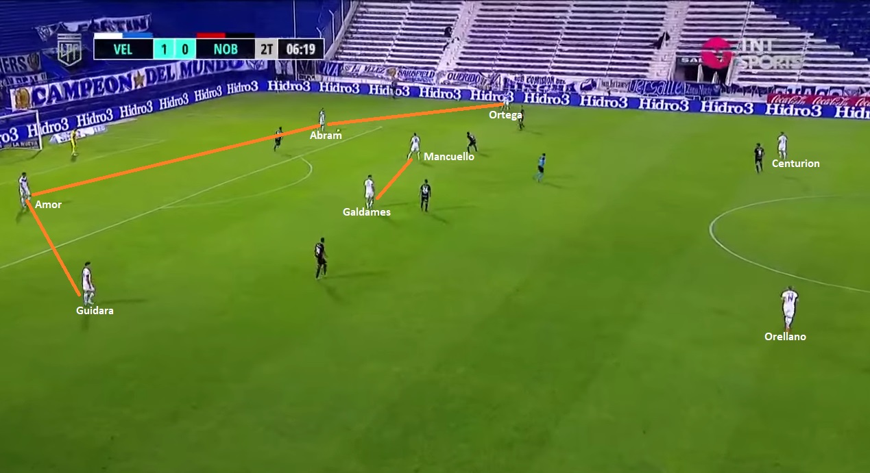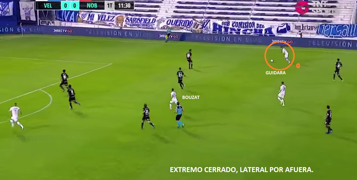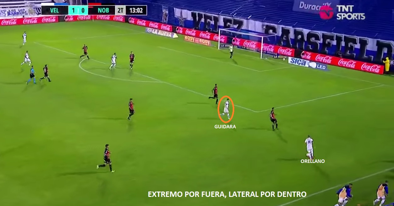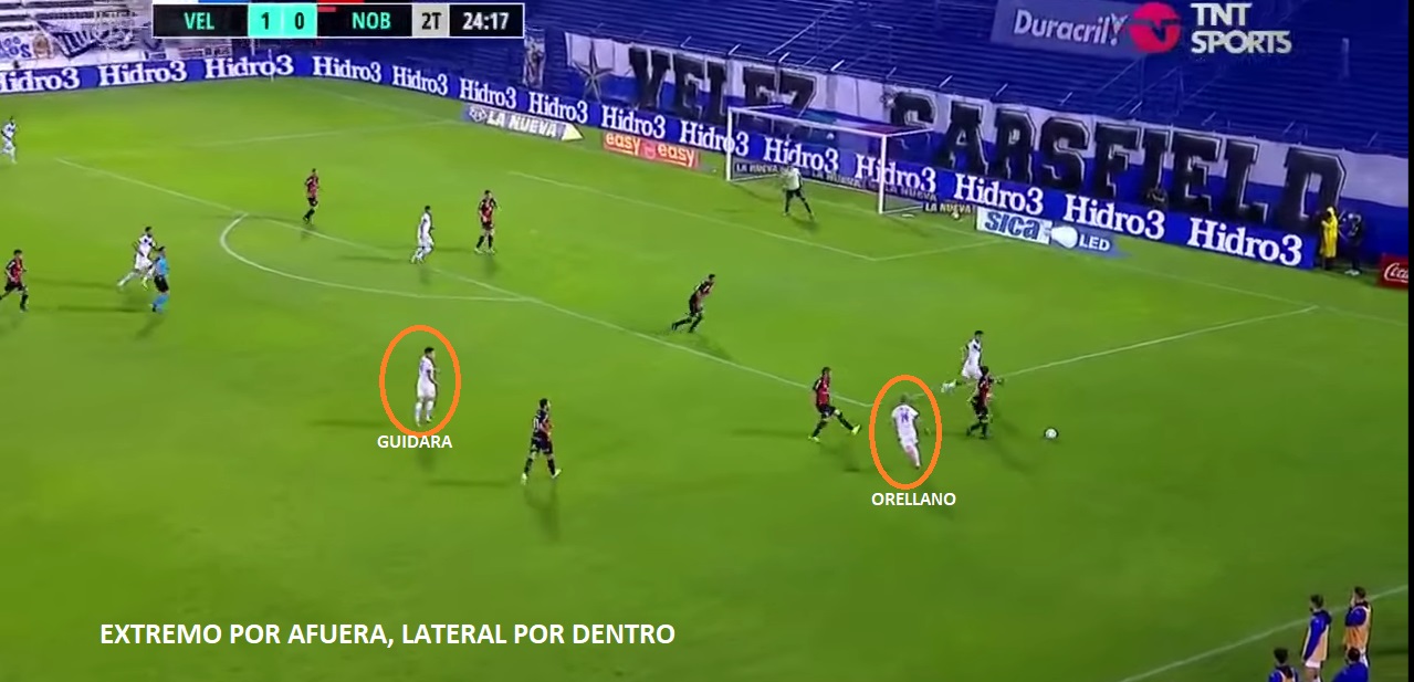 Velez es un equipo que ha demostrado adaptarse a los contextos. Con Heinze necesitaba dominar el desarrollo de los encuentros, para no sufrir porque no sabia jugar sin pelota. Hoy con Pellegrino si lo puede hacer. Tiene mecanismos para salir por abajo, tiene volantes como Mancuello y Galdames que pueden manejar los partidos, pero igual sabe plantar 2 líneas de 4 y esperar. Con este entrenador, Thiago Almada juega en una posición mas cercana a la ideal. Libre, detrás de un punta, con libertad para moverse y encontrar su zona. En este equipo, son importantes en ataque las bandas. Janson y Orellano dan amplitud, tienen buen 1 contra 1 (Los 2 mejores en regates por encuentro) y desbordan. Pero si los extremos no están por afuera, es porque se cerraron para que pasen Guidara u Ortega. Los 2 laterales pasan bien al ataque y lo pueden hacer atacando por dentro, si el extremo esta abierto o por fuera si es necesario. En el único encuentro de local que ha jugado Vélez hasta ahora, los 2 laterales fueron claves. También hay que mencionar, que, así como son importantes en ataque sufren bastante en defensa. Ni Ortega ni Guidara son tan fuertes en defensa y suelen sufrir a su espalda. Argentinos Juniors puso a Cabrera para atacar la espalda del lateral izquierdo y lo complico mucho. Guidara ha tenido menos problemas, pero también es un lateral mas de ataque. Pellegrino también ha encontrado su doble 5. Galdames y Mancuello se están complementando muy bien. Saben alternar alturas en salida, para no jugar en línea y en defensa se dividen el medio (Galdames a la derecha, Mancuello a la izquierda). El chileno se desgasta un poco mas gracias a su dinámica y Mancu es quien intenta darle juego al equipo. Sus pases entre líneas y cambios de orientación suelen ser importantes. Es un buen equipo, pero también ha mostrado fragilidades. La espalda del doble 5, las dudas de Amor, la espalda de los laterales. Es un equipo al cual se le puede llegar. Argentinos en el primer tiempo y Sarmiento en el segundo lo dominaron y le llegaron bastante. Incluso NOB jugando con 1 menos tuvo alguna chance clara.
