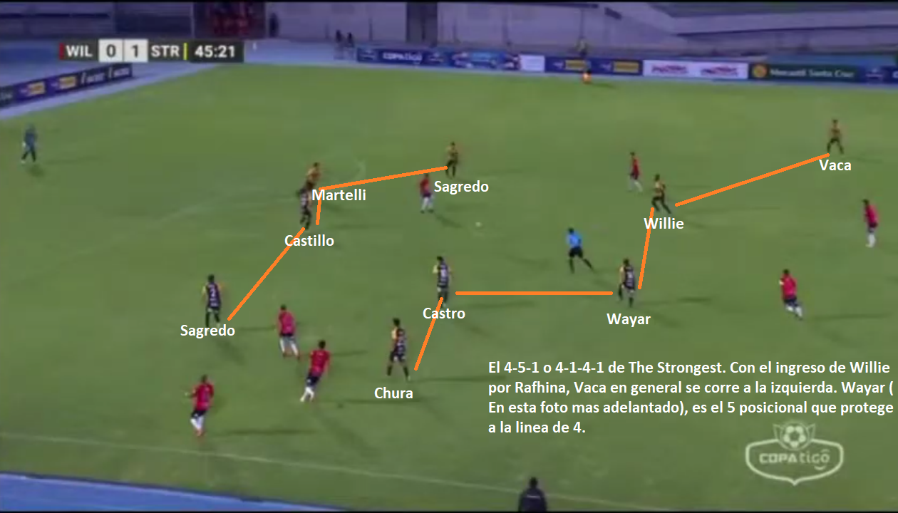 ¿Como formará el equipo de Alberto Illanes?. El entrenador de The Strongest (desde el 09/03/2020), tiene todo bastante claro para este encuentro. Luego del 3 a 0 en Cochabamba ante Jorge Wilstermann todo indica que puede repetir equipo, con el cambio de Willie Barbosa por Rafinha. El probable: Daniel Vaca; Jesús Sagredo, Gonzalo Castillo, Fernando Martelli, José Sagredo; Diego Wayar; Jeyson Chura, Raúl Castro, Willie Barbosa, Ramiro Vaca; Jair Reinoso. Una especie de 4-1-4-1, aunque la realidad es que hay bastante movilidad en la línea de 4 volantes. Se puede ver a Chura por izquierda, a Ramiro Vaca por adentro o por la izquierda y a Willie también intercambiando posición. En el encuentro ante Wilstermann, se vio más tiempo a Vaca por izquierda que a Barbosa. Quizás Raúl Castro, es el único de los 4 que mantiene más su posición e intenta estar cerca de Diego Wayar (el 5 posicional). Los 2 laterales ganan mucha altura y José Sagredo el lateral izquierdo, a veces aparece como un extremo. Es un equipo que pone mucha gente en ataque y deja generalmente solo a sus 2 centrales y a Wayar, para las transiciones rivales. Entre los centrales, hasta hace poco tiempo el titular era Gabriel Valverde, pero el ingreso de Fernando Martelli ha sido satisfactorio y parece que mantendrá ese lugar.