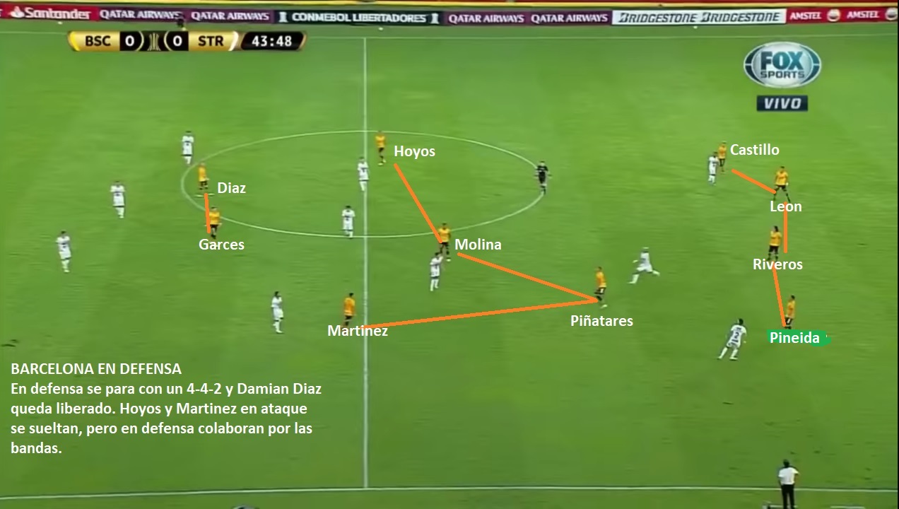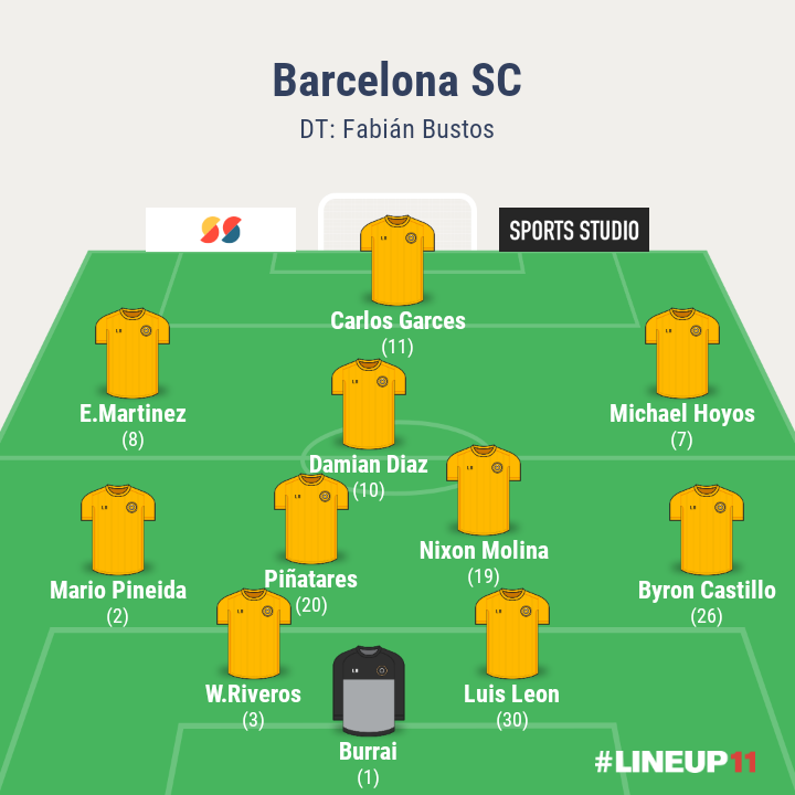 ¿Como formará Barcelona? Sin confirmar el equipo, lo más lógico sería que Fabian Bustos siga apostando por el mismo equipo que le gano a Santos, The Strongest, Boca y que gano el fin de semana en la Liga. Un probable: Burrai; Byron Castillo, Luis León, William Riveros, Mario Pineida; Nixon Molina, Bruno Piñatares; Michael Hoyos, Damián Diaz, Emmanuel Martínez; Carlos Carces. Un 4-2-3-1 en ataque, que en defensa es más un 4-4-2. Entre los 11 titulares hay 4 argentinos (Burrai, Hoyos, Diaz y Martínez). Tampoco hay que descartar un ingreso de Quiñonez en el lateral izquierdo y la salida de Michael Hoyos, pasando Mario Pineida al mediocampo. Eso fue lo que hicieron en La Paz, aunque el resultado no fue el mejor.
