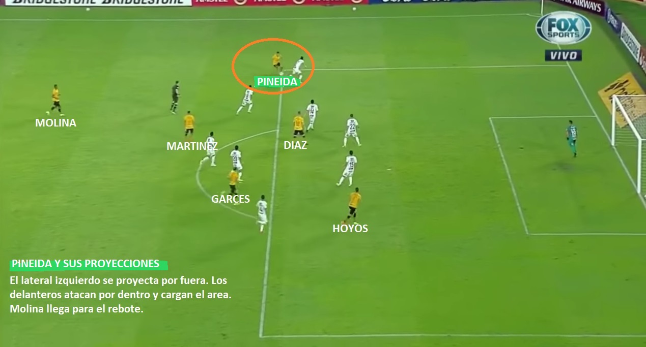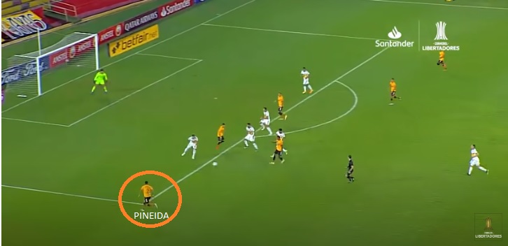Bustos llego al equipo a comienzos del 2020. Hoy podemos decir que ha encontrado un buen funcionamiento. Es un equipo que ha crecido en el ritmo e intensidad y eso le esta permitiendo competir en esta Copa. El sistema es un 4-2-3-1, aunque sus laterales son muy importantes por la profundidad que aportan. Esa amplitud que dan Bryon Castillo (principalmente) y Pineida, le permite a Hoyos, Damián Diaz y Martínez, moverse con mas libertad. Intercambian bastante sus posiciones. Es un equipo muy flexible en ese sentido, gracias a lo que le dan sus laterales. El doble pivote del mediocampo, esta conformado con un mixto, como Nixon Molina que se suelta un poco más y el uruguayo Piñatares, que suele ser mas posicional. Piñatares tiene mejor pase y ubicación, mientras que Molina se suelta bien y llega a posición de gol (En la Liga convirtió 2 goles ya). Cuando la pelota la tiene el rival el equipo se para en 4-4-2 y Damián Diaz queda como un punta. En general “Kitu” y Garces se tratan de encargar de tapar la salida entre los centrales y el 5 rival. Si la pelota va al 1er central va Diaz mientras Garces va con el 5, y si va al 2do central lo contrario.