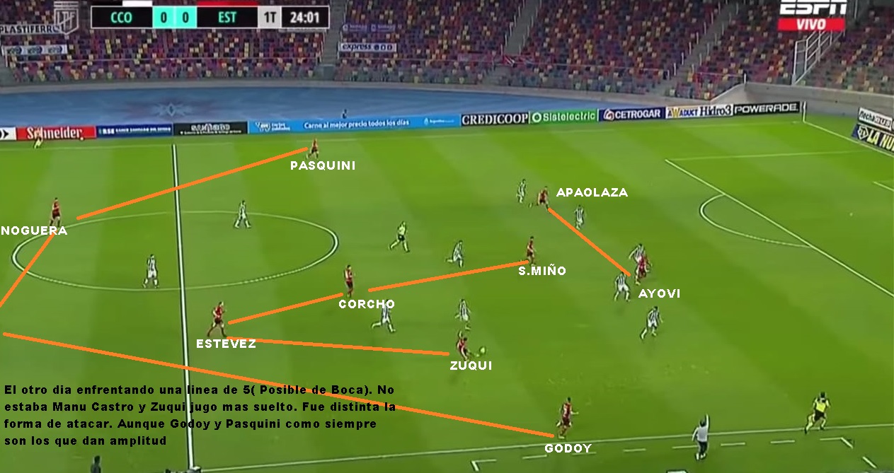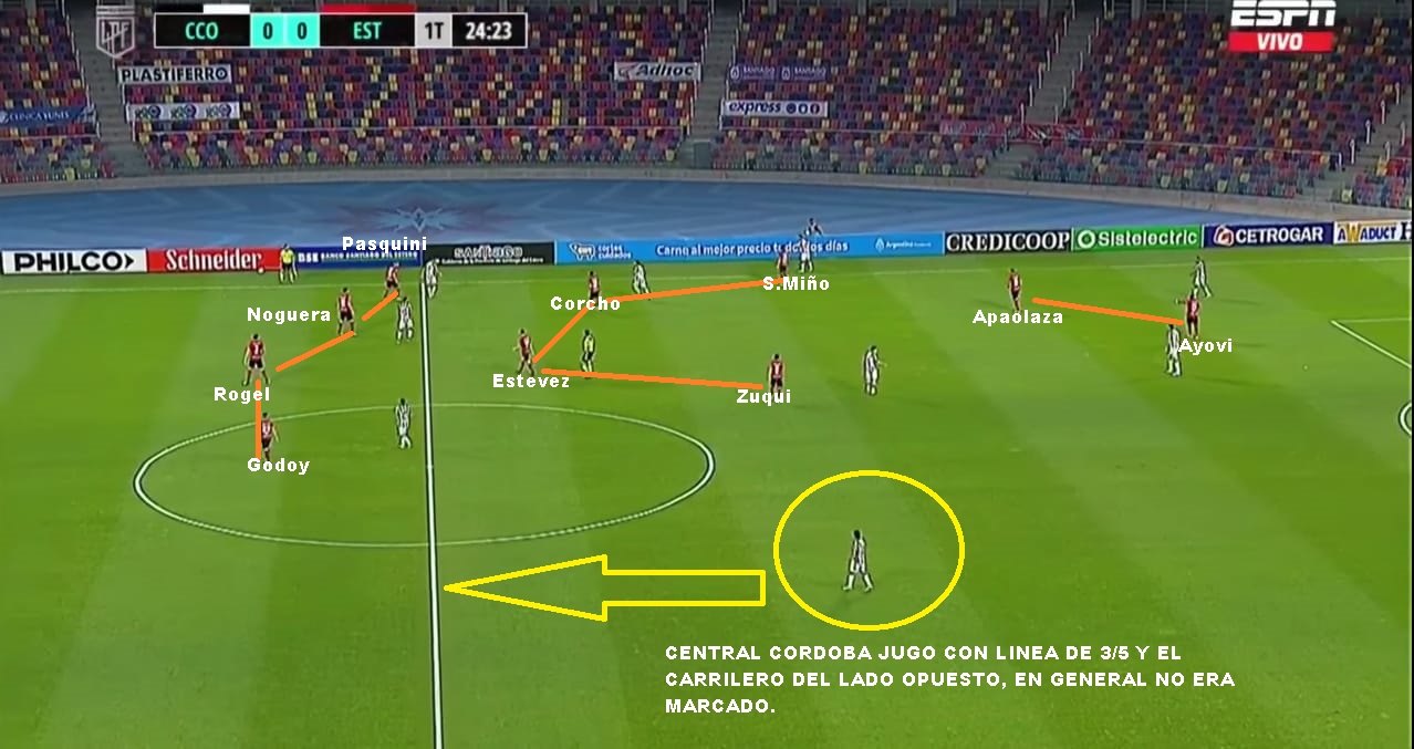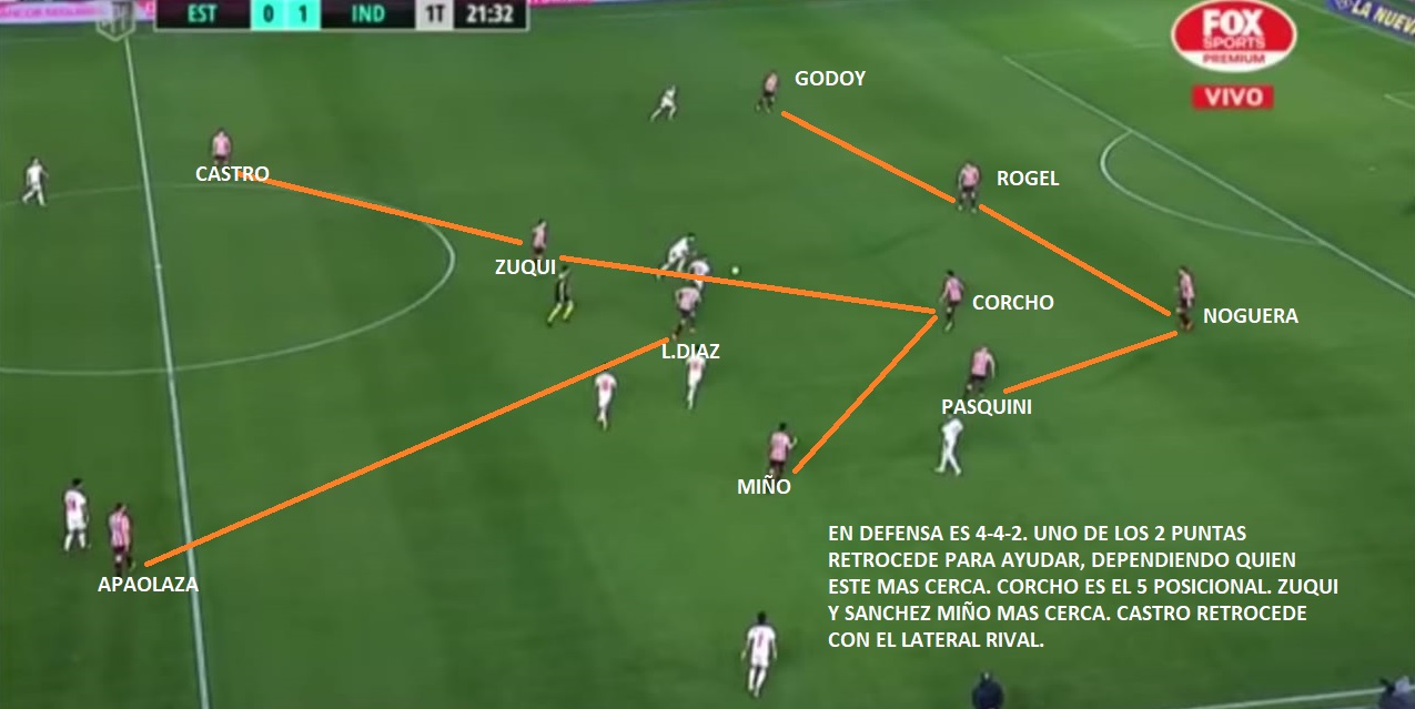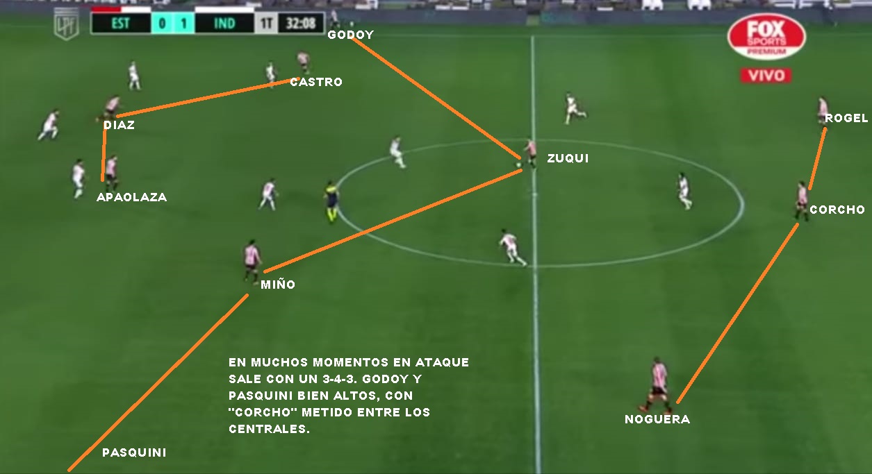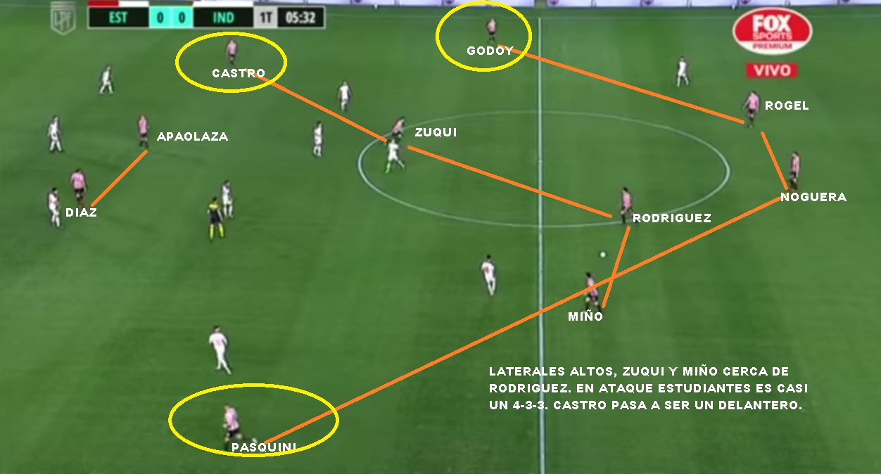 El Pincha es un típico equipo de Zielinski. 4-4-2 con 2 referencias fuertes en ataque (Apaolaza y Ayoví), juego directo y llegar con mucha gente al ataque. Como le gusta al entrenador y también como le gusta a la mayoría de los hinchas de Estudiantes. Cuando defiende planta las 2 líneas de 4, con uno de los 2 puntas tapando al 5 rival y otro suelto. Cuando ataca la cosa cambia. “Corcho” Rodríguez en algunas ocasiones se mete un poco entre los centrales, los laterales (Godoy y Pasquini) ganan mucha altura, Zuqui y Sanchez Miño juegan por dentro y Manu Castro se suma a la zona de ataque. Cuando el equipo tiene la pelota se forma una especie de 3-4-3, más que nada en salida. Sánchez Miño y Castro son los volantes externos, pero su función es muy distinta. Ambos retroceden por las bandas, pero cuando hay que atacar, Miño se suelta mas por dentro en zonas cercanas de Zuqui y Rodríguez, mientras que Castro va más cerca del área rival acompañando a los delanteros. En general la amplitud la dan los laterales. Ante Central Córdoba sus 2 puntas tuvieron 18 duelos aéreos cada uno. Una muestra de lo que es el equipo y su juego directo. En el aspecto defensivo, da alguna ventaja en la zona Pasquini y por ahora Rogel y Noguera no están dando la seguridad del torneo pasado. Han tenido algunos baches en su juego en todos sus partidos, incluso en los que ganó. Contra Sarmiento no jugo un buen primer tiempo y terminó ganando 3 a 0 con 3 goles en 6 minutos en el segundo tiempo. Algo parecido le sucedió con Arsenal, donde luego de un mal primer tiempo, se impuso con un 4 a 0 en el segundo.