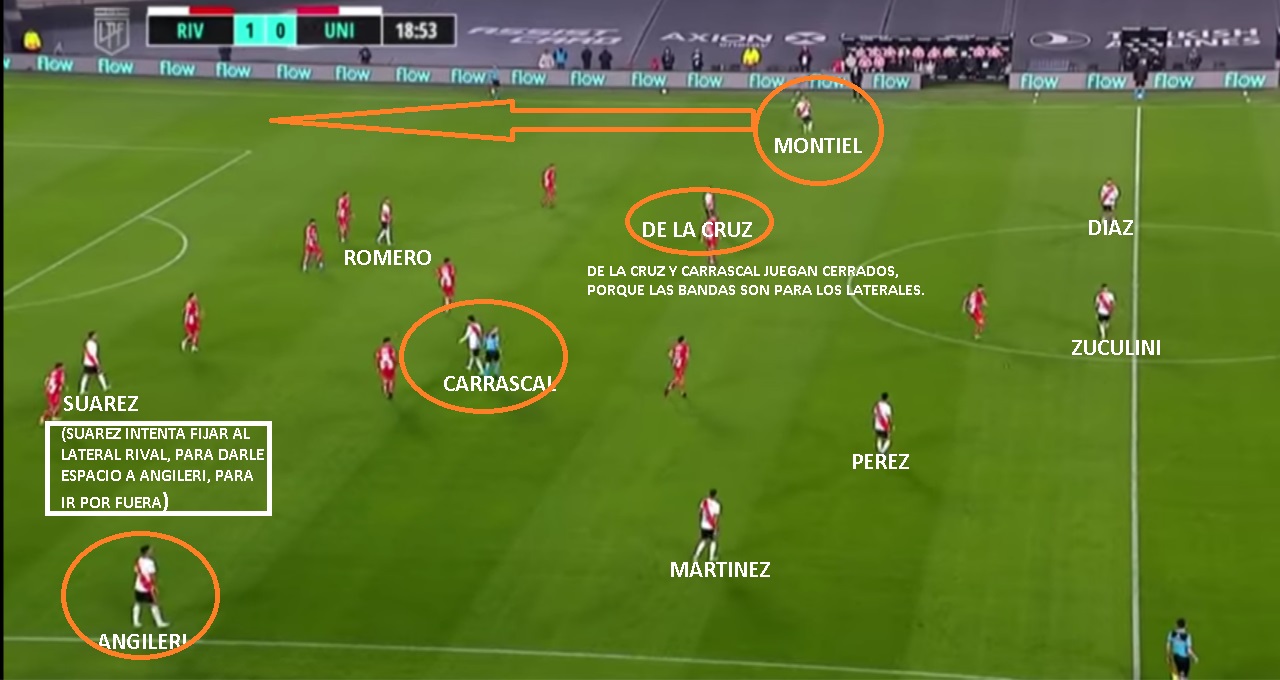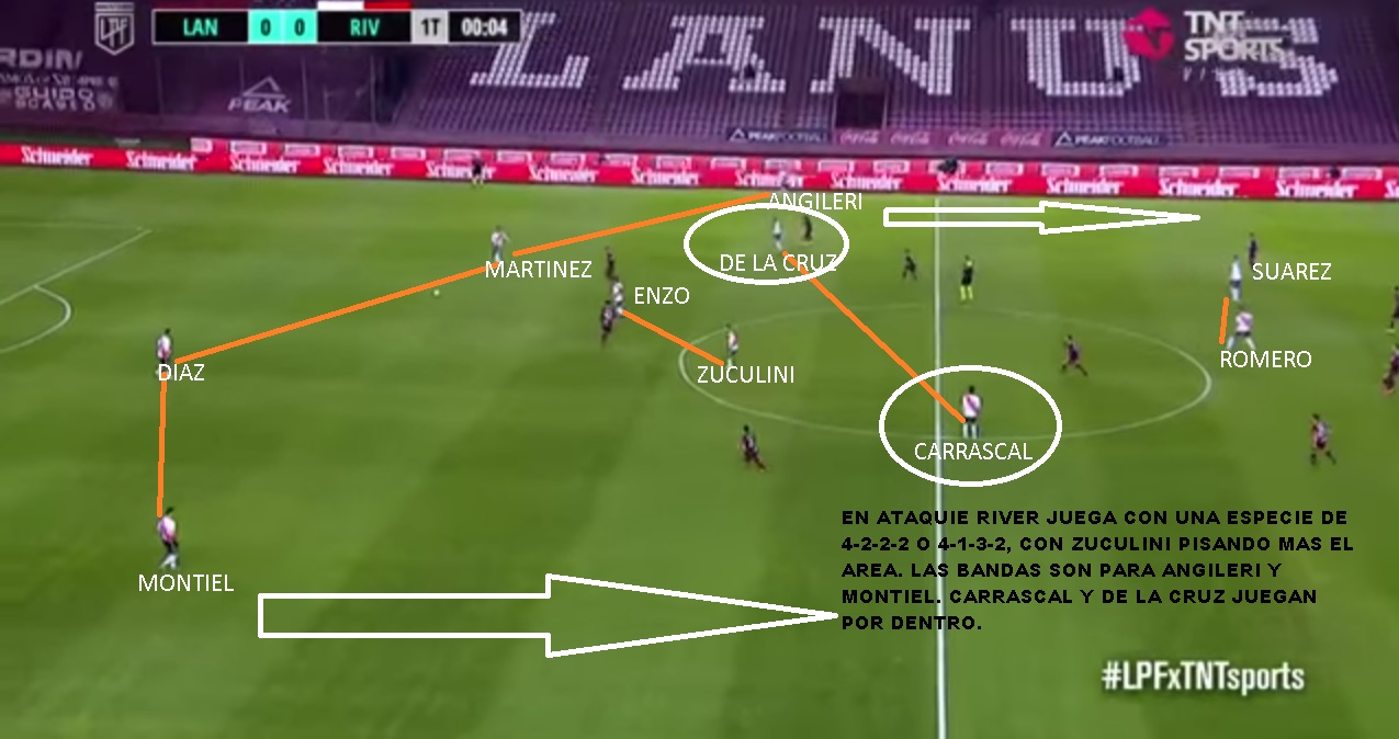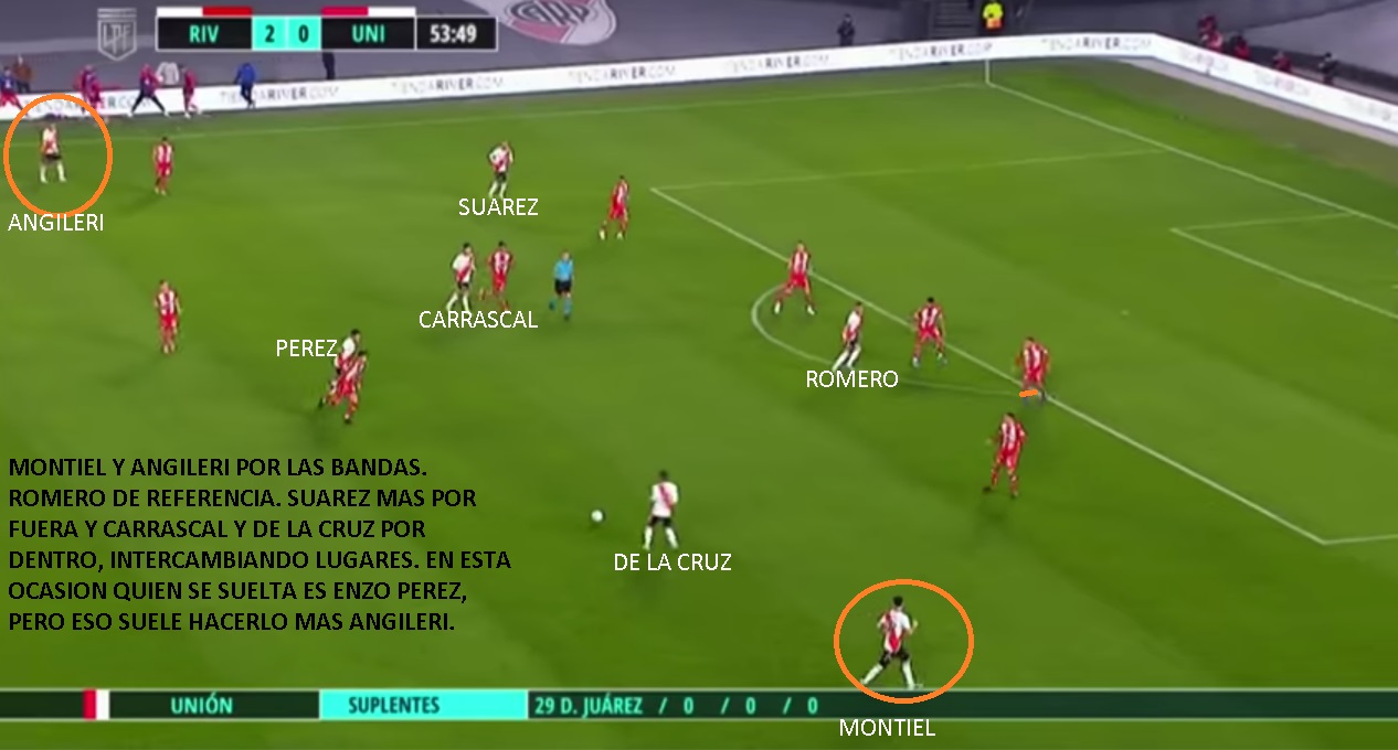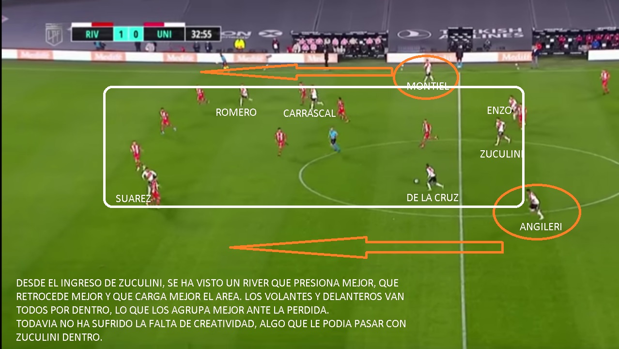 Desde la salida de Exequiel Palacios, River ha cambiado bastante. Primero apostó por el 5-3-2(Rojas de libero), luego paso al 4-3-3 (Ingreso de Julián Álvarez), luego volvió al 4-1-3-2 con Santiago Sosa buscando hacer de Palacios, para luego volver al 4-3-3, pero con el ingreso de Jorge Carrascal de extremo izquierdo. En este 2021, le ha pasado algo similar. 4-3-1-2 por momentos con De la Cruz más cerca de Enzo Pérez, luego línea de 5(Semis de Libertadores con Palmeiras, Supercopa con Racing, etc) y luego 4-3-3 con el ingreso de Palavecino. Ha buscado de todo, pero nunca pudo reemplazar al jugador que se fue a Alemania. No volvió a presionar igual, no volvió a ocupar los espacios igual. En el comienzo de este semestre ante AAAJ el equipo salió 4-3-3, pero no convenció. A partir del partido de vuelta, Gallardo sorprendió con el ingreso de Carrascal y Zuculini y no cambio más. Con Zuculini cerca de Enzo Pérez, encabezando la presión, ha liberado a De La Cruz y Carrascal y además potencio la idea que mas le ha rendido, que es la de jugar con 2 delanteros. 4-1-3-2 en presión y ataque, 4-2-2-2 en otros momentos. El equipo ha crecido porque recupera mas rápido, porque Enzo Pérez no esta tan solo, porque De La Cruz está más cerca del área rival y porque está cargando mejor el área. Las bandas en River siempre fueron para los laterales y eso no cambio, pero ahora sus proyecciones están más protegidas en la transición defensiva. La posición media de los volantes y delanteros de River, indica que todos juegan por adentro, menos Angileri y Montiel. Por momentos abusa demasiado de los centros (52 ante Colon, 49 ante Huracán, 27 ante AAAJ en la ida). En los encuentros más cerrados, termina excediéndose en ese rubro. Aunque hoy con Zuculini pisando el área, De La Cruz cerca, Carrascal cerca y los 2 puntas, tiene más chances de sacar provecho. Cuando le tapan la subida de los laterales suelen perder peso. Veremos que plantea Miguel Russo contra eso.