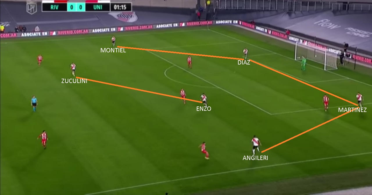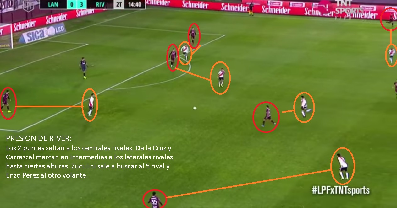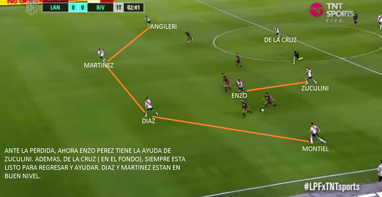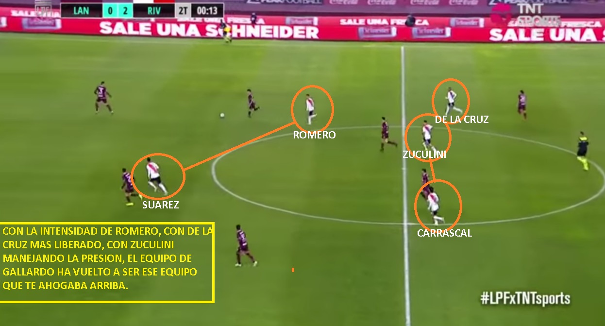 Desde la salida de Exequiel Palacios, River ha cambiado bastante. Primero apostó por el 5-3-2(Rojas de libero), luego paso al 4-3-3 (Ingreso de Julián Álvarez), luego volvió al 4-1-3-2 con Santiago Sosa buscando hacer de Palacios, para luego volver al 4-3-3, pero con el ingreso de Jorge Carrascal de extremo izquierdo. En este 2021, le ha pasado algo similar. 4-3-1-2 por momentos con De la Cruz más cerca de Enzo Pérez, luego línea de 5(Semis de Libertadores con Palmeiras, Supercopa con Racing, etc) y luego 4-3-3 con el ingreso de Palavecino. Ha buscado de todo, pero nunca pudo reemplazar al jugador que se fue a Alemania. No volvió a presionar igual, no volvió a ocupar los espacios igual. En el comienzo de este semestre ante AAAJ el equipo salió 4-3-3, pero no convenció. A partir del partido de vuelta, Gallardo sorprendió con el ingreso de Carrascal y Zuculini y no cambio más. Con Zuculini cerca de Enzo Pérez, encabezando la presión, ha liberado a De La Cruz y Carrascal y además potencio la idea que mas le ha rendido, que es la de jugar con 2 delanteros. 4-1-3-2 en presión y ataque, 4-2-2-2 en otros momentos. El equipo ha crecido porque recupera mas rápido, porque Enzo Pérez no esta tan solo, porque De La Cruz está más cerca del área rival y porque está cargando mejor el área. Las bandas en River siempre fueron para los laterales y eso no cambio, pero ahora sus proyecciones están más protegidas en la transición defensiva. La posición media de los volantes y delanteros de River, indica que todos juegan por adentro, menos Angileri y Montiel. Por momentos abusa demasiado de los centros (52 ante Colon, 49 ante Huracán, 27 ante AAAJ en la ida). En los encuentros más cerrados, termina excediéndose en ese rubro. Aunque hoy con Zuculini pisando el área, De La Cruz cerca, Carrascal cerca y los 2 puntas, tiene más chances de sacar provecho. Cuando le tapan la subida de los laterales suelen perder peso. Veremos que plantea Miguel Russo contra eso.