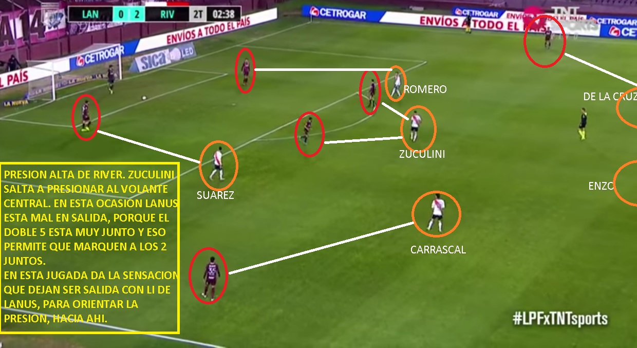 - Presión alta de River. Un verdadero problema. Con Zuculini saltando a Rolón, Carrascal y De La Cruz referenciando a los laterales, Álvarez y Romero saltando a Izquierdoz y Rojo, el equipo seguramente saldrá con pelotazos largos. Pondrá a Briasco y Pavón a jugar en un contexto incomodo ante Diaz y Martínez. Si la pelota llega siempre por arriba costará hacer pie. Hay que buscar a la espalda de los laterales con diagonales del medio hacia afuera.