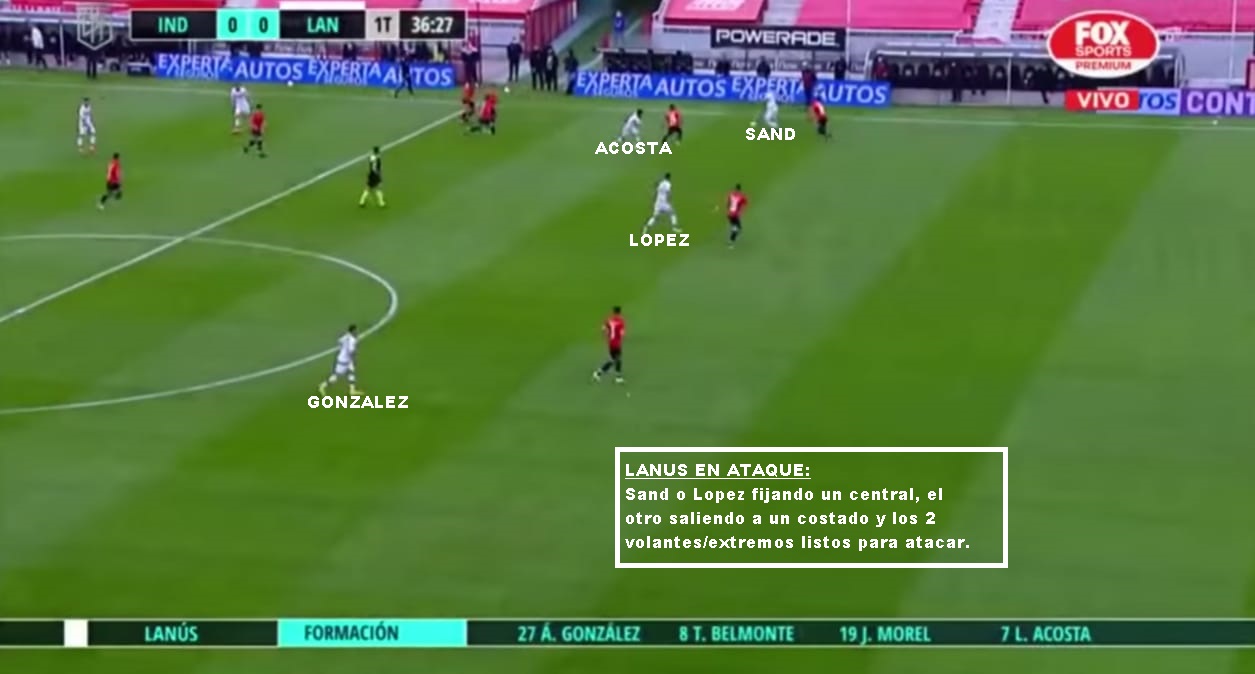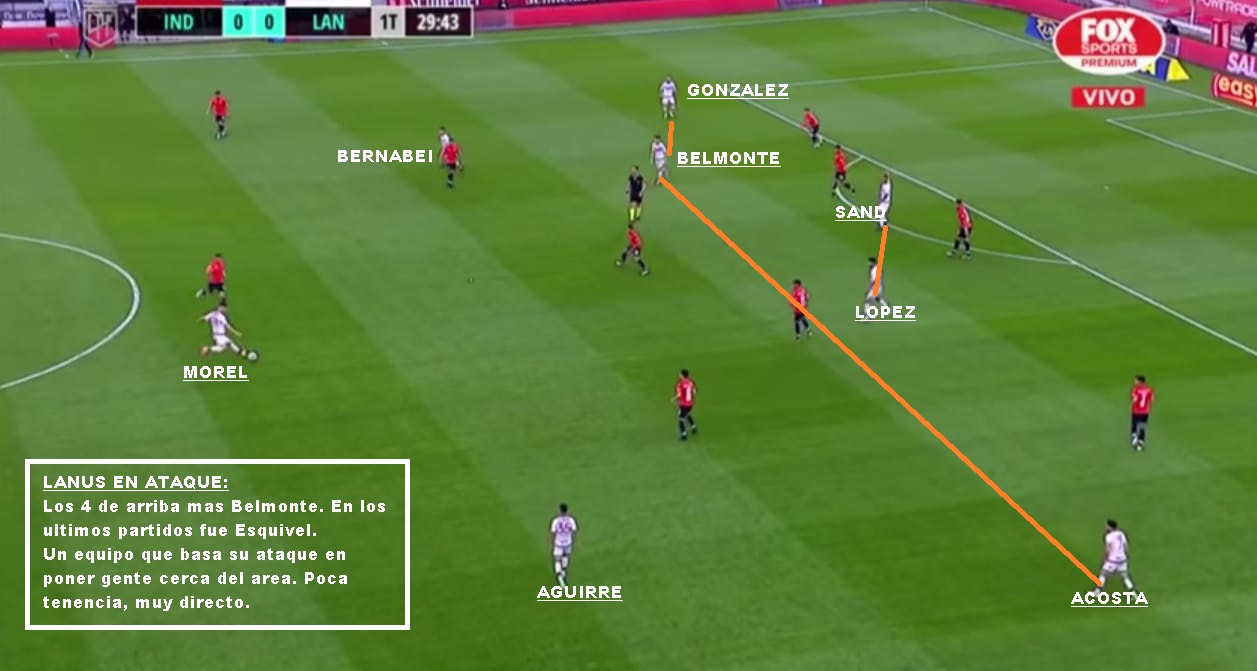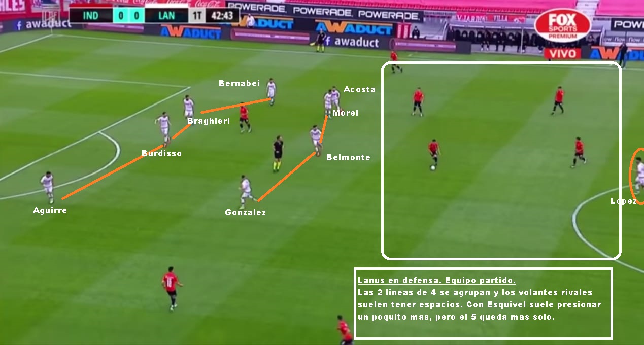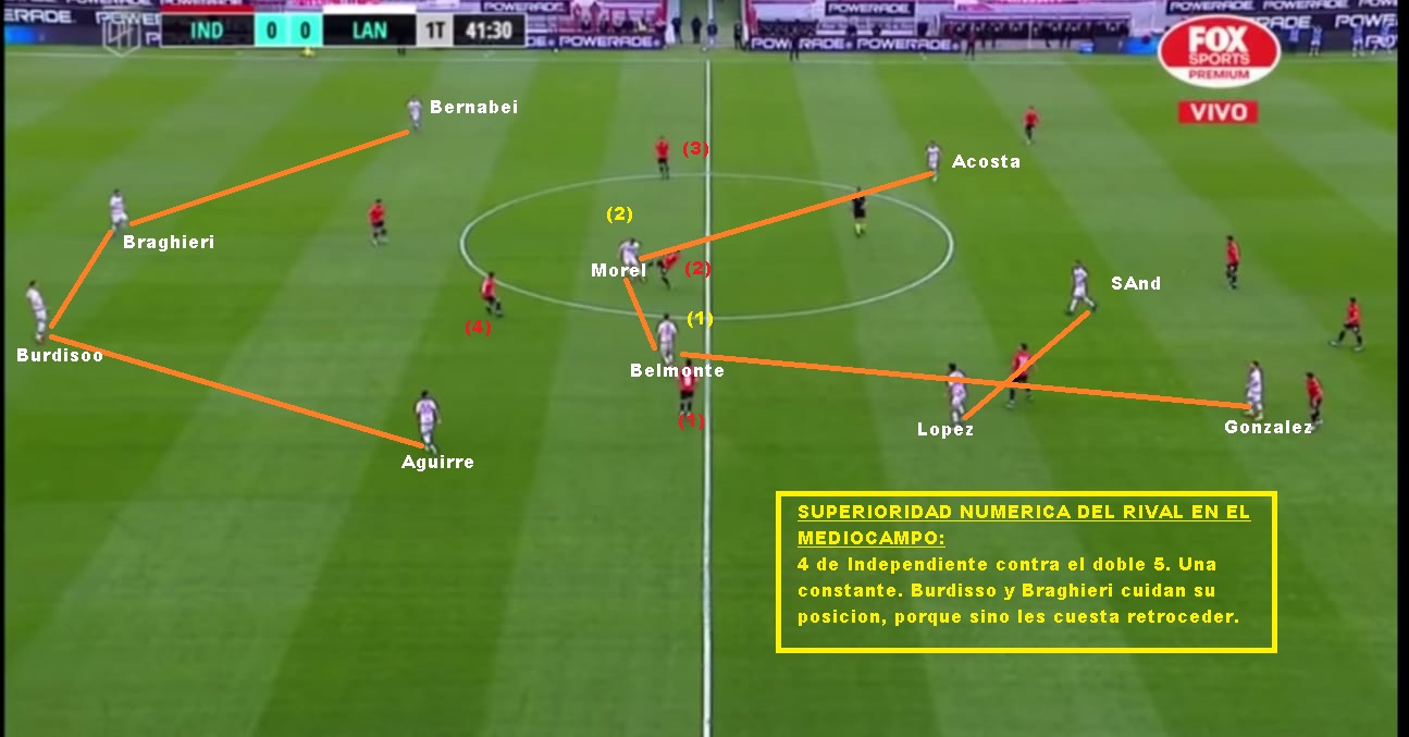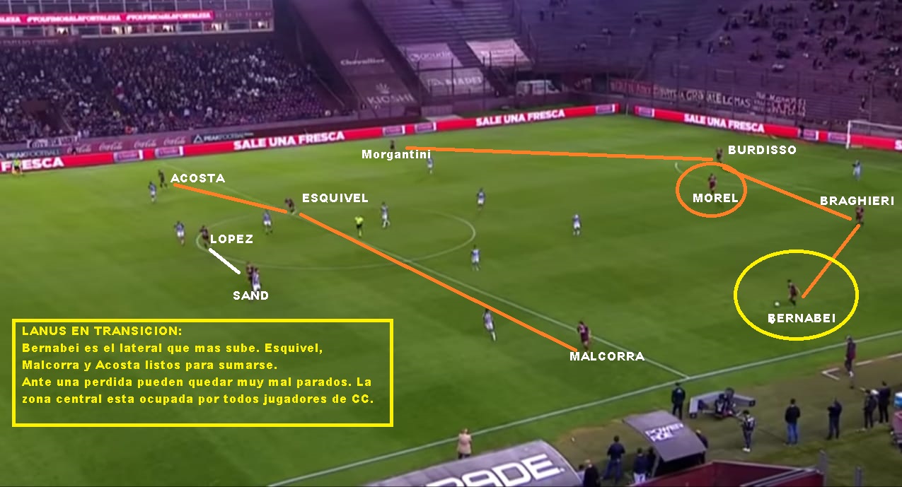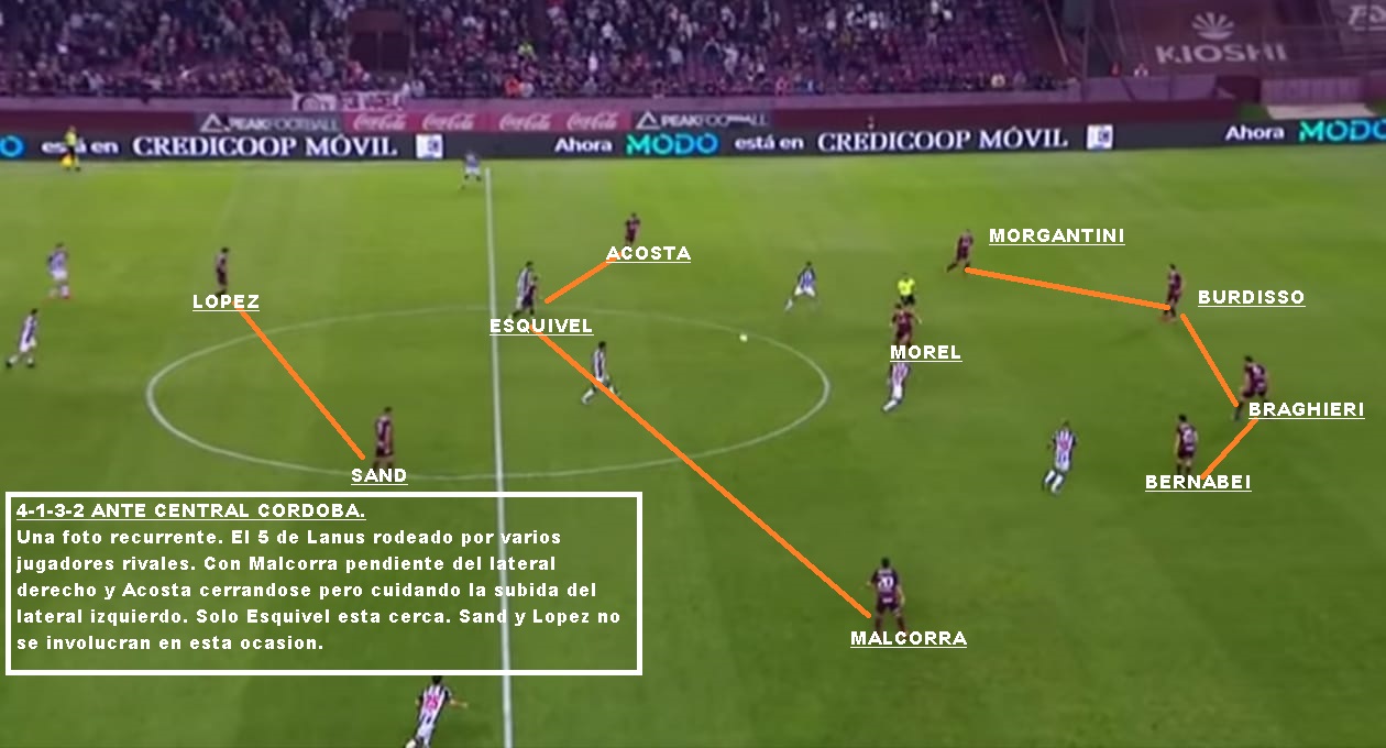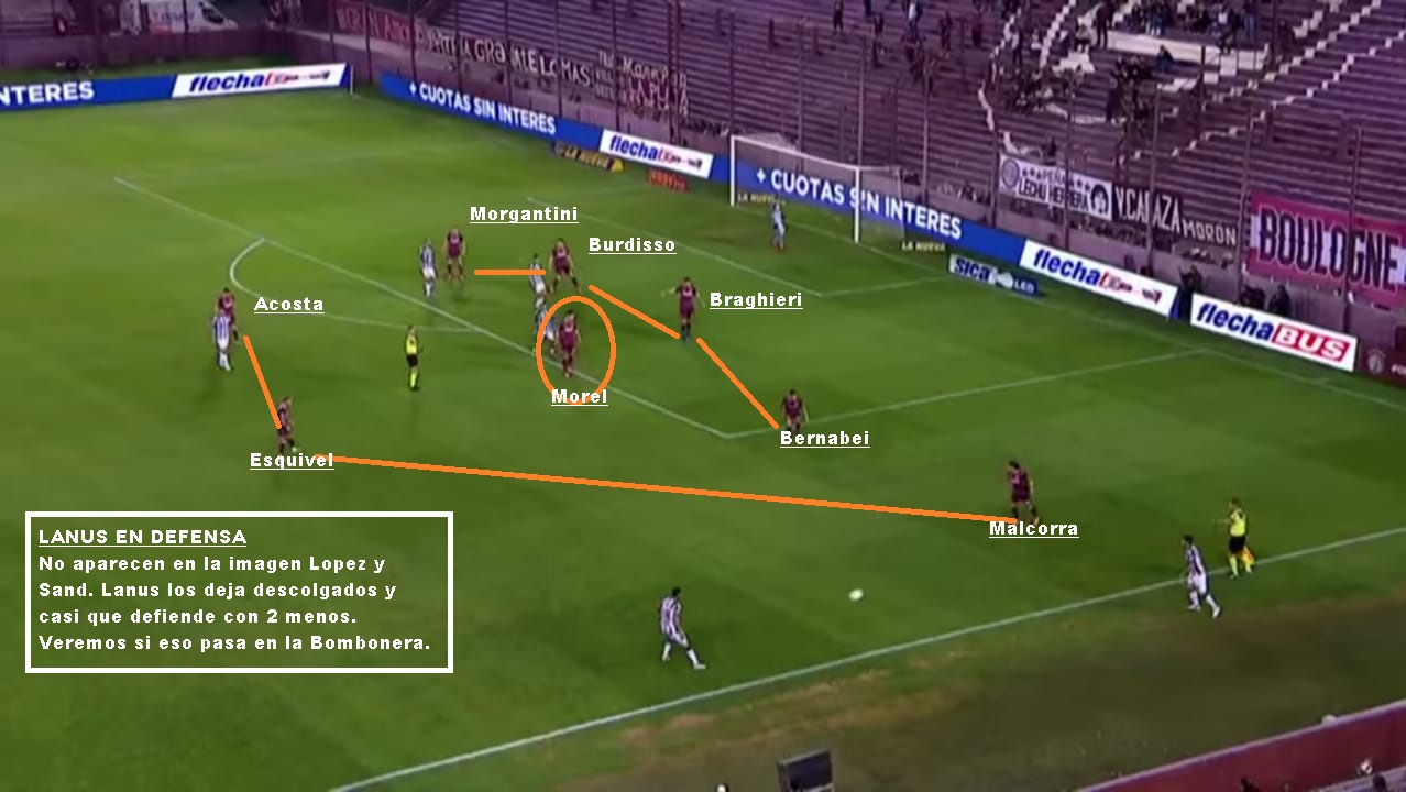- Poca gente en el mediocampo de Lanús. El 4-4-2 de Lanús siempre le deja la iniciativa al rival. Belmonte, Esquivel, González y Malcorra tienen dinámica, pero la forma de ocupar los espacios hace que en general las zonas internas, tengan más jugadores del rival. Campuzano, Montes, Almendra y Cardona pueden generarle superioridad a Belmonte y Esquivel que van por el centro. Hay que ver si la subida de Bernabei no termina teniendo ocupado a Montes. Dependerá del desarrollo.