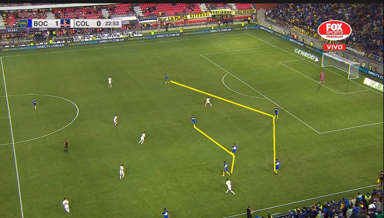 Boca salió vertical, saltando líneas, buscando pasar rápido a posiciones ofensivas. Con un juego menos ordenado desde la pelota, y más desde los espacios, intentando los mano a mano para el desequilibrio, más que el juego asociado y superioridades numéricas.