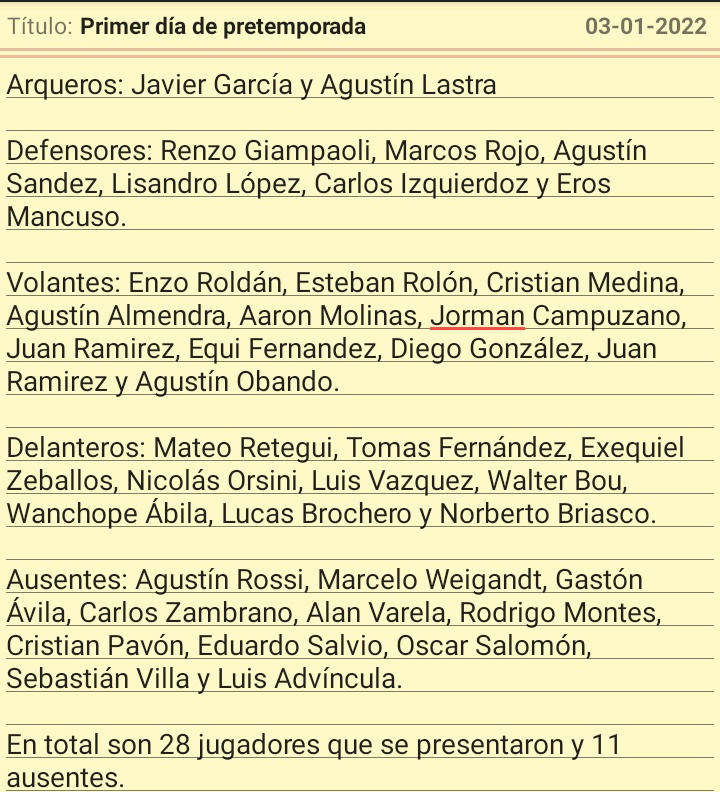 Mientras que Sebastián Villa y Luis Advincula tampoco estuvieron en el comienzo de los trabajos de la pretemporada por problemas en sus vuelos desde Colombia y España, respectivamente.