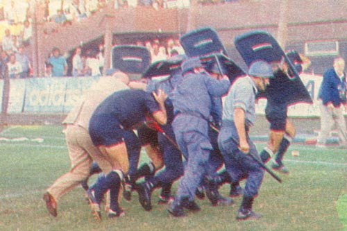 Los primeros gases lacrimógenos despejaron la zona del alambrado y provocaron una corrida de proporciones hacia afuera del estadio. El caos ya era absoluto. Calabria suspendía el partido y escapaba corriendo con sangre en su rostro.