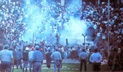De fondo el ruido de las detonaciones y disparos pintaban un panorama desolador. El humo sumaba a la confusión generalizada para todo el mundo menos para una tribuna visitante que seguía abarrotada de hinchas cantando y festejando bajo el rayo del sol. Nadie se quería ir. Esa gente estaba ajena a todo y muy feliz por volver a ganar de visitante luego de diez largos meses.