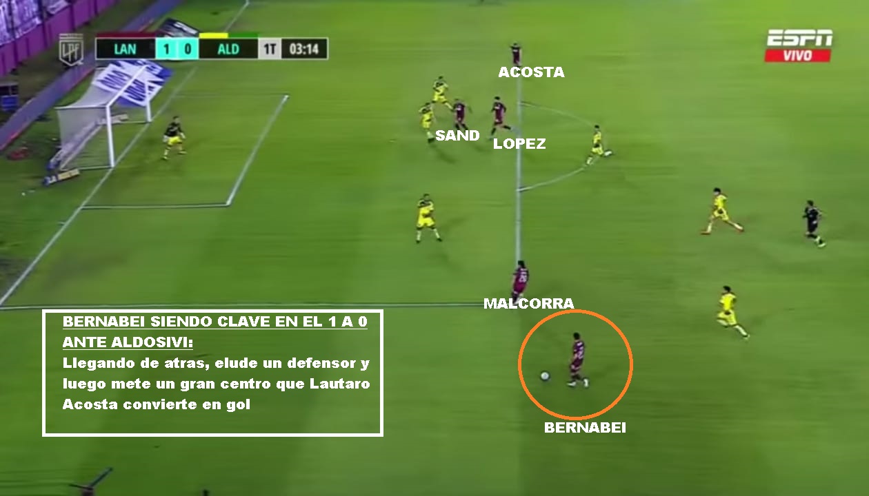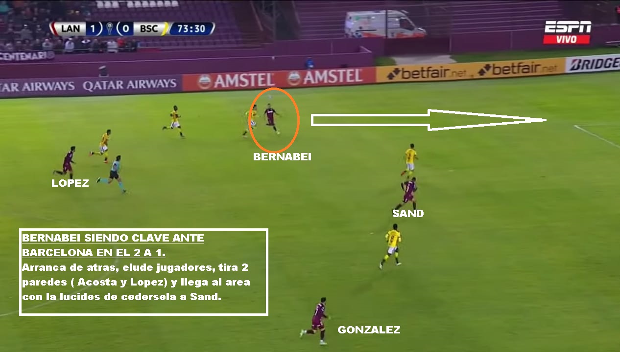 - La subida de Bernabei. El Xeneize suele darle alguna ventaja a los laterales izquierdos rivales. Para este partido quizás el cambio de sistema, le permite taparlo mejor, pero para Lanús las subidas de Bernabei son claves en el sistema, porque ha participado directamente en 3 de los últimos 4 goles del equipo. Sin el zurdo pasando pierden profundidad por izquierda.¿ Irá Zeballos por ese lado o sera Villa quien ataque su espalda?. De esos duelos puede salir mucho.