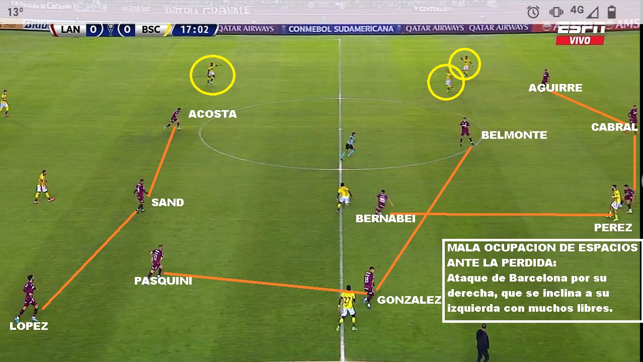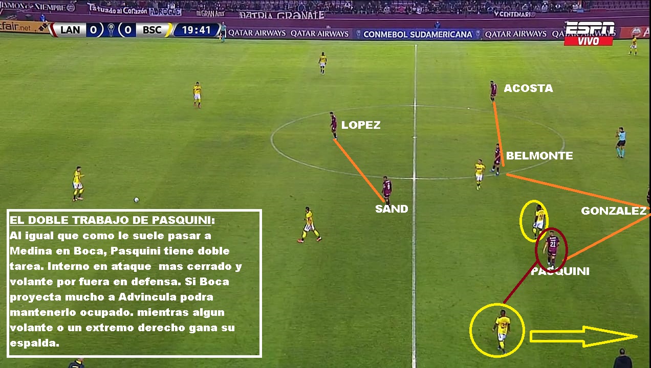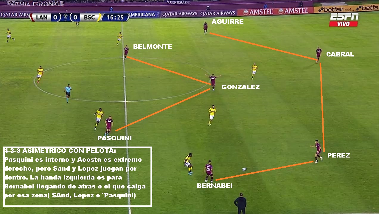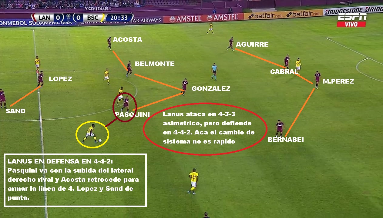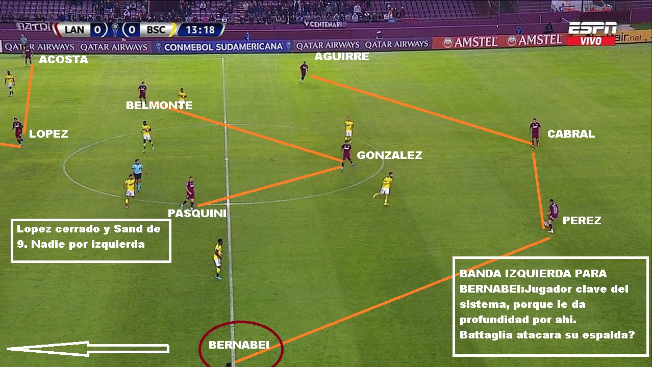 En su etapa anterior, Almirón había apostado claramente por el 4-3-3. Tanto el campeón 2016 como el subcampeon de america jugaban así. 2 internos ( Almirón y Román Martínez en 2016) y 2 extremos ( Acosta y Junior Benitez o Alejandro Silva). Cuando vuelve al club luego de varios años, se encuentra en el plantel con que 2 de sus figuras son 9 y no se adaptan al 4-3-3 jugando juntos. Le costó encontrarle la vuelta, hasta incluso por momentos hasta dejo a alguno de suplente. Hoy encontró en un 4-3-3 asimétrico en ataque y un 4-4-2 en defensa su mejor formula. Lopez y Sand juegan de doble 9, pero aun asi no necesitó apostar por el 4-4-2 con poca gente en el medio. Sigue atacando con 3 volantes ( Belmonte, Gonzalez y Pasquini) y 3 puntas ( Acosta por derecha y Lopez y Sand por dentro). La ausencia de profundidad por izquierda la trata de disimular con un Bernabei que pasa y pasa como lo hizo con Barcelona. El problema de ese estilo de tácticas es que exige mucho a Pasquini ( Interno en ataque y volante por fuera en defensa y no siempre el equipo alcanza a moverse rápidamente para quedar bien acomodado). Con el tiempo irá creciendo como equipo. Será difícil volver a ver el Lanús de Almirón de hace unos años atrás. Un equipo que construia desde abajo, que tenía un idea, que atacaba muy bien por las bandas y que era muy rápido. Ante Boca seguramente buscará ceder un poco la iniciativa, apostando a la capacidad goleadora de sus puntas, a las corridas de Bernabei o Acosta. Un equipo en formación.
