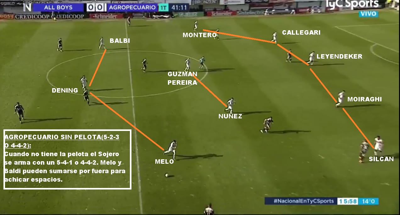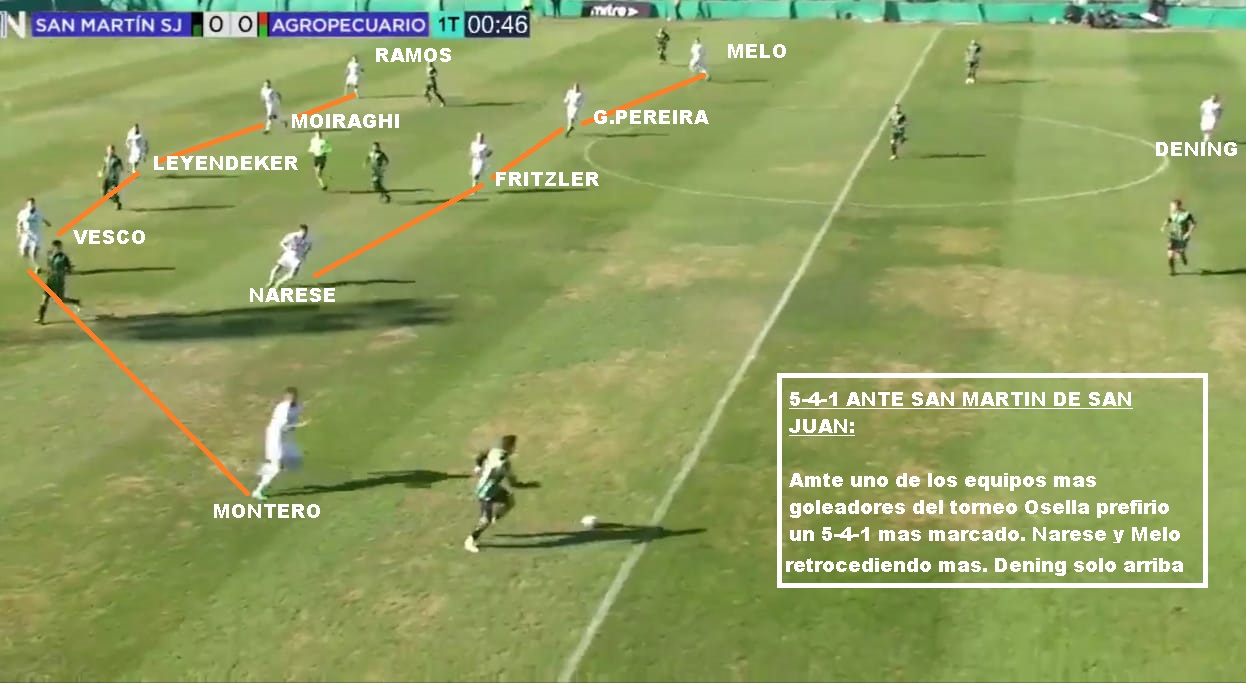 Agropecuario está formado por varios jugadores que no lograron conseguir minutos en equipos de primera y terminaron en el equipo de Casares. Barlasina, Callegari, Leyendecker estuvieron en NOB. Fritzler, Moiraghi y Dening son los de más experiencia en primera división, mientras que Guzmán Pereira tuvo roce en el torneo uruguayo y estuvo en Peñarol. El resto son jugadores que provienen de otros equipos del ascenso. Matías Nuñez y Vesco estuvieron en las inferiores de Racing. El estilo es el de siempre de Osella y el sistema de juego un poco lo indica. Busca achicar espacios en el bloque bajo a partir del un 5-2-3 o 5-4-1 y luego salir rápido. Perdió mucho sin Blando, pero Balbi ante All Boys demostró que puede salir rápido y Melo también. Sino en el banco tiene a Nahuel Luján. Por afuera, Montero y Silcan demuestran hacer bien el doble trabajo. El mediocampo quizás puede quedar muy grande para Pereira y Fritzler. Cambio bastante el estilo al pasar de 2 años de Manuel Fernández al estilo de Osella, aunque es cierto que el 5-3-2 se sigue repitiendo. El año pasado el equipo finalizó 5to.