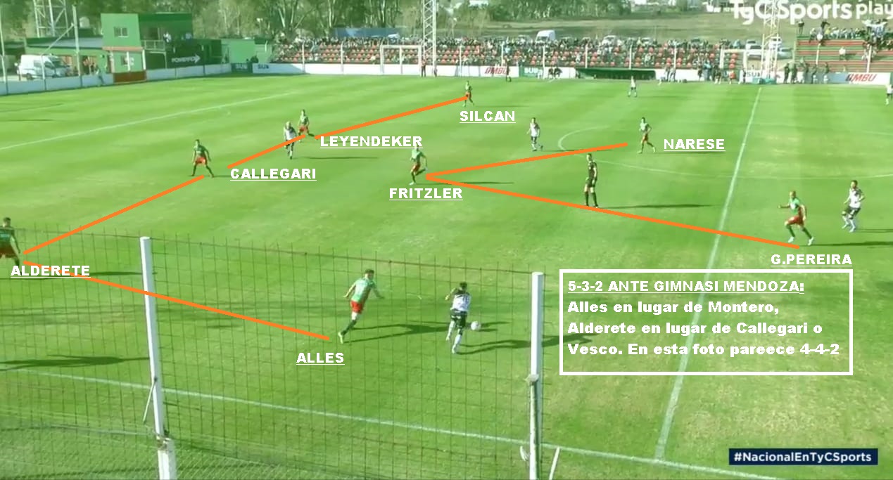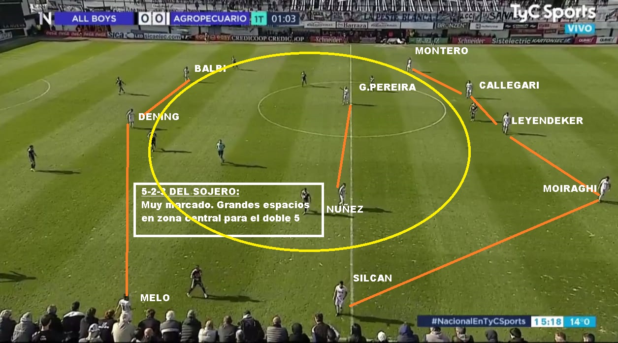 ¿Cómo formará el Sojero?. Algunas dudas para el ex entrenador de NOB: Ante All Boys, Moiraghi terminó con una sobrecarga y está en duda. Ademas volvería Matías Fritzler al mediocampo, por Matias Nuñez. El sistema viene siendo una especie de 5-2-3 que se puede transformar en un 4-4-2. Un probable(5-2-3): Barlasina; Montero, Callegari, Vesco( Moiraghi), Leyendeker, Enzo Silcan; Matías Fritzler, Guzman Pereira; Alan Balbi, Emanuel Dening y Alejandro Melo. Narese viene de una lesión, pero si estuviera disponible, seguramente entraría por Balbi o Melo. Alejandro Melo y Montero son los que le permiten cambiar de sistema y acomodarse en un 4-4-2. Montero es el carrilero derecho, pero suele ganar más altura que Silcan, el carrilero izquierdo.