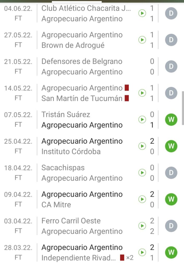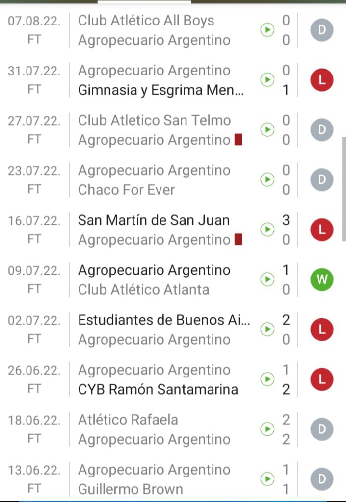 ¿Cómo llega Agropecuario? El equipo de Diego Osella llega mal. Lejos quedó esa victoria ante Racing y ese gran momento (Llegó a 13 sin perder en ese momento). Hoy acumula 5 encuentros sin ganar e incluso sin anotar goles. El último gol lo anotó Brian Blando en el triunfo ante Atlanta. Hoy el goleador ya no está, porque fue transferido a Lanús. Sin él, llevan 5 encuentros sin marcar. Si tomamos en cuenta los últimos 10 encuentros, serian 1 triunfo, 5 empates y 4 derrotas. Osella asumió el 23 de marzo y en sus primeros 12 encuentros estuvo invicto (5 victorias y 7 empates), pero luego de superar a Racing y con la salida de Blando el equipo no pudo mantener los buenos resultados. En el total del ciclo serian 22 encuentros con 6 triunfos, 12 empates y 4 derrotas (45%). El fin de semana empató con All Boys en Floresta ( 0 a 0). En la Copa Argentina eliminó a Almirante Brown ( Con Fernández como técnico) y a Racing ( Con Osella). En la Primera Nacional marcha en el puesto 24 ° con 32 unidades (6 triunfos, 14 empates y 7 derrotas)