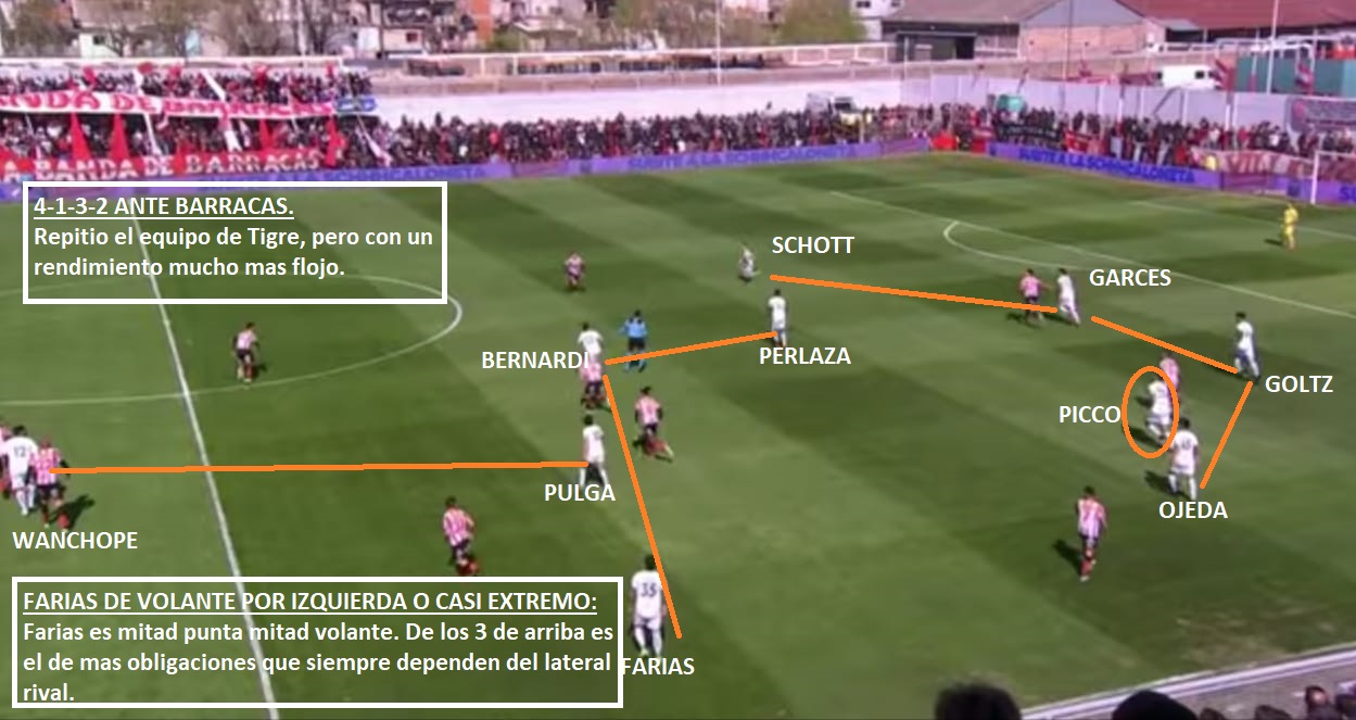 ¿Cómo formará el equipo de Marini?. Parece que se vienen cambios luego del mal encuentro ante Barracas. Uno es obligado por las 5 amarillas de Picco ( Ingresa Julián Chicco). También puede volver Eric Meza al lateral derecho luego de la lesión, en lugar de Schott. El resto pueden ser cambios tácticos. Rafa Delgado u Ojeda es una de las dudas. También podrían ingresar Pierotti y Juan Álvarez por Perlaza y Facundo Farias, respectivamente. Todavia no esta confirmado el equipo con estas dudas. Un probable: Chicco; Meza, Garcés, Goltz, Delgado; J.Chicco; Perlaza(Pierotti), Bernardi, Farias(Alvarez); Pulga Rodríguez, Wanchope Ábila. El sistema es un 4-4-2 o 4-1-3-2 similar al que enfrentamos el domingo pasado con Atlético Tucumán. La diferencia quizás está en que si juega Farías por momentos es un 4-3-3 o un 4-4-2 muy asimétrico. Pulga Rodríguez estuvo con alguna molestia en la semana, pero jugaría.