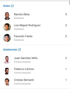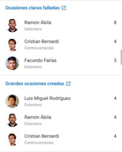En lo individual, como es lógico en un equipo que viene mal, hay poco para destacar. Wanchope Abila es el goleador con 5 tantos, pero viene de una sequía de 6 encuentros sin convertir. Tiene también 8 ocasiones claras falladas (2do en ese rubro en el torneo, por detrás de Bareiro que tiene 9) y 4 grandes ocasiones creadas. Tiene 2 disparos por encuentro (0.5 al arco) y también promedia 1.2 pases claves. Otro jugador importante obviamente es el «Pulga» Luis Rodríguez. 3 goles (2 ante Tigre hace poco) más 4 grandes ocasiones creadas. Promedia 1.1 pases claves y 2.5 disparos por encuentro, de los cuales 1 va al arco. También podemos hablar de Cristian Bernardi, que tiene 1 gol, 1 asistencia y 4 grandes chances creadas en este torneo, así como también tiene 4 grandes chances falladas. Promedia 1.4 pases claves,1.3 regates y 4 duelos ganados por encuentro. En defensa un jugador importante por lo que significa es Paolo Goltz. Su torneo no es el mejor, pero promedia 4.7 despejes, 1.9 quites, 1.2 intercepciones y además 6 duelos ganados por encuentro (65%). Tiene 4.2 pases largos precisos. Por último hablar de Ignacio Chicco. Tuvo la difícil tarea de reemplazar a Burian en un contexto complejo y respondió bien. Promedia 3.4 atajadas por encuentro ( aunque con un 75%) y atajo 1 de 2 penales que le tiraron.