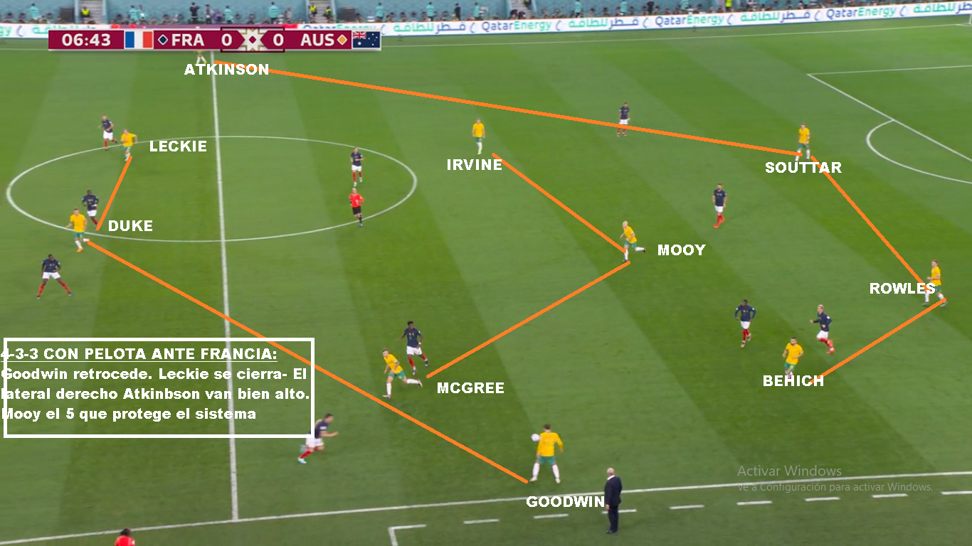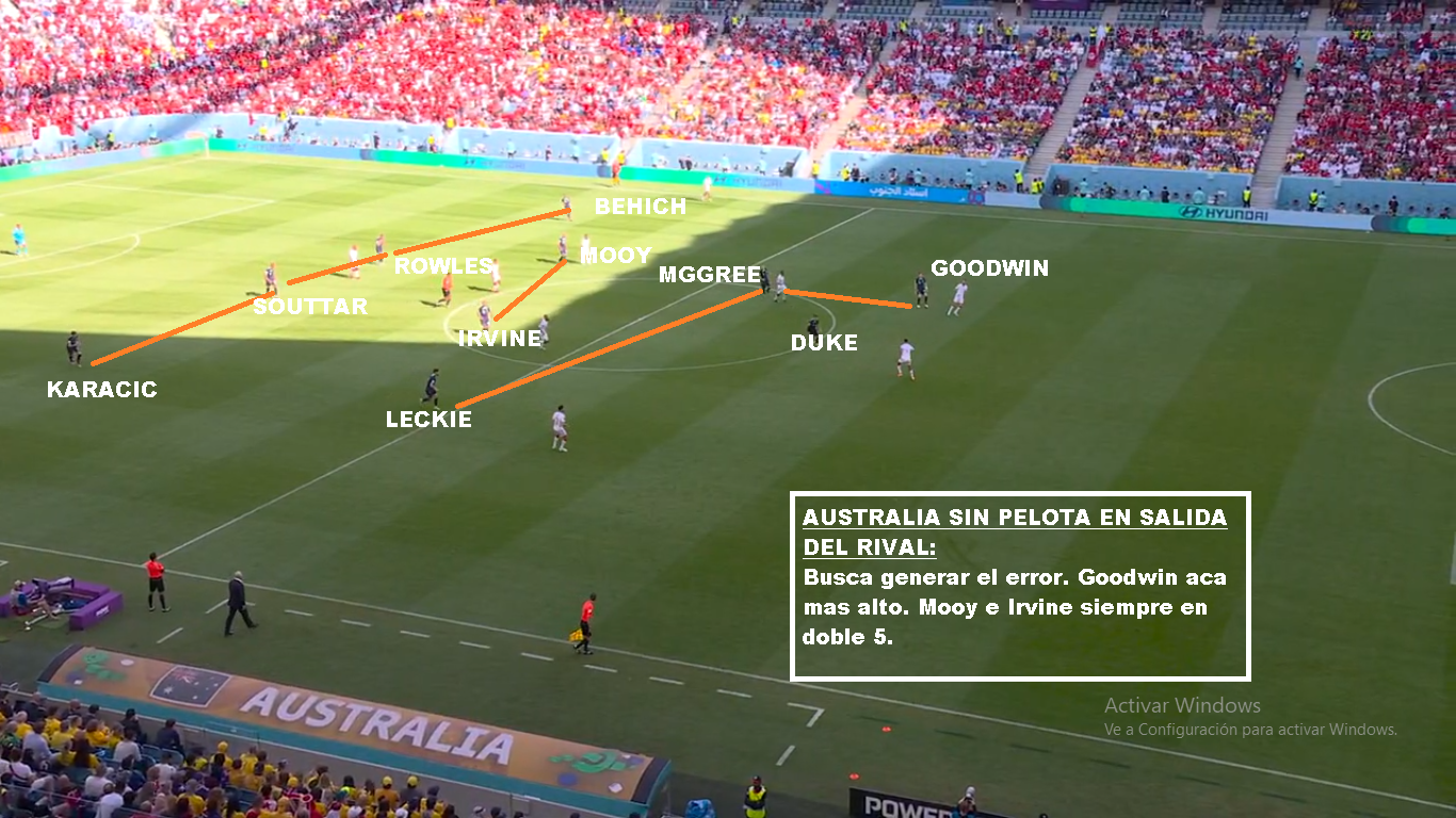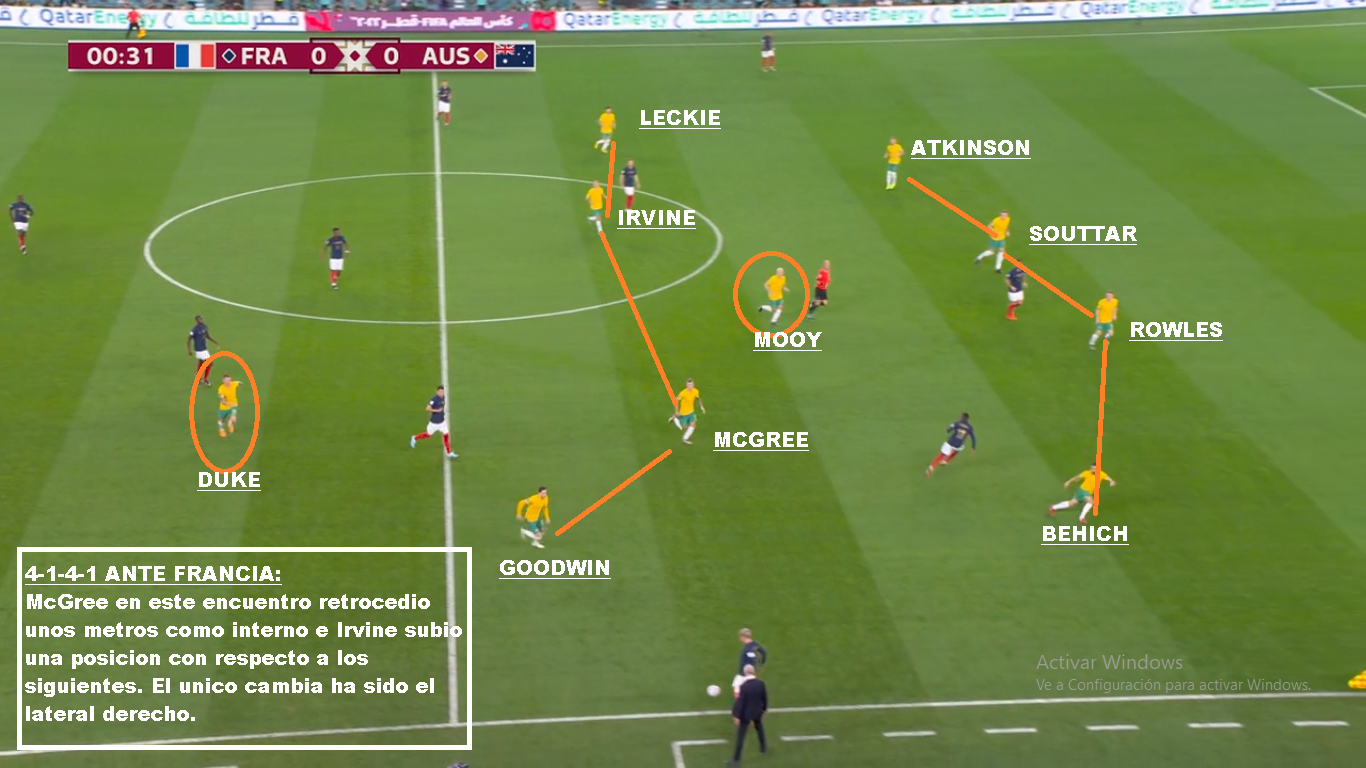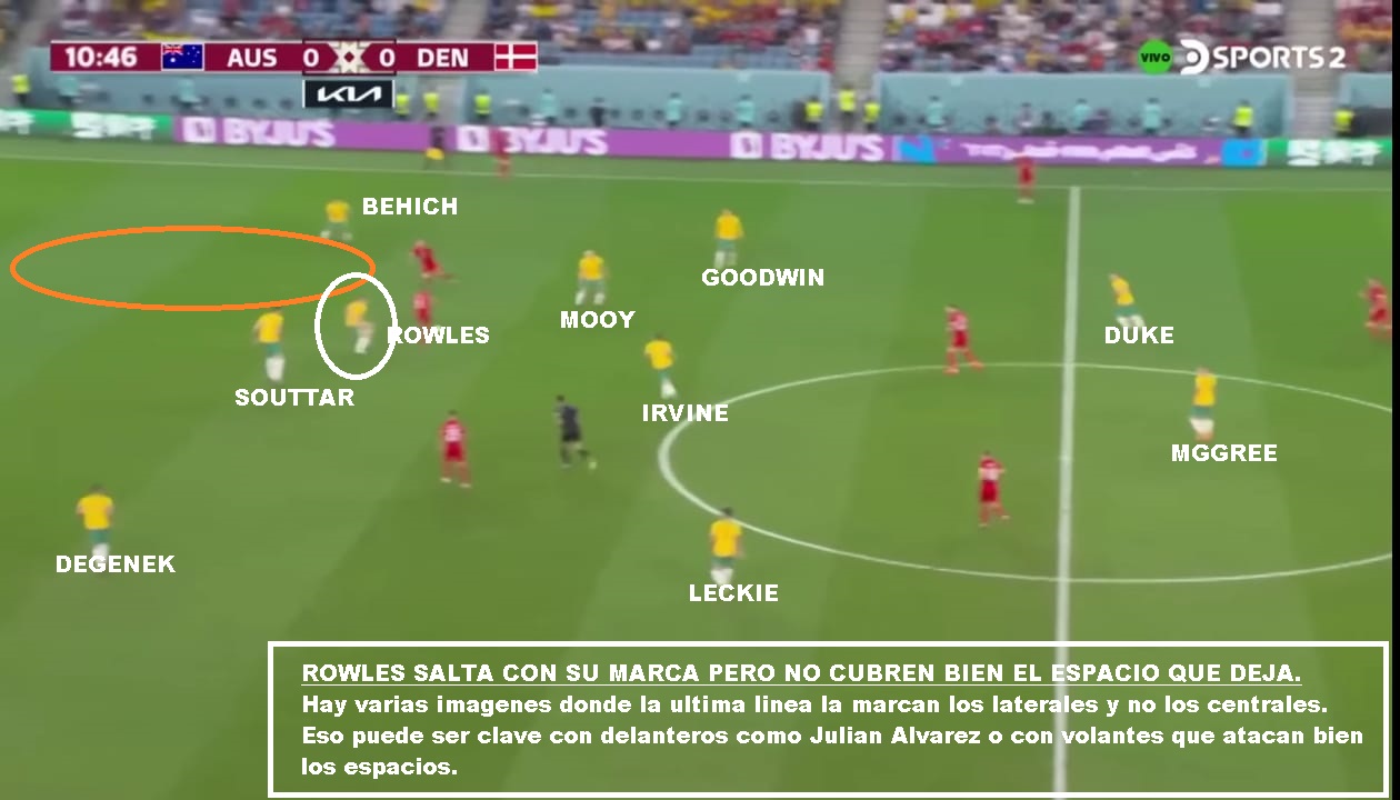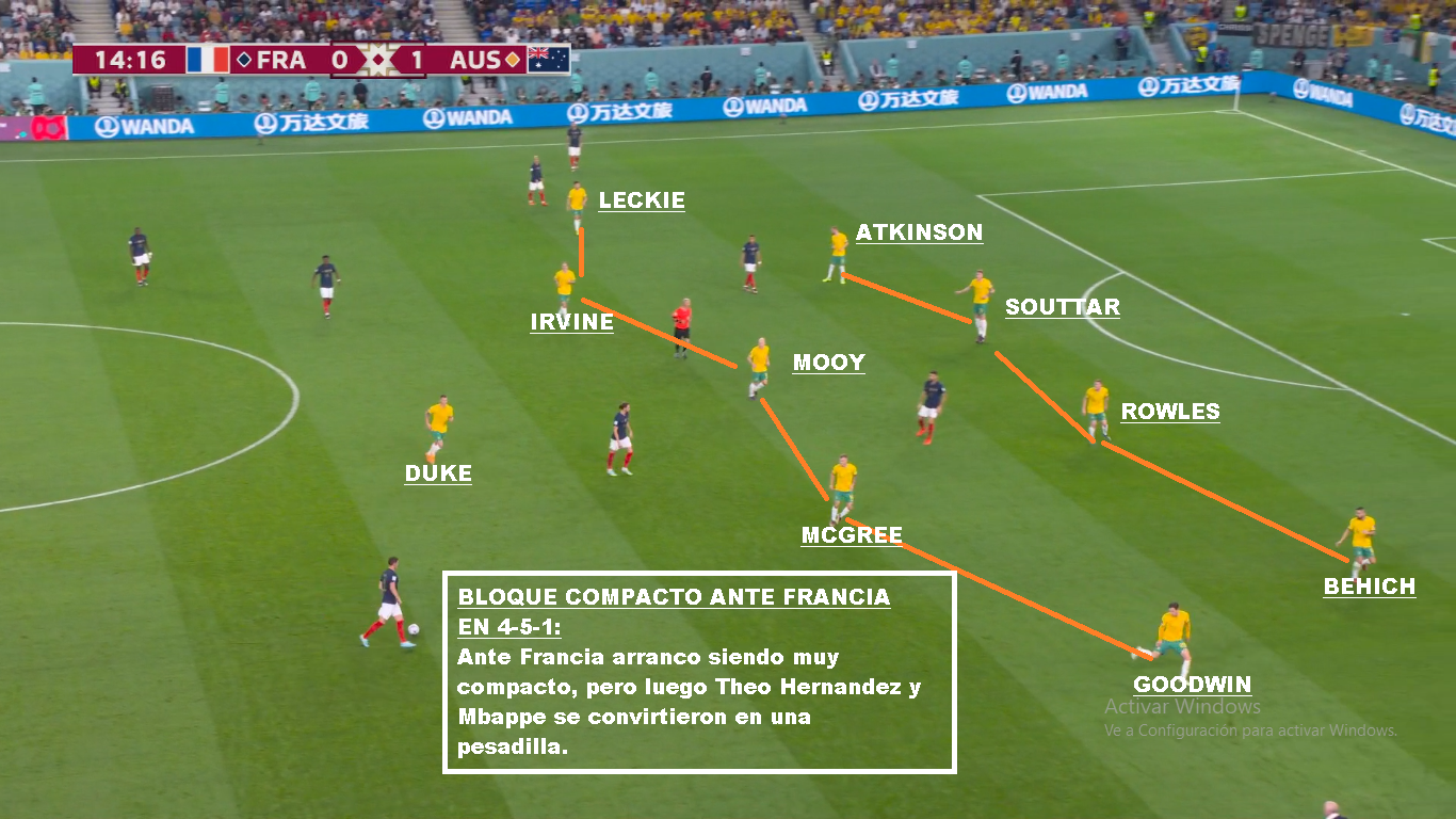 Australia es un buen equipo, que llega a esta instancia por lo que ofrece colectivamente. Es un equipo solidario, donde todos corren y cierran espacios. Más allá de las similitudes con Polonia por su poca posesión, son equipos diferentes. Los Australianos salen mucho más rápido en transición y presionan un poco más alto, si el rival no está cómodo. Una vez que el rival sale comodo, repliegan más. Buscan forzar el error, para castigarlo. La diferencia con Polonia, es que mientras lo Europeos tienen al 9 del Barcelona, al 10 del Napoli y al arquero de la Juve, acá el jugador de más nivel juega en el Celtic de Escocia (Mooy). Goodwin y Leckie juegan en la Liga Australiana, Duke el 9 juega en la 2da de Japón, Irvine juega en la Bundesliga 2, Souttar y McGree juegan en Championship (2da de Inglaterra). Y la mayoría de los casos son similares. No tienen jerarquía, pero sí un gran sistema colectivo. Que haya perdido con Arabia en eliminatorias y que haya quedado tan lejos en las posiciones, puede ser una medida para Argentina. También que le haya ganado por tan poco a la Emiratos Árabes del Vasco o la Perú de Gareca. Hay mucha diferencia de jerarquía, pero luego son 11 contra 11. El equipo de Arnold, busca atraer las presiones rivales, para saltar con los laterales altos o buscando en juego aéreo a los extremos. Duke suele retroceder bien para evitar que lo anticipen. Si logran recibir la 2da pelota, son peligrosos. Leckie y Goodwin son rápidos, McGree tiene talento ( Juega en el Middlesbrough). Sus mayores debilidades están en las bandas. El lateral derecho ha sido cambiado, porque siempre le llegan por esa zona. Mbappe bailo a Atkinson y Karacic evidentemente no convenció ante Túnez. Es la hora de Degenek, que además te suma cm para el juego aéreo. Si de juego aéreo hablamos hay que decir que tiene mucha altura. Souttar (1.98), Degenek(1.87), Irvine (1.89), Rowles(1.85), Duke (1.85). Leekie y Goodwin también superan los 180 cm. Otro equipo alto, que sin embargo ante Francia recibió 3 goles de cabeza, por marcar mal, los centros laterales. En síntesis, Argentina es mucho más que Australia y debería ganarle si tiene paciencia y si no comete errores graves. Será cuestión de repetir lo que se hizo contra Polonia.