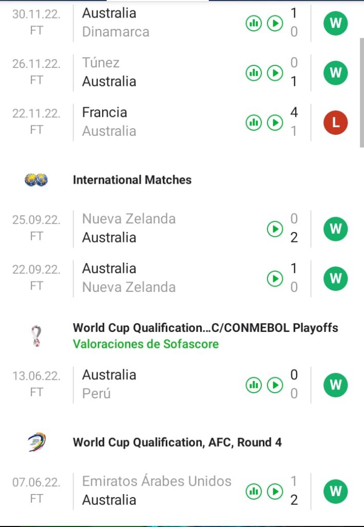 ¿Cómo llega el equipo Australiano?. Octavos de final de un mundial. Imposible llegar mejor para ellos. Ya hicieron mas de lo que imaginaban seguramente. Terminaron segundos por detrás de Francia en el Grupo D, por encima de Túnez y Dinamarca. Su clasificación al mundial fue muy complicada. Fue líder en el grupo B en la 2da ronda, sacando 24 de 24 puntos ante Kuwait, Jordania, Nepal y Taipei Chino. Luego compartió grupo con Arabia Saudita y Japón, terminando por detrás de ambos y solo con 1 punto por encima de Omán. Ese 3er lugar le dio la posibilidad de jugar para ir al repechaje. Se enfrentó al Emiratos Árabes del Vasco Arruabarrena venciendolo solo 2 a 1. El ganado de ese partido jugaba contra Perú por un pasaje a Qatar. Triunfo por penales, luego de un 0-0 muy cerrado. En la zona primero perdió 4 a 1 contra Francia, pero luego se recuperó venciendo a Túnez y Dinamarca por 1 a 0. En este 2022, ha disputado 12 encuentros con 7 triunfos, 2 empates y 3 derrotas (Japón, Arabia y Francia). Desde la llegada de Graham Arnold son 34 encuentros con 23 victorias, 4 empates y 7 derrotas.