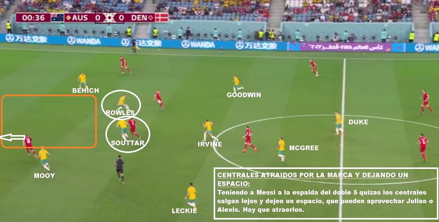 - Pérdidas de pelota y transición de Australia: Argentina en los primeros partidos perdió muchas pelotas riesgosas que le daban la oportunidad al rival de correr. Las imprecisiones de De Paul, las gambetas fallidas de Messi o Di Maria porque son los que toman riesgos. Hay que evitarlas porque Australia busca esos errores para salir rápido. Así se lo hizo sentir a Dinamarca en el último encuentro. Quizás si Scaloni pone a Paredes, juntandolo con Enzo Fernandez, puede tener posesiones más seguras y además atraer al doble 5 Australiano para atacar su espalda.