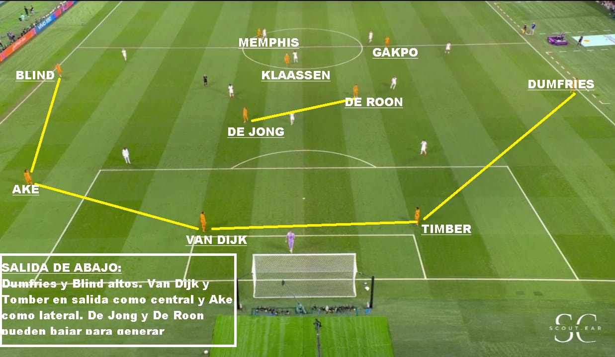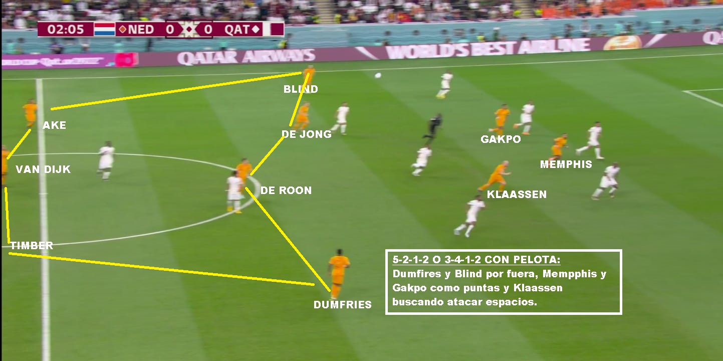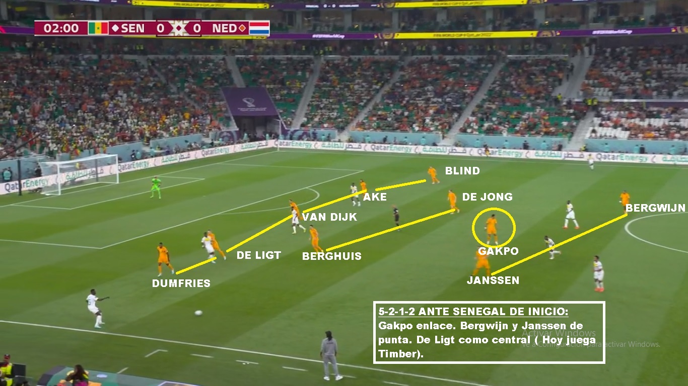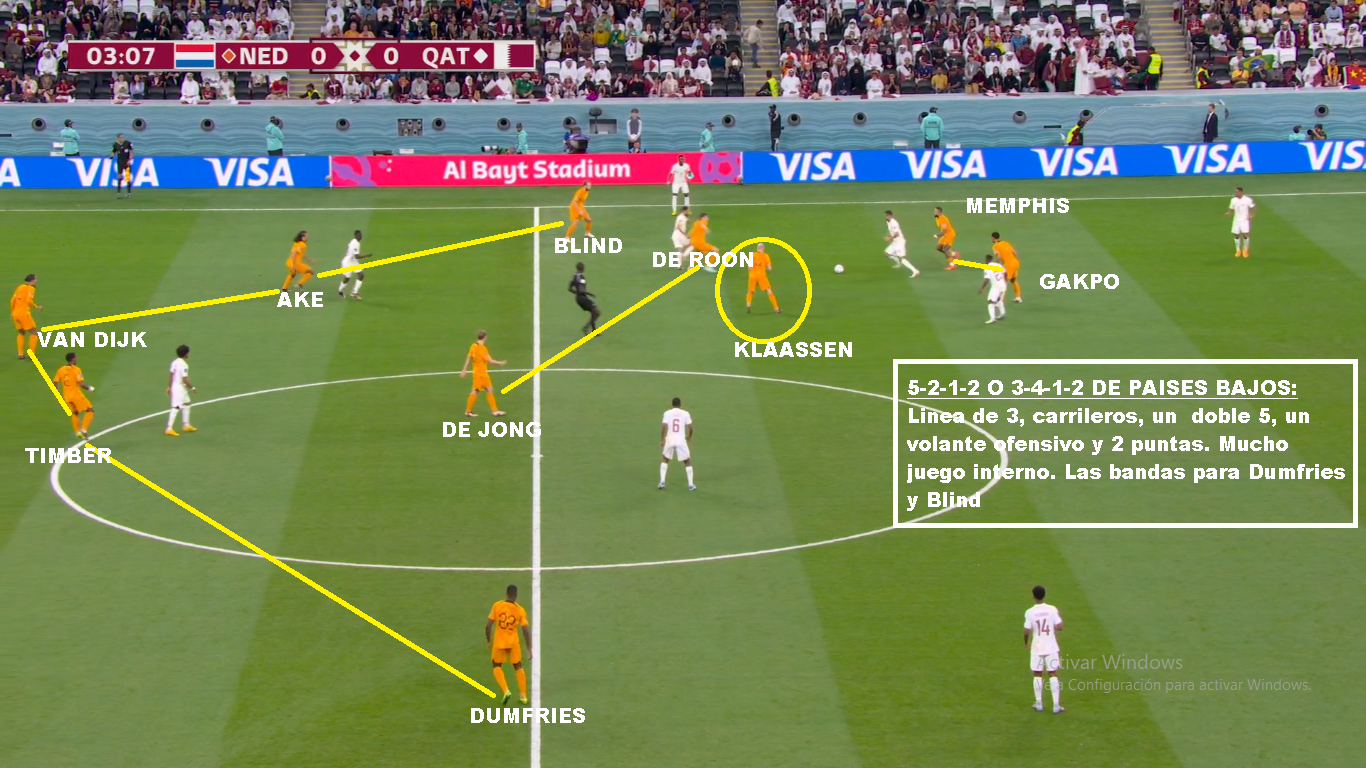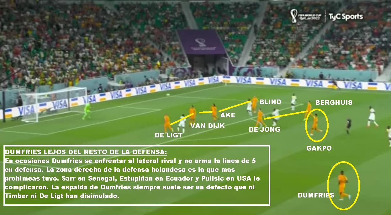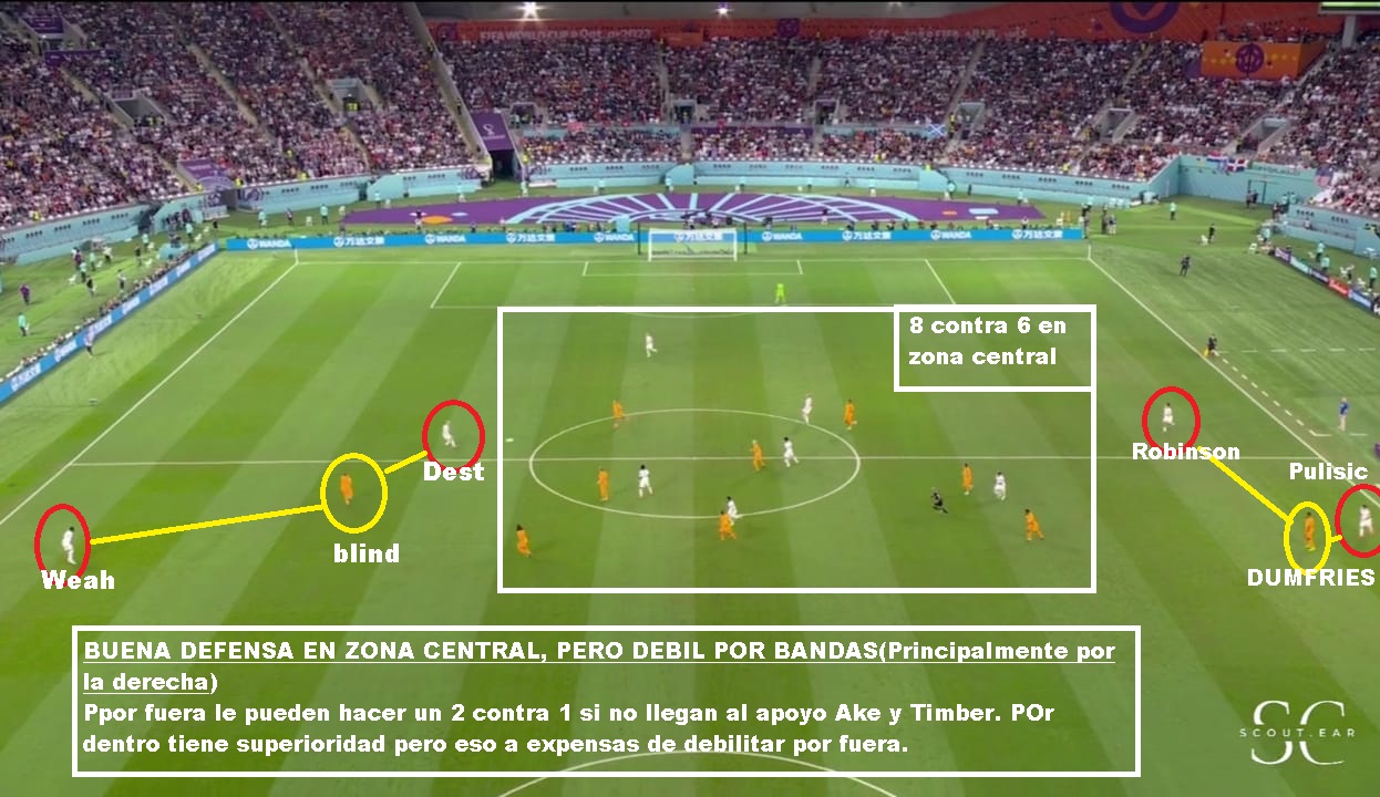 Si vamos más al detalle táctico, es un equipo que siempre juega con 3/5 atras, un doble 5, un volante ofensivo y 2 puntas. Las características de los centrales y carrileros, le permiten acomodarse con 4 si es necesario en salida, o muchas veces se suma Frankie De Jong para generar superioridad. Tiene mucha gente por dentro y busca combinaciones con mucho 3er hombre, para luego salir de esa zona y terminar por fuera. Entre sus armas mas peligrosas están los carrileros. Dumfries principalmente, porque va con mucha velocidad y fuerza. Blind aporta inteligencia y buen pase, pero no tanto desborde. Defensivamente puede sufrir por esa zona. Hay equipo que mandan lateral y extremo al ataque y le hacen el 2 contra 1, pero los centrales siempre están atentos para corregir esa inferioridades. En el lado Dumfries es donde más problemas ha tenido. Sarr en el debut ante Senegal, Estupinan de Ecuador y Pulisic y Robinson en USA: En salida es un equipo que busca atraer, porque tiene centrales de buena salida y principalmente por De Jong que suele romper bien esas presiones. SI le das espacios arma rápido sus jugadas. Sin pelota suele salir arriba cuando el rival sale de abajo, pero una vez que el rival se instala en posicional se acomoda en 5-2-1-2 en un bloque más bajo, pero adelantado.