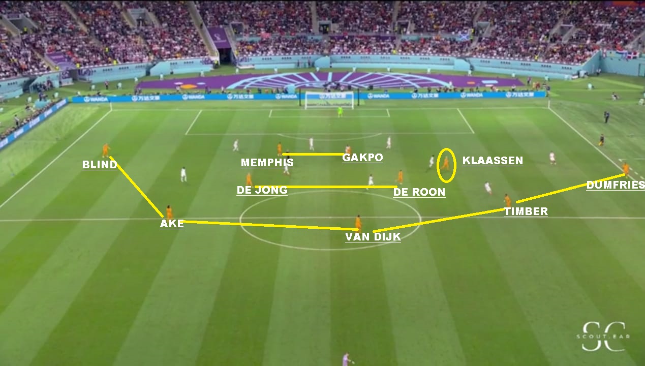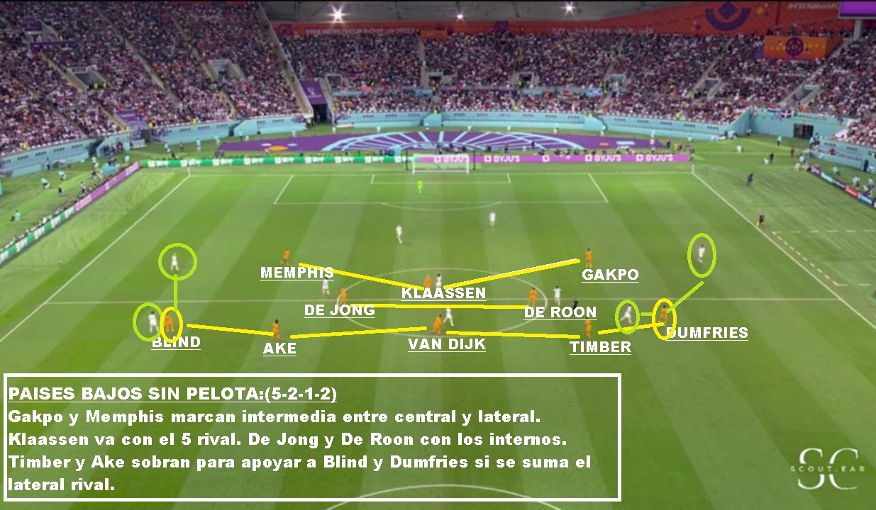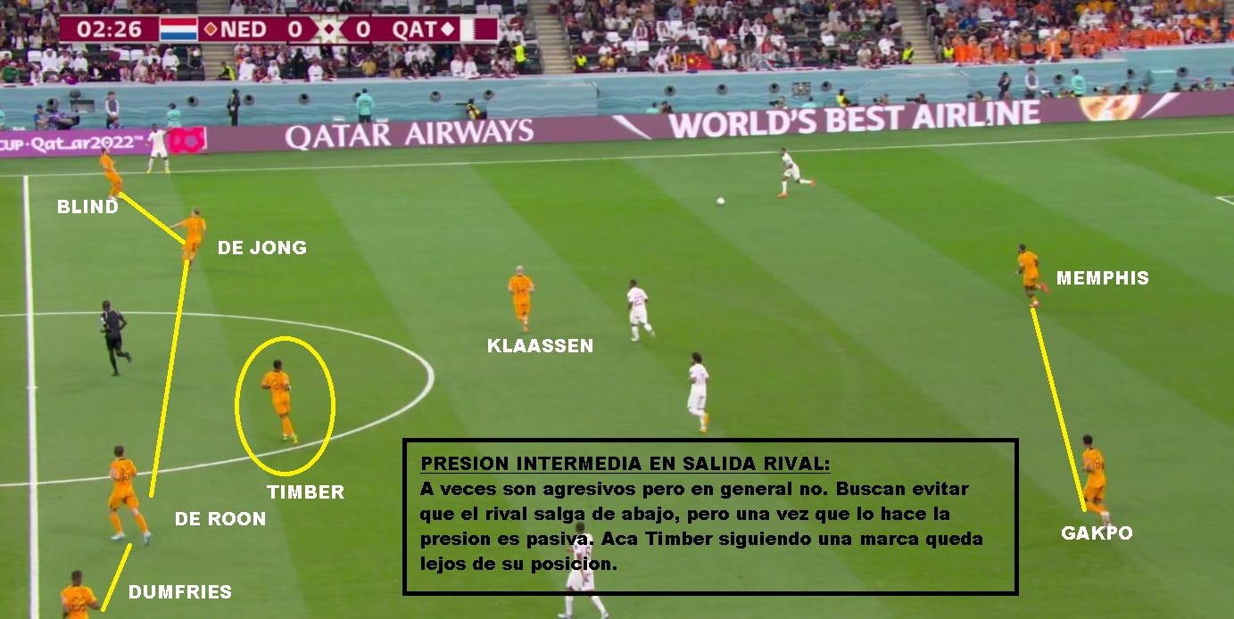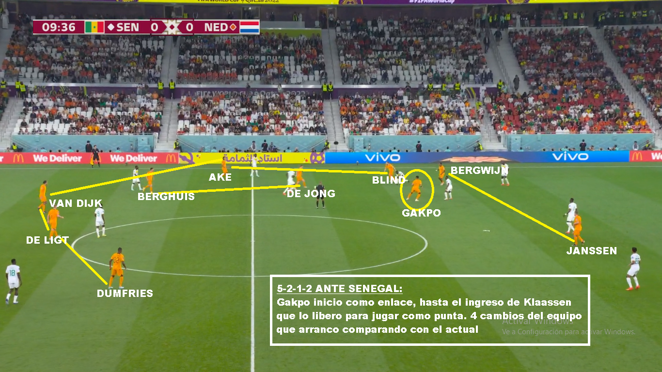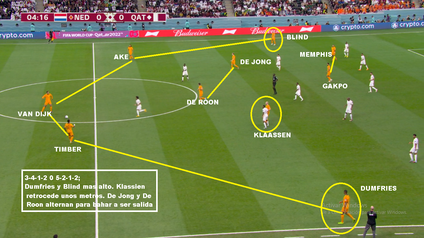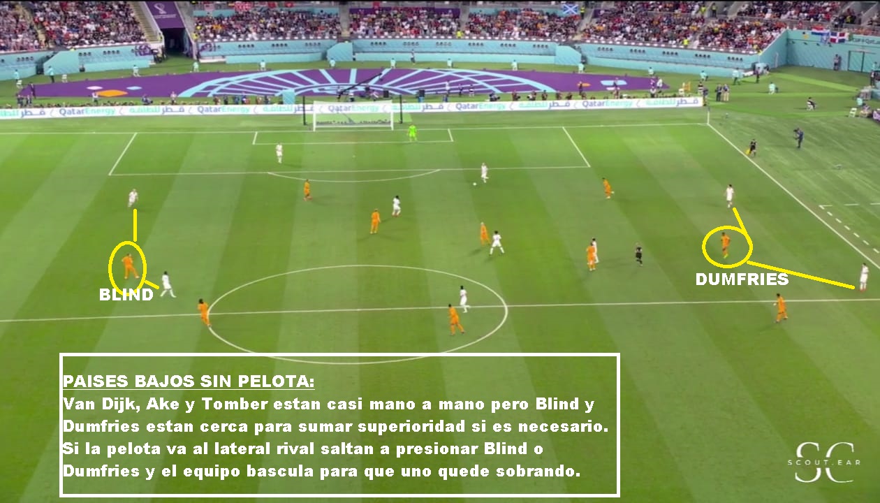 Si vamos más al detalle táctico, es un equipo que siempre juega con 3/5 atras, un doble 5, un volante ofensivo y 2 puntas. Las características de los centrales y carrileros, le permiten acomodarse con 4 si es necesario en salida, o muchas veces se suma Frankie De Jong para generar superioridad. Tiene mucha gente por dentro y busca combinaciones con mucho 3er hombre, para luego salir de esa zona y terminar por fuera. Entre sus armas mas peligrosas están los carrileros. Dumfries principalmente, porque va con mucha velocidad y fuerza. Blind aporta inteligencia y buen pase, pero no tanto desborde. Defensivamente puede sufrir por esa zona. Hay equipo que mandan lateral y extremo al ataque y le hacen el 2 contra 1, pero los centrales siempre están atentos para corregir esa inferioridades. En el lado Dumfries es donde más problemas ha tenido. Sarr en el debut ante Senegal, Estupinan de Ecuador y Pulisic y Robinson en USA: En salida es un equipo que busca atraer, porque tiene centrales de buena salida y principalmente por De Jong que suele romper bien esas presiones. SI le das espacios arma rápido sus jugadas. Sin pelota suele salir arriba cuando el rival sale de abajo, pero una vez que el rival se instala en posicional se acomoda en 5-2-1-2 en un bloque más bajo, pero adelantado.