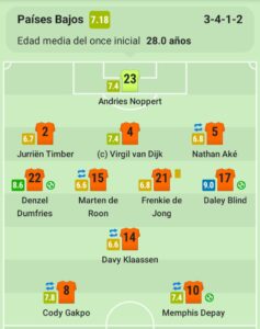 ¿Cómo formará el equipo Naranja?. Van Gaal viene repitiendo equipo ante Qatar y USA. Imaginamos que saldrá con lo mismo. Un 5-2-1-2 o 3-4-1-2. Del equipo que arrancó al actual hay 4 cambios. Un probable para mañana: Noppert; Timber, Van Dijk, Aké; Dumfries, De Roon, De Jong, Blind: Klaassen; Gakpo, Memphis. El otro dia ingreso Koopmeiners y Bergwijn por Klaassen y De Roon en el entretiempo y tranquilamente podría ser una prueba pre Argentina.