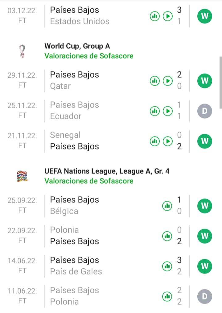 ¿Cómo llega Países Bajos?. El equipo de Van Gaal llega bien. Desde que asumió el entrenador no ha perdido, se metió en semis de Nations League y en este Mundial quedo líder en la primera fase y superó con claridad a USA. Aún no encontró su mejor versión en Qatar y está lejos del nivel de Nations League, pero el objetivo de estar entre los 8 mejores lo consiguió. Ahora busca meterse entre los 4 mejores, como lo hizo en 3 de los últimos 4 mundiales que participó ( En 2002 y 2018 no clasificó). Con el actual entrenador lleva 14 triunfos y 5 empates en 19 encuentros. Si sumamos el pasado proceso de Louis estaríamos hablando de 33 triunfos, 12 empates y solo 3 derrotas como entrenador de la Naranja. En este mundial lleva 3 triunfos y 1 empate, con 8 goles a favor y 2 en contra. En este 2022 también quedó líder del Grupo 4 de Nations League, por encima de Bélgica, Polonia y Gales sacando 16 puntos de 18. Un gran año. Argentina busca cortarle la racha. En cuanto a rendimiento, creo que ante Ecuador y Senegal sacó más puntos de los que merecía. USA por momentos lo complicó. Ha sido más efectivo que los rivales.