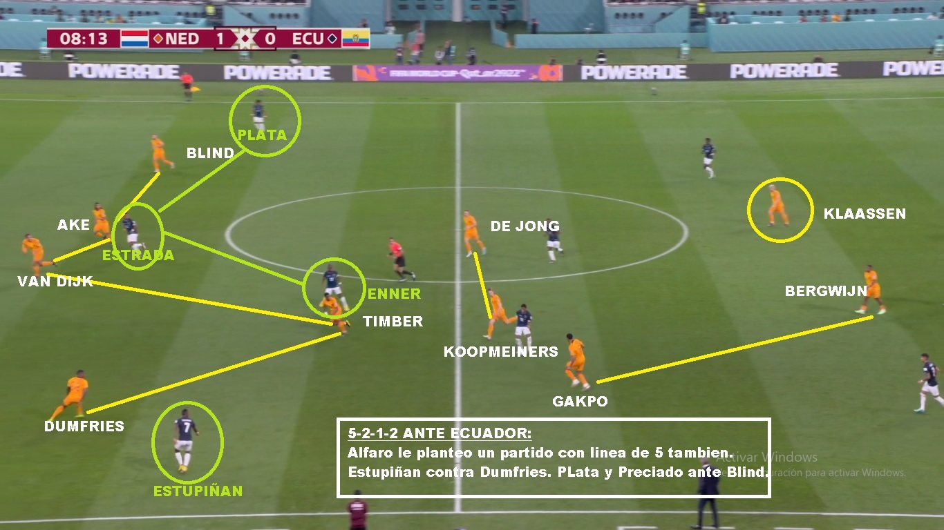 Paises Bajos con Ecuador. Mano a mano por las bandas. Dumfries con problemas con Estupiñan
