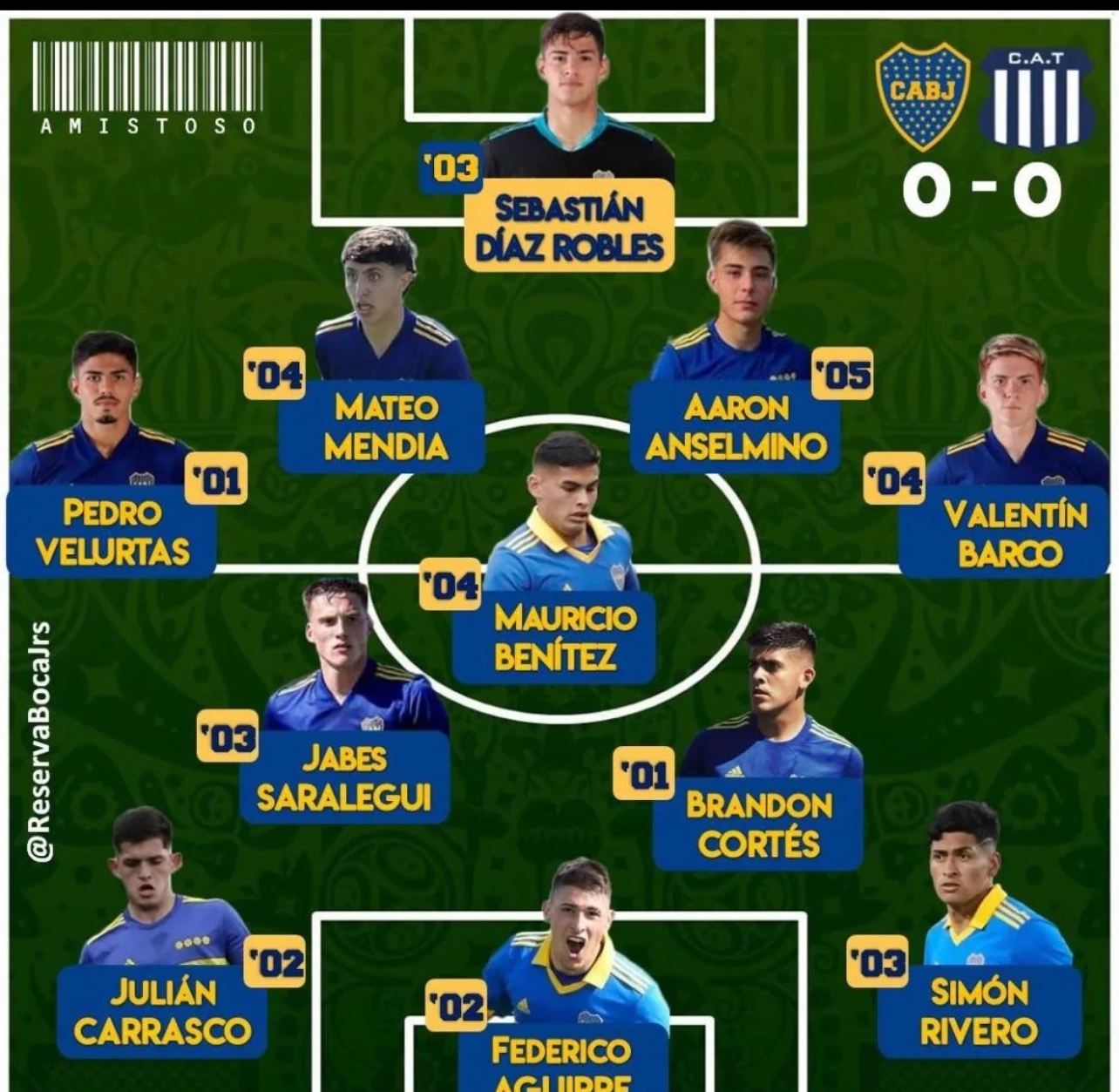 En el primer período, el Xeneize alistó con Sebastián Díaz Robles; Pedro Velurtas, Mateo Mendia, Aaron Anselmino, Valentin Barco; Jabes Saralegui, Mauricio Benítez, Brandon Cortés; Julián Carrasco, Federico Aguirre y Simón Rivero.