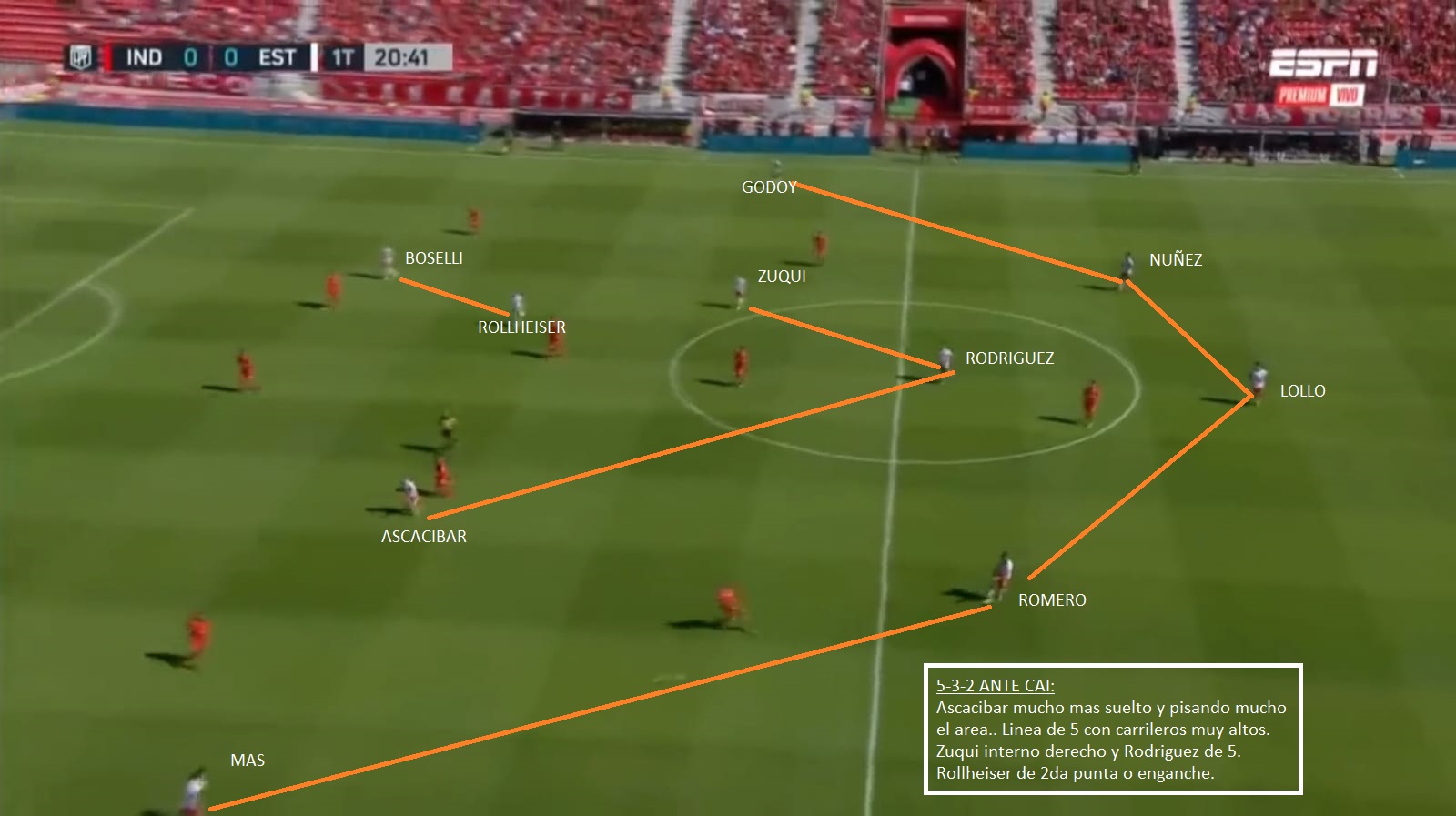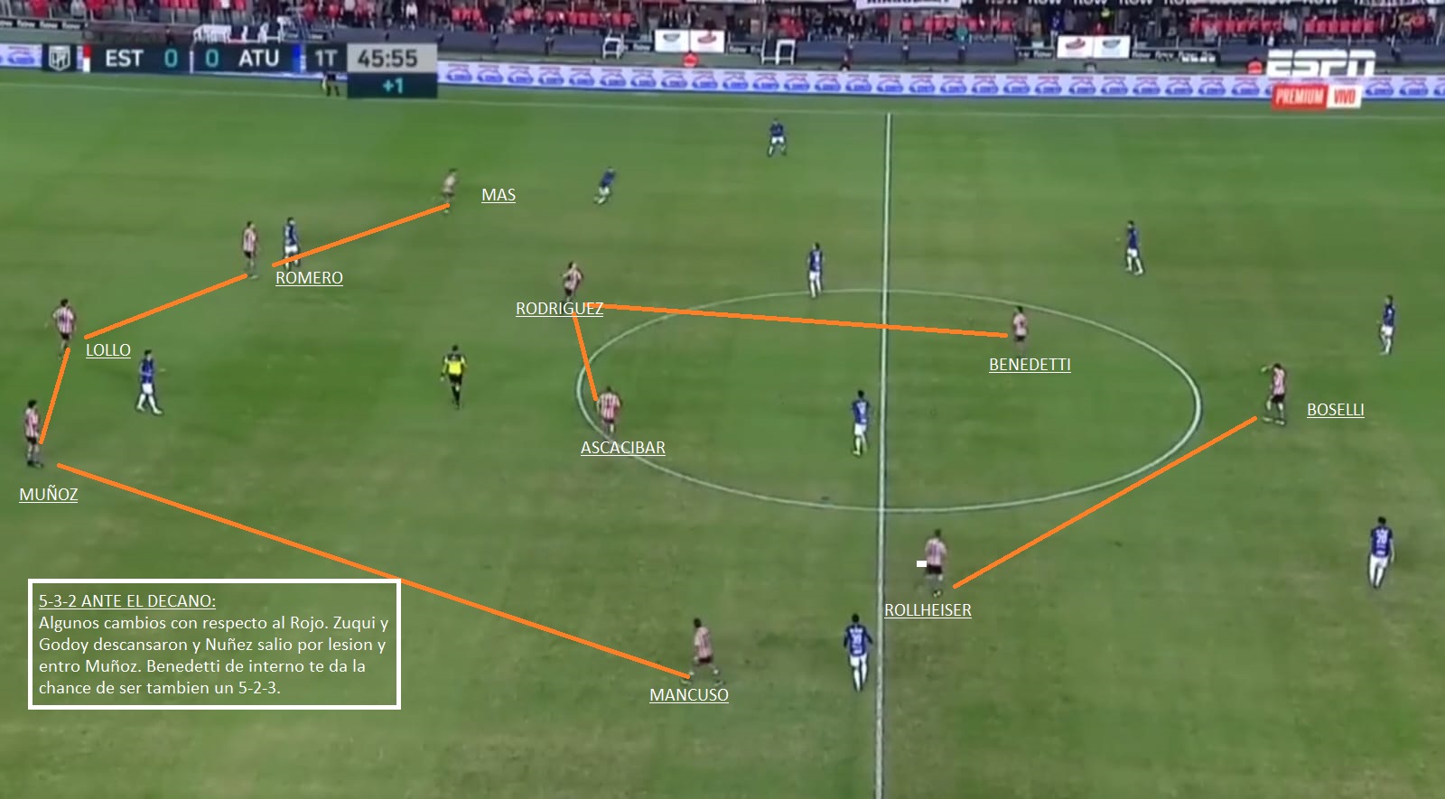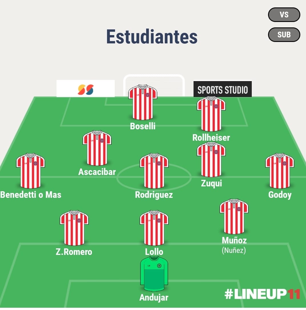 Ante el Decano descansaron Godoy y Zuqui, pero volverían. Luego solo quedan algunas dudas. El sistema seguiría siendo el mismo que utilizo desde que asumió: 5-3-2. Un probable: Andújar; Godoy, Muñoz (Núñez), Lollo, Romero, Benedetti o Mas; Zuqui, J. Rodriguez, Ascacibar; Rollheiser, Boselli. Ascacibar suele soltarse mucho más que Zuqui, para pisar el área, mientras que los carrileros son la amplitud del equipo. A diferencia de San Lorenzo el sistema es de 3 volantes y 2 puntas, y no de 2 volantes y 3 puntas. Las dudas entre Muñoz y Núñez son por un tema físico del segundo y la de Benedetti o Mas, es porque ambos han rotado los últimos partidos y no se sabe quién es el titular. Creo que Benedetti parte con alguna ventaja.