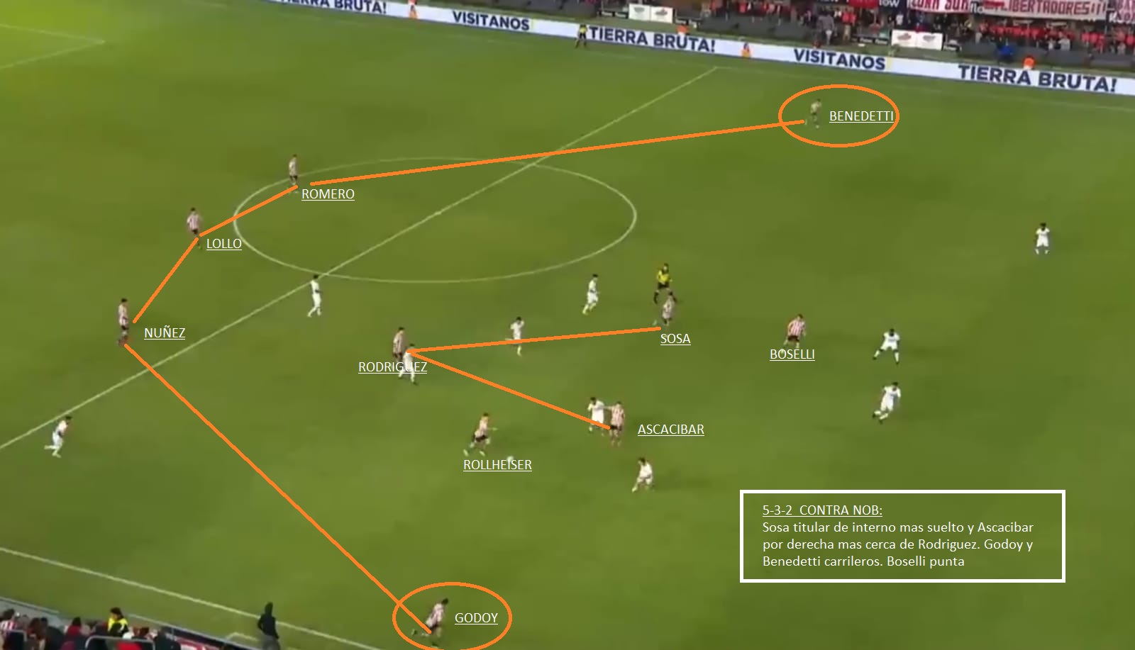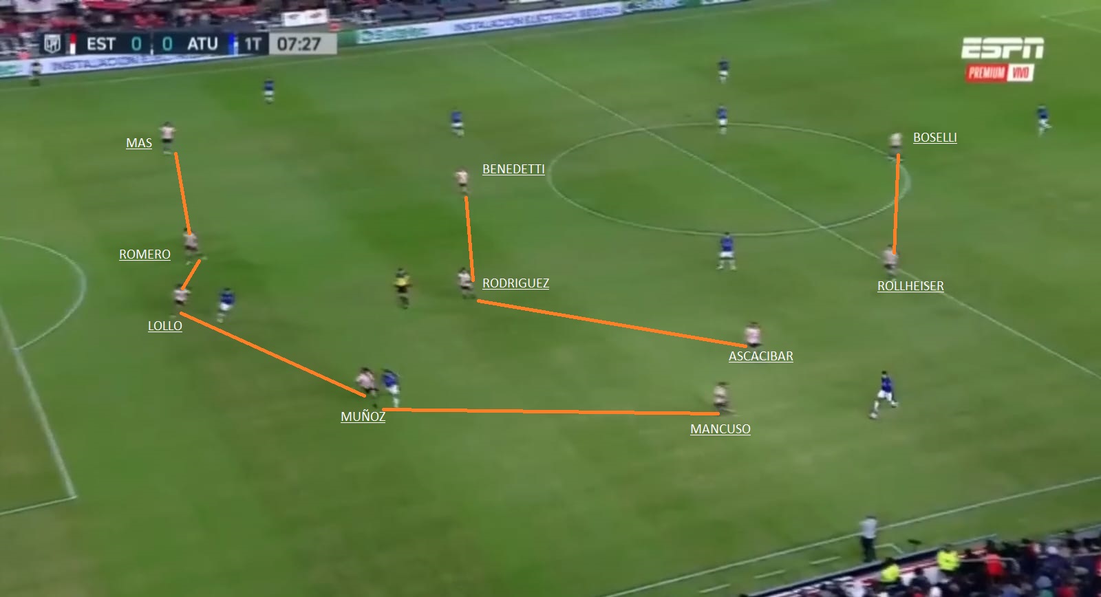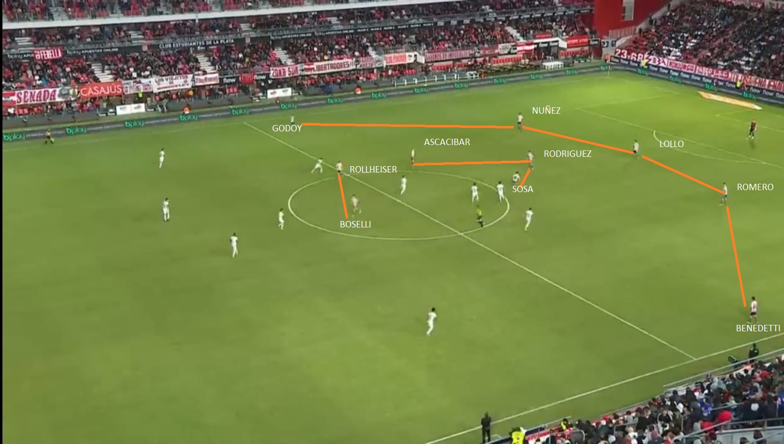 - Duelo por las bandas. ¿Godoy vs Barco y Benedetti vs Weigandt?. El Pincha ocupa todo el ancho de la cancha cuando tiene la pelota, con sus carrileros. Hay que ver cómo decide marcarlo Almirón. Ante San Lorenzo lo hizo con otra línea de 5, pero ahora saldrá con 4 atrás. Como Estudiantes solo juega con Boselli de punta y Rollheiser y Ascacibar acompañan, se puede acomodar mejor y poner lateral contra carrilero. Veremos como responde a eso Eduardo Domínguez. Rollheiser tirado a la derecha puede generar alguna complicación.