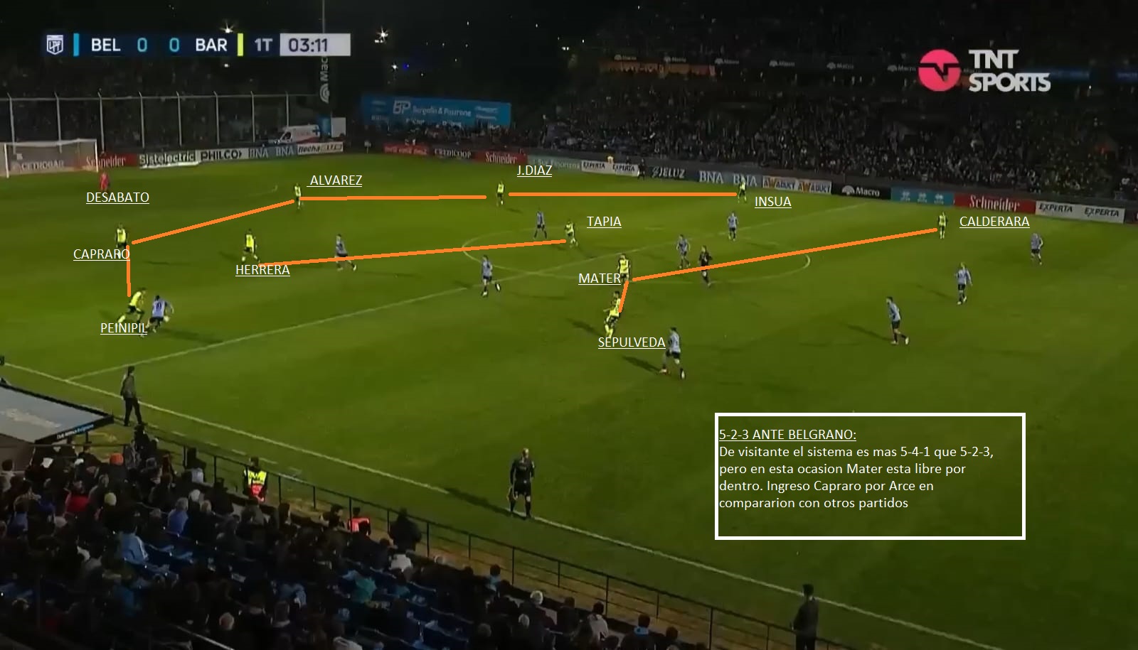 Viene cambiando el entrenador los últimos partidos de acuerdo a si juega de local o de visitante. Línea de 5 cuando juega fuera de casa y línea de 4 de local. En este caso es campo neutral, pero es ante Boca, por lo tanto veremos que elige. Ante Racing, River y Argentinos equipo más dominantes eligió la línea de 4. Ante Belgrano y Tigre de visitante eligió jugar con 5. En todo caso, la única duda sería Capraro o Arce. También veremos si vuelve a la titularidad Sepúlveda, que estuvo ausente lo últimos partidos. Probable formación (4-2-3-1): Desábato; Peinipil, Alvarez, J Díaz, Insua; Herrera, Arce; Mater, Tapia, Calderara; Sepúlveda o Domínguez. La otra opción es (5-4-1): Desábato; Peinipil, Capraro, Alvarez, Díaz, Insua; Mater, Herrera, Tapia, Calderara; Sepúlveda.