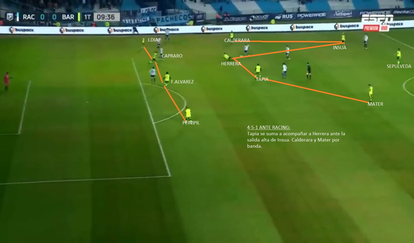 - Pelota parada. Sepúlveda o Domínguez, Álvarez, Díaz, Capraro, Arce, más la pegada de Insua o Tapia. Hay que cuidarse de no hacer muchas faltas ni darle opciones a Barracas en la pelota parada. Tampoco hay que olvidarse de la buena estrategia de Rondina para este tipo de jugadas. Racing ya lo sufrió en este torneo.