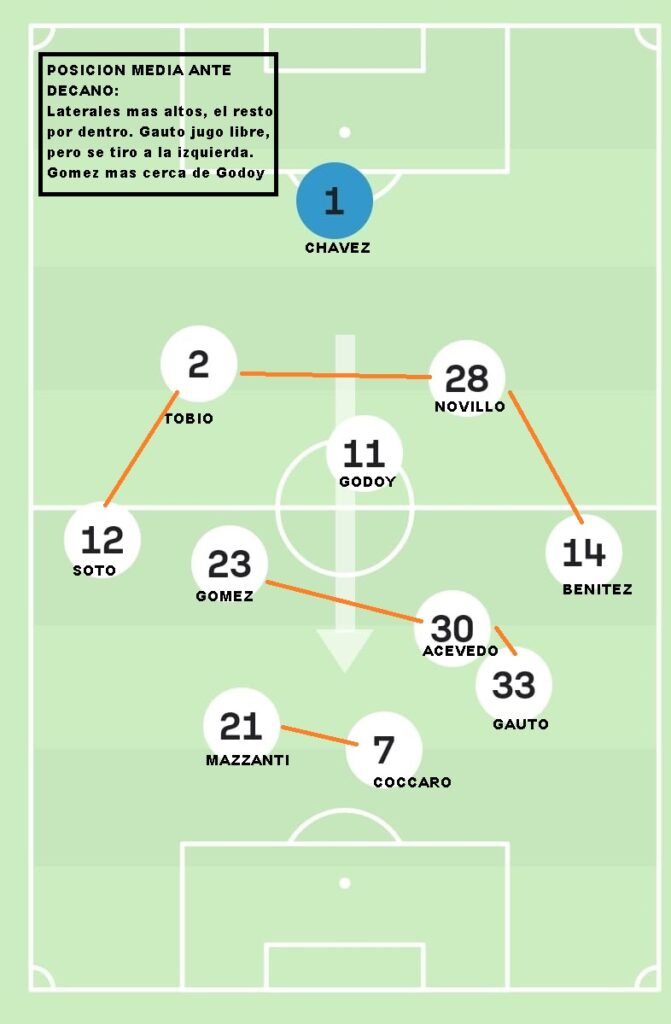 En el debut el entrenador apostó por un 4-3-1-2, pero seguramente seguirá cambiando. Debería volver Hezze, luego de las 5 amarillas por Gómez o Acevedo. Veremos si repite varios de los nombres, tanto en defensa como en ataque. También hay que ver si Juan Gauto sigue jugando como enlace o juega más por izquierda donde está más cómodo. Un probable: Chaves; Soto, Tokio, Novillo, Benítez; Hezze, Godoy, Gómez o Acevedo; Mazzanti, Coccaro, Gauto. Imagino un 4-3-1-2, pero al no estar Acevedo, quizás Gauto juegue por izquierda.