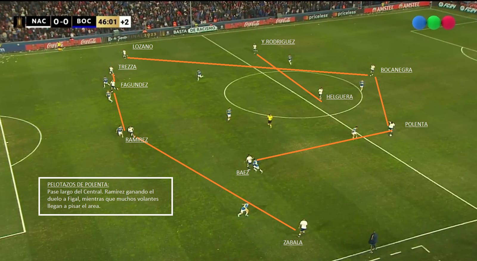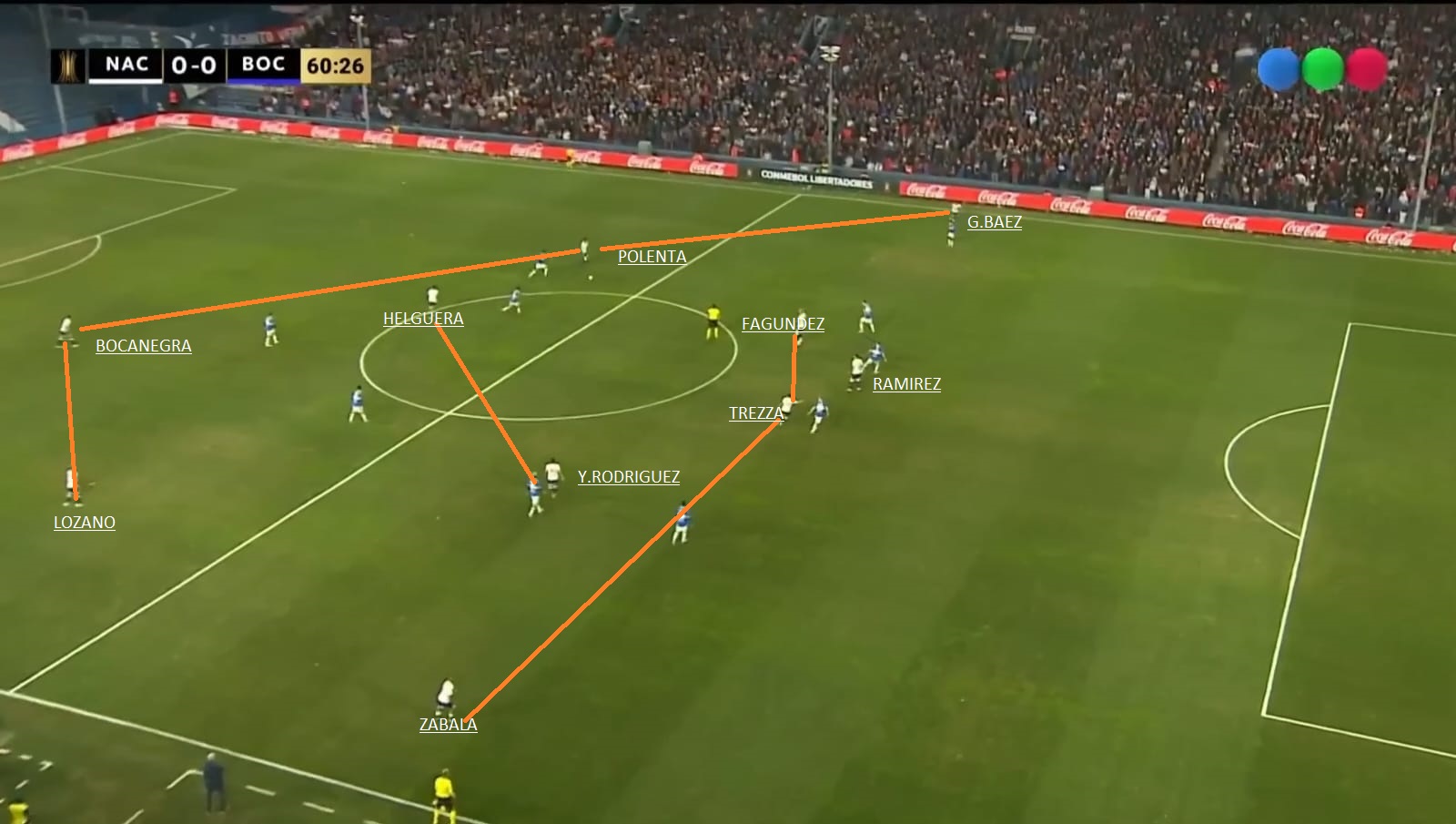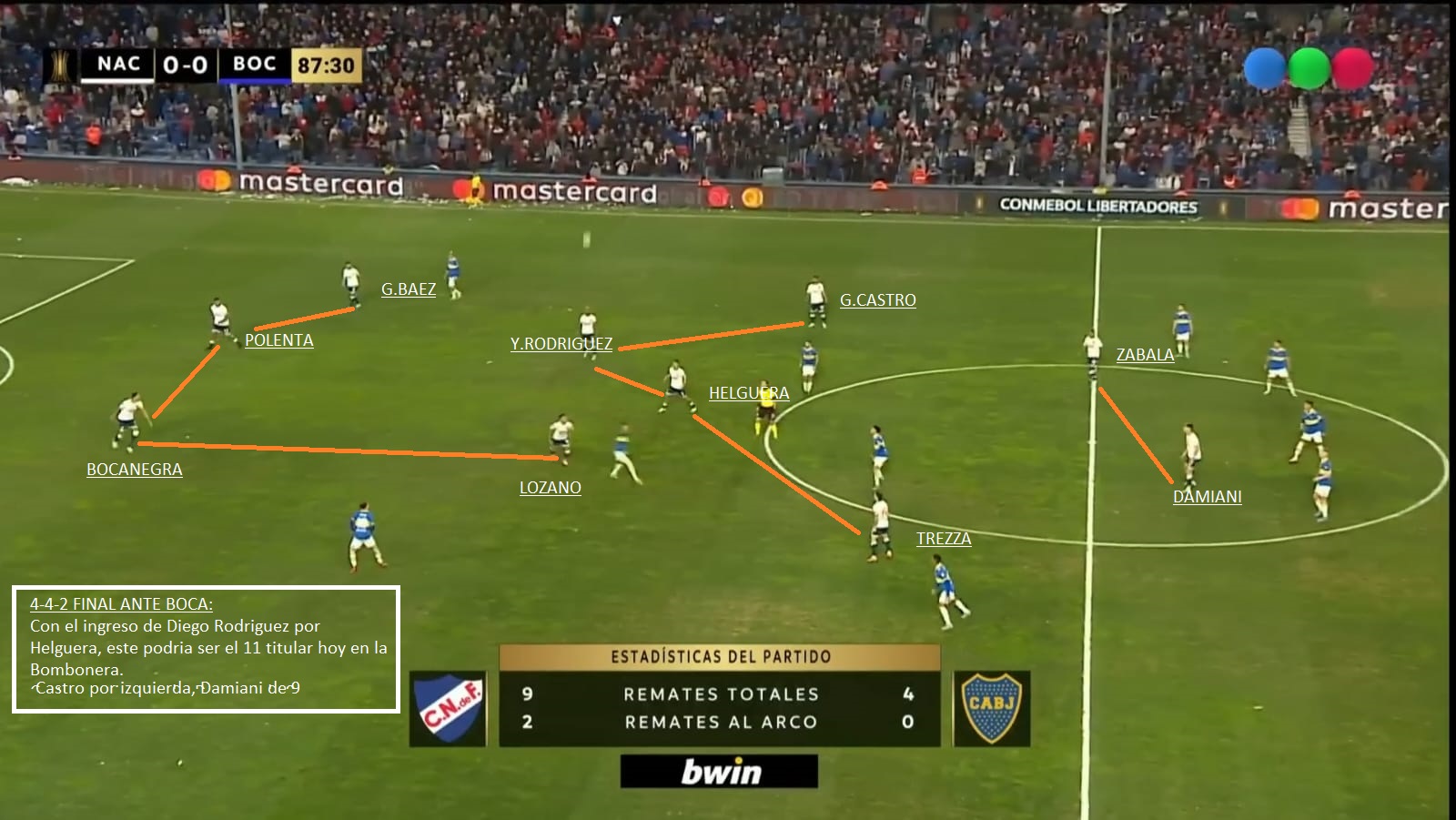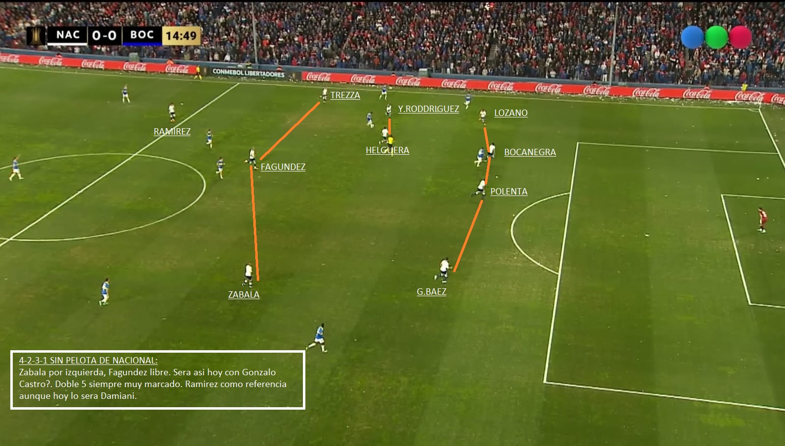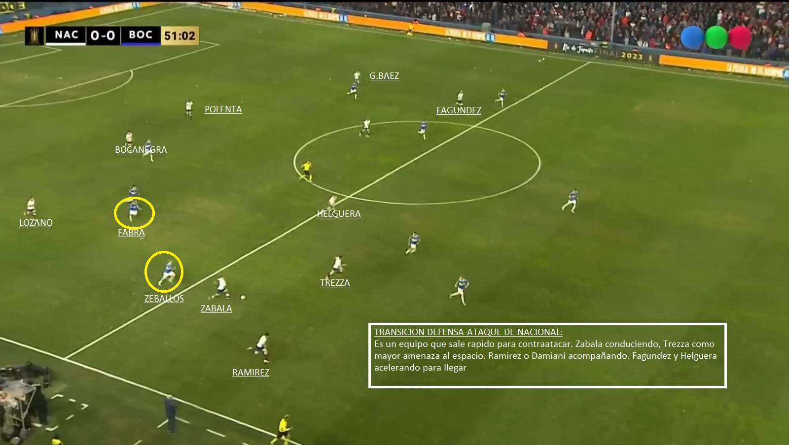 - Transición de defensa-Ataque de Nacional: Quizás en partidos de visitante es el mayor peligro que tiene Nacional. Zabala, Trezza son rápidos en transición, Damiani pelea mucho la segunda jugada y entre Polenta y Chory Castro pueden meter muy buenos pases al espacio. A tener cuidado y estar atentos en defensa. En el partido de Ida, 2 o 3 veces Boca quedo mal posicionado.