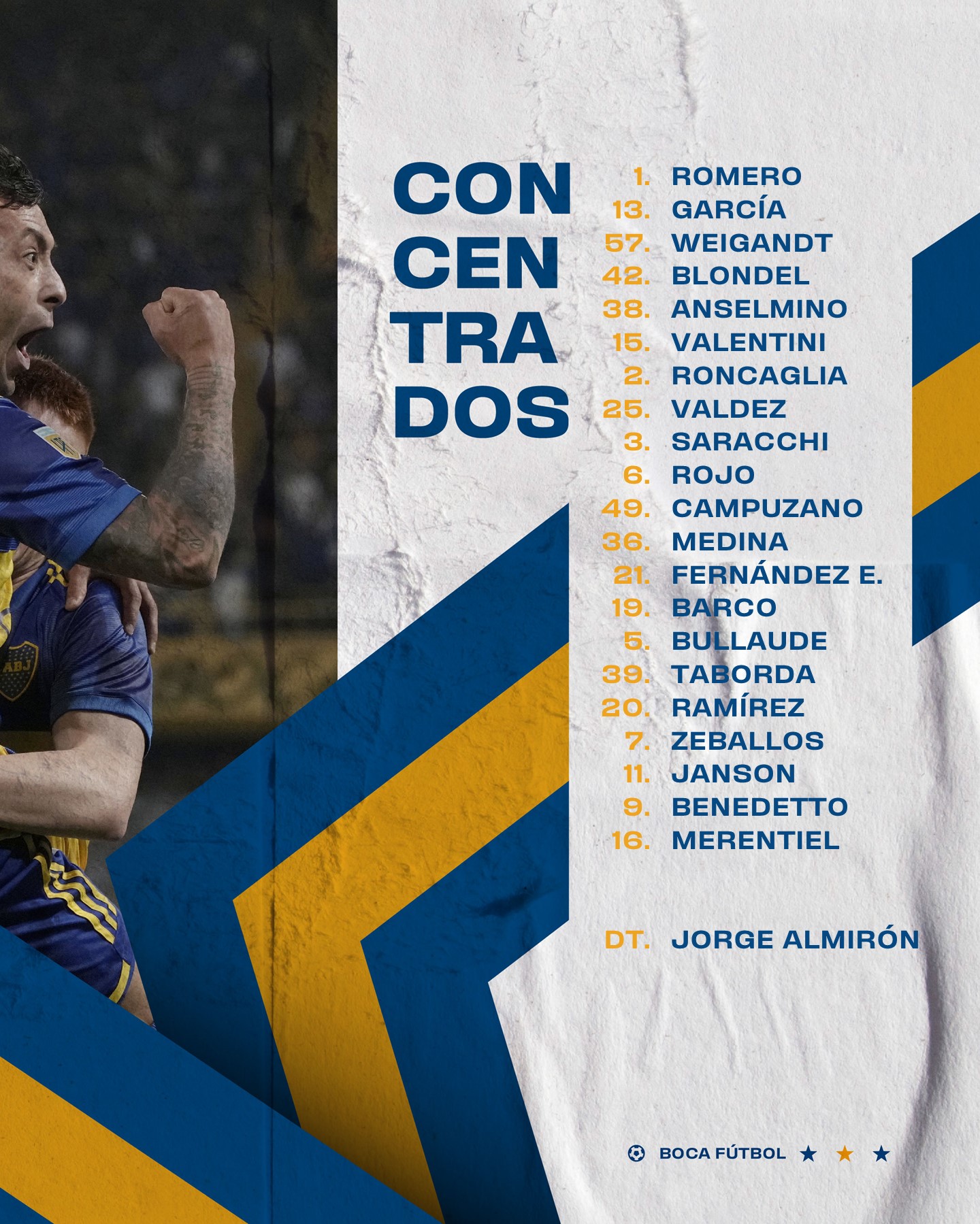 La alineación fue la siguiente: Javier García; Lucas Blondel, Bruno Valdez, Nicolás Valentini y Marcelo Saracchi; Cristian Medina, Jorman Campuzano, Ezequiel Fernández y Valentín Barco; Darío Benedetto y Miguel Merentiel. Esos fueron los jugadores que Almirón probó en la práctica.