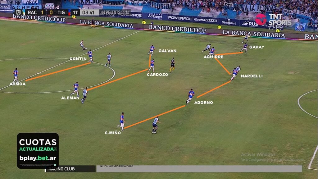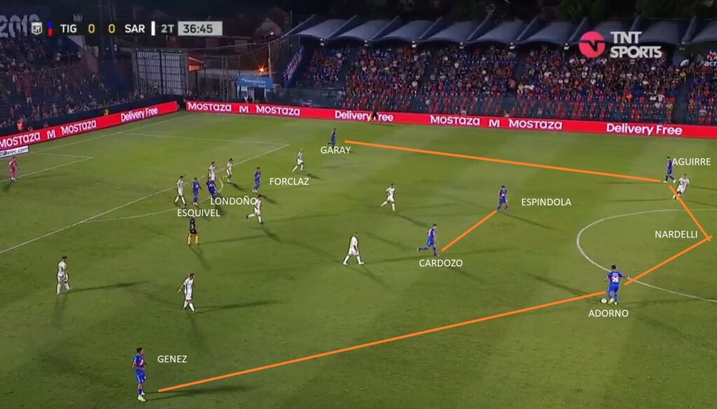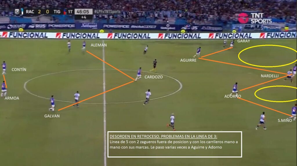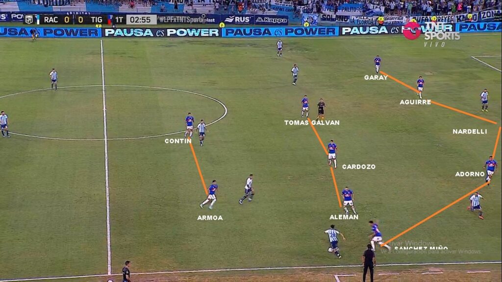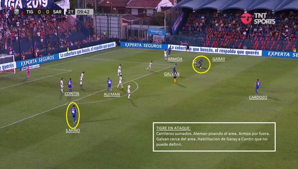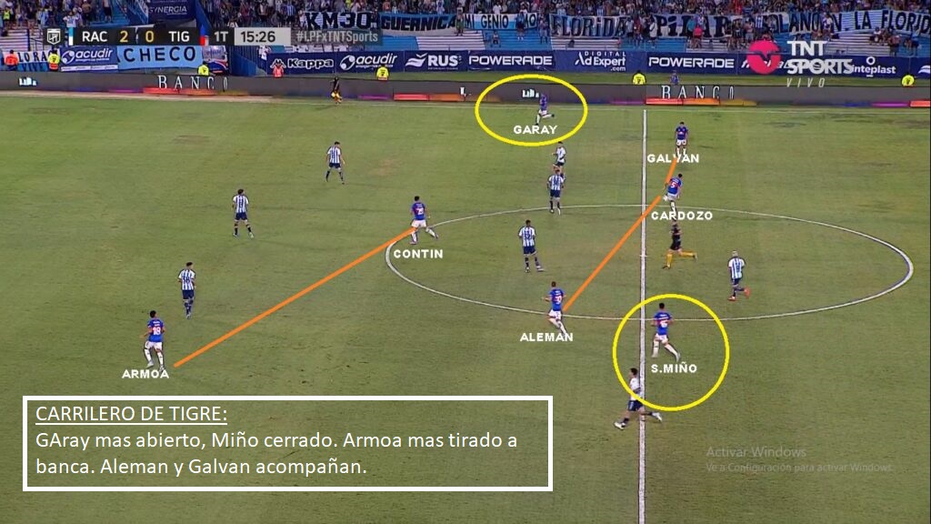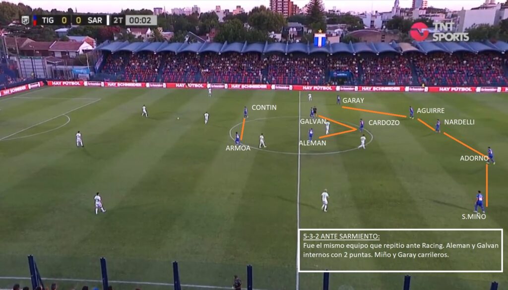 Por ahora se ha visto un Tigre pobre. Se está armando. Le pegada de Aleman, alguna corrida de Armoa, alguna aparición de sus carrileros Sánchez Miño y Garay y la regularidad de Cardozo y Nardelli en el centro de la defensa. Le falta de todo. Ante Sarmiento en general dominó un poco más el desarrollo, pero las más claras fueron para el Verde ( Un gol errado con el arco libre de Morales, un cabezazo muy claro de Mauri) y ante Racing fue superado en todo momento. El ingreso de Gho en Sarmiento y las corridas de Solari en Racing demostraron algunas debilidades a la espalda de Sánchez Miño y en la ayuda del paraguayo Adorno. Galvan y Contin aún no han funcionado. Tagliamonte ha sacado pelotas muy buenas, pero siempre deja el margen para cometer algún error. Es un 5-3-2 muy marcado, en donde Garay el carrilero derecho va mucho más por fuera, que Sánchez Miño. El Ex Boca siempre se siente más cómodo centralizandose más, pero claro en un 5-3-2 se necesita que vaya por fuera. Ahí es donde suele aparecer Armoa. Alemán suele jugar libre, parte por izquierda, pero puede aparecer por derecha o de enganche. El sistema le da esa libertad. Es un equipo al cual le falta trabajo y eso se nota en la línea de 3/5 que muchas veces queda descompensada.
