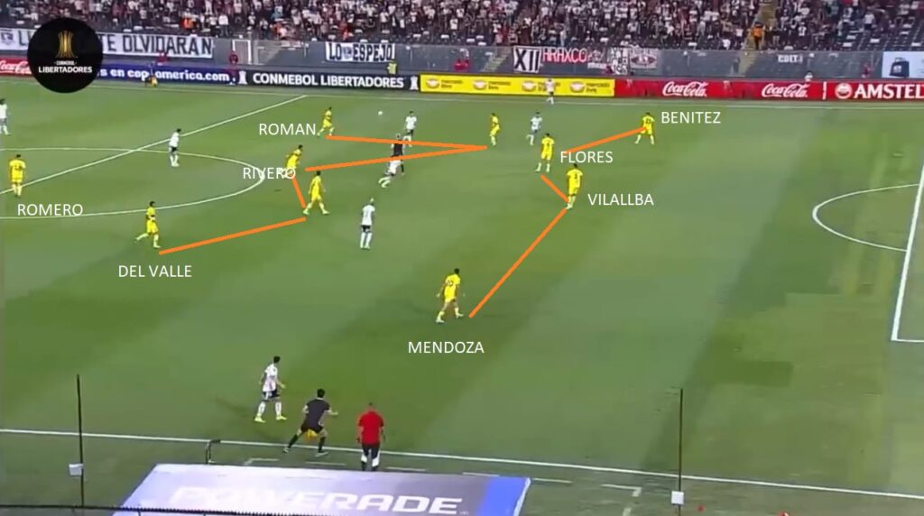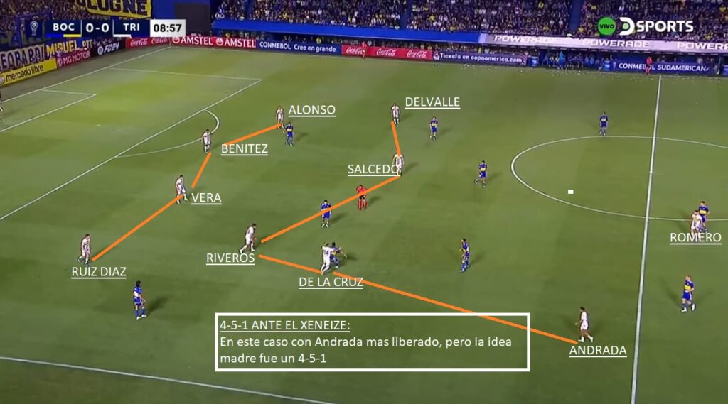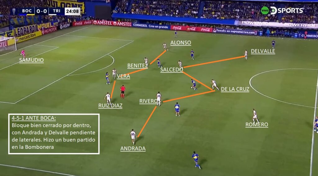 Trinidense, como hizo en la Bombonera, buscará cerrarse atrás, achicar espacios en un bloque bajo, sin pelota. No hay dudas de eso. Buscará lastimar con algunos contraataques y también con alguna pelota parada. El juego aéreo es uno de sus fuertes y buscará lastimar así. En lo defensivo mas allá de cerrarse bien atrás, suelen aparecer los espacios. Marcos Rivero el 5, tiende a saltar a presionar y muchas veces deja su zona libre. Quizás con la presencia de Jorge Jara corrigen eso. Incluso en partidos en donde juega de 5 solo, puede quedar delante de la línea de los 2 internos. Es un equipo con muy malos resultados en el 2024, pero que sin embargo en sus duelos contra El Nacional en Quito, ante Colo Colo, ante Fortaleza o incluso ante Boca pudo demostrar que te puede competir. Como medida de lo que podemos ver hoy tendríamos que tomar como referencia el partido con Colo Colo y el de Fortaleza jugando de local. Ante el equipo de Almirón tuvo solo un 20% de posesión y atacó poco, pero fue efectivo. Ante Fortaleza por momentos intentó ser protagonista. El equipo de Vojvoda le llegó bastante en el 1er tiempo y incluso mereció hacerle algún gol mas que el 1 a 0. En el 2do si fue más el equipo paraguayo pero le falto puntería. Ante el Xeneize imagino un encuentro más parecido en cuanto a posesión al que fue con Colo Colo. Boca tendrá la iniciativa y el Tri apelara a ataques rápidos, aprovechar errores Xeneizes y la pelota parada.